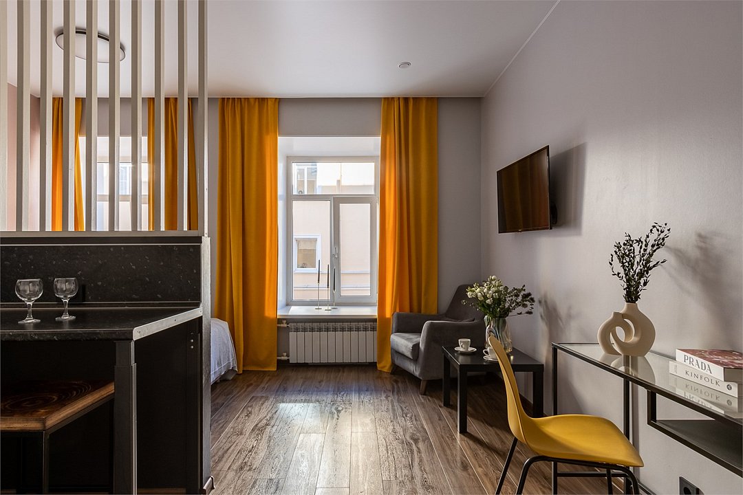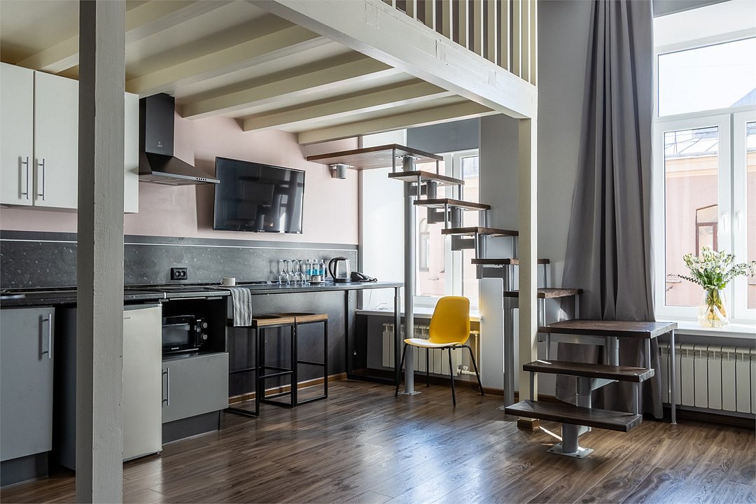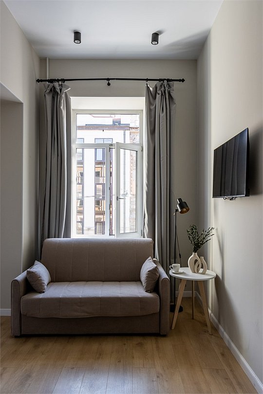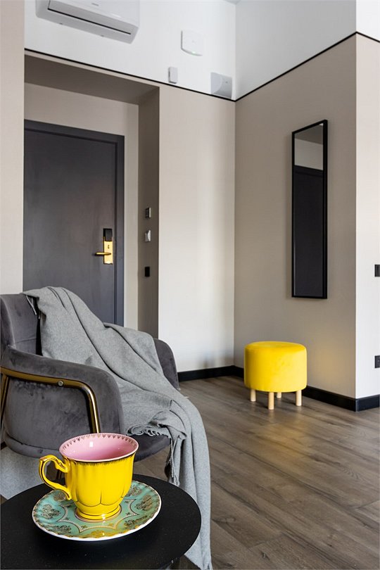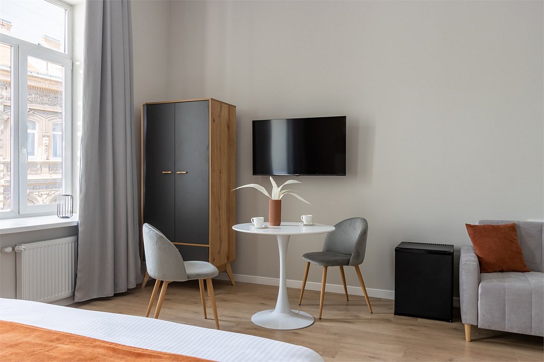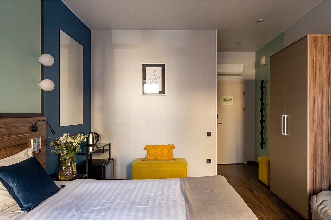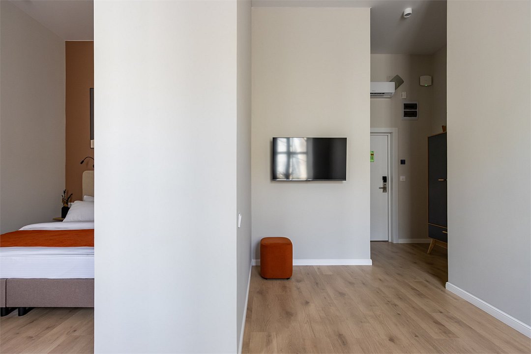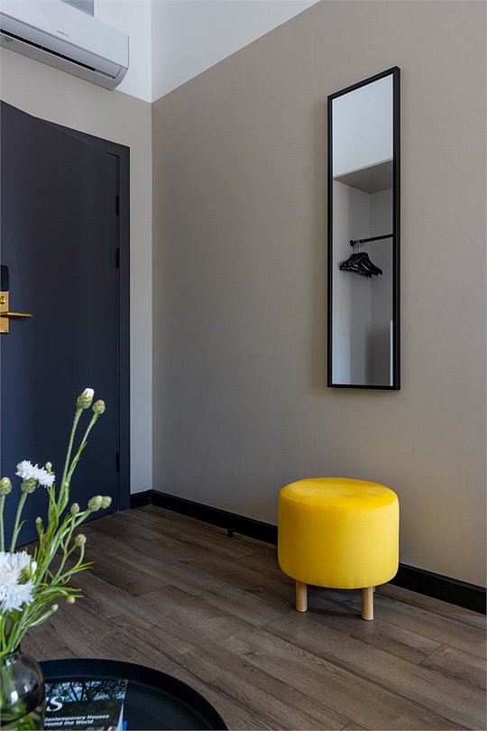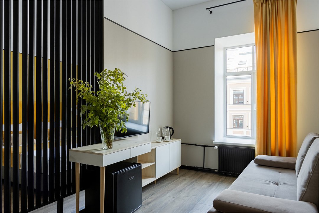 Звукоизолированный номер-студио с мини-кухней и кондиционером. В собственной ванной комнате: • Душ • Фен • Бесплатные туалетно-косметические принадлежности • Тапочки • Полотенца Вид: • Вид на город • Вид во внутренний дворик Удобства апартаментов: • Мини-кухня • Холодильник • Плита • Микроволновая печь • Кухонные принадлежности • Кондиционер • Телефон • Отопление • Деревянный или паркетный пол • Звукоизоляция • Услуга «звонок-будильник» • Москитная сетка • Шкаф или гардероб • Белье • Лестница для доступа к верхним этажам • Вешалка для одежды Бесплатный Wi-Fi! Курение: запрещеноУслуги и удобства