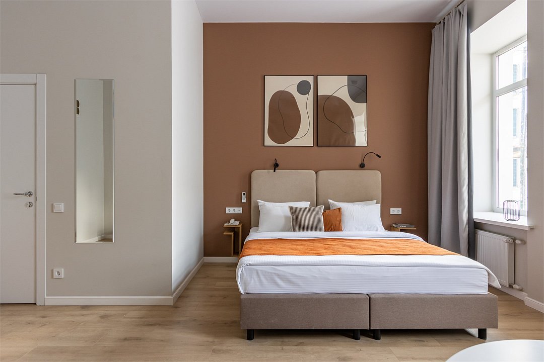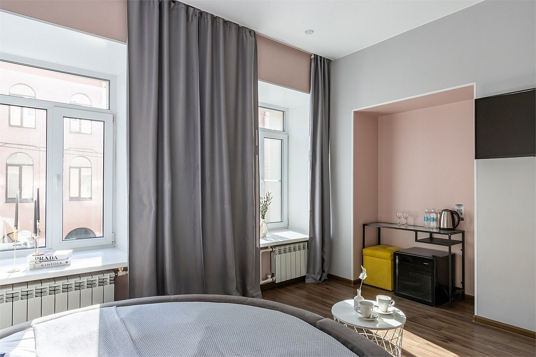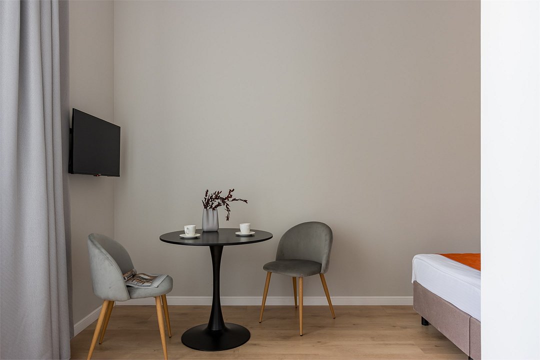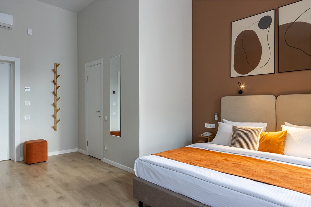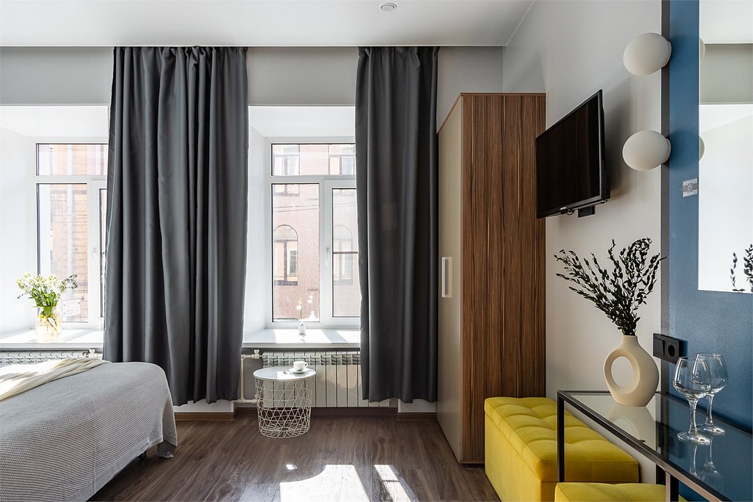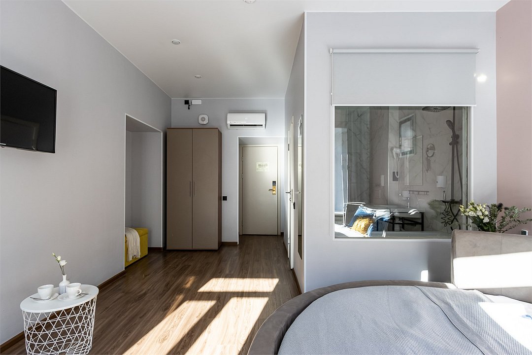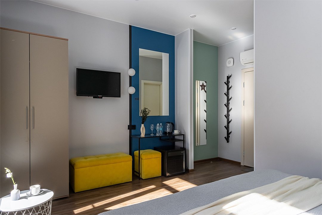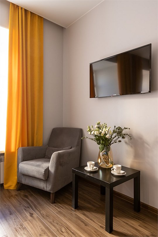 Звукоизолированный номер-студио с мини-кухней и кондиционером. В собственной ванной комнате: • Душ • Фен • Бесплатные туалетно-косметические принадлежности • Тапочки • Полотенца Вид: • Вид на город • Вид во внутренний дворик Удобства апартаментов: • Мини-кухня • Холодильник • Плита • Микроволновая печь • Кухонные принадлежности • Кондиционер • Телефон • Отопление • Деревянный или паркетный пол • Звукоизоляция • Услуга «звонок-будильник» • Москитная сетка • Шкаф или гардероб • Белье • Лестница для доступа к верхним этажам • Вешалка для одежды Бесплатный Wi-Fi! Курение: запрещеноУслуги и удобства