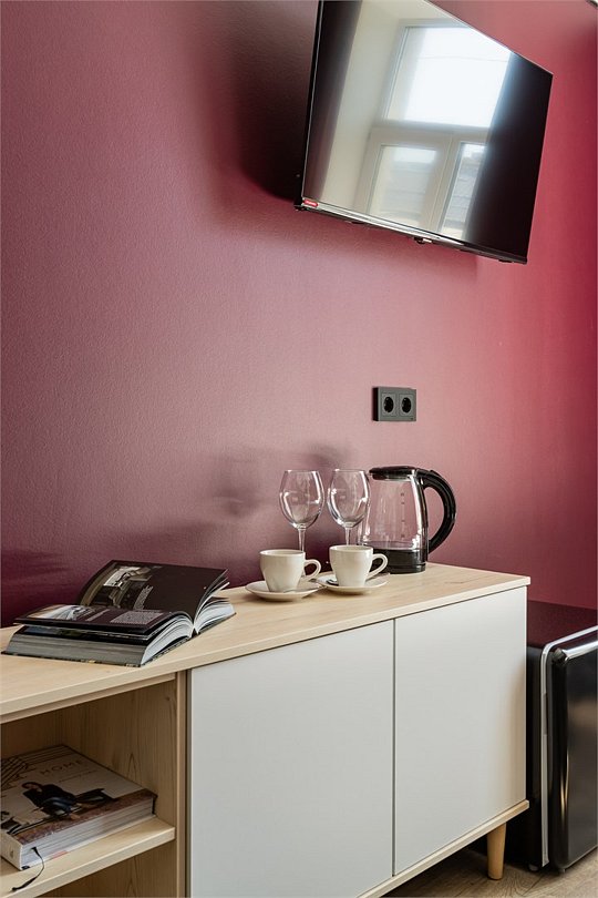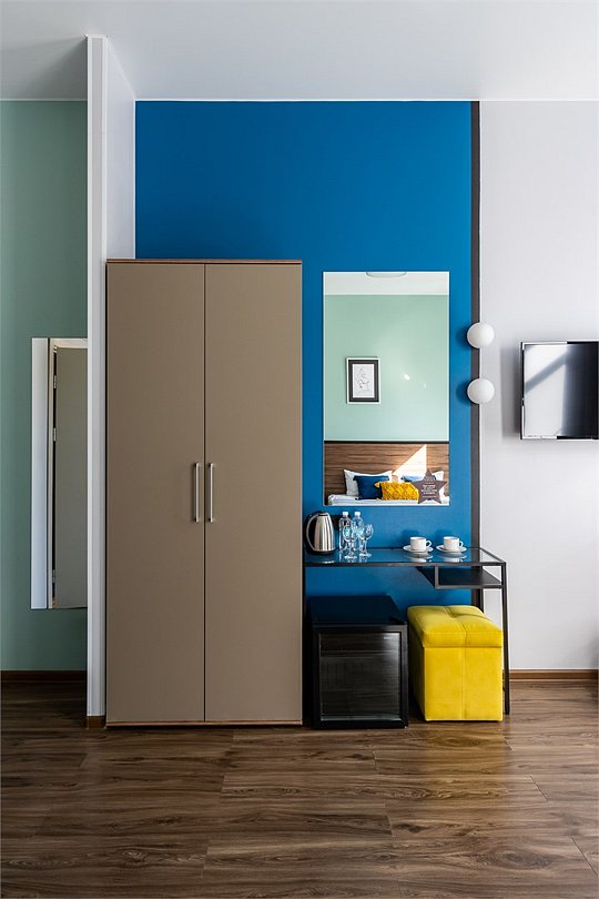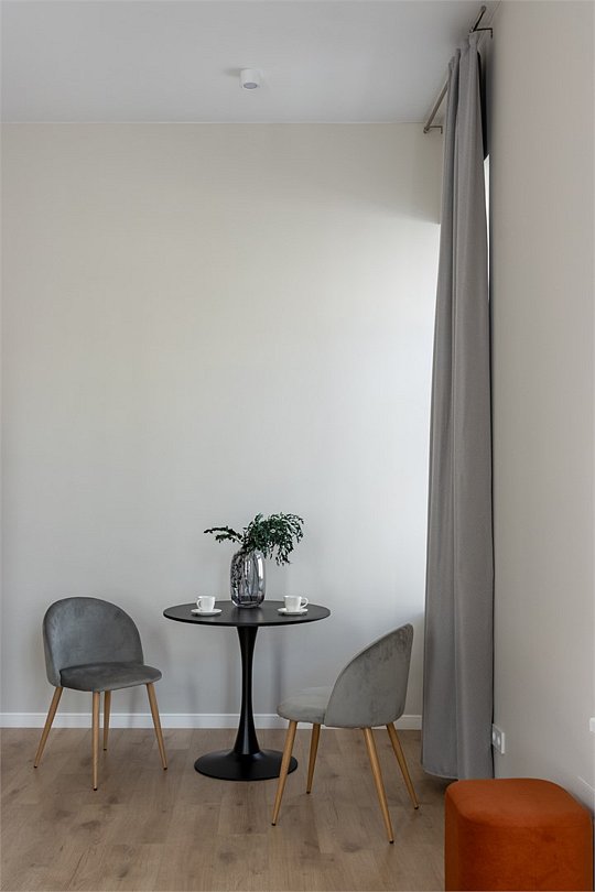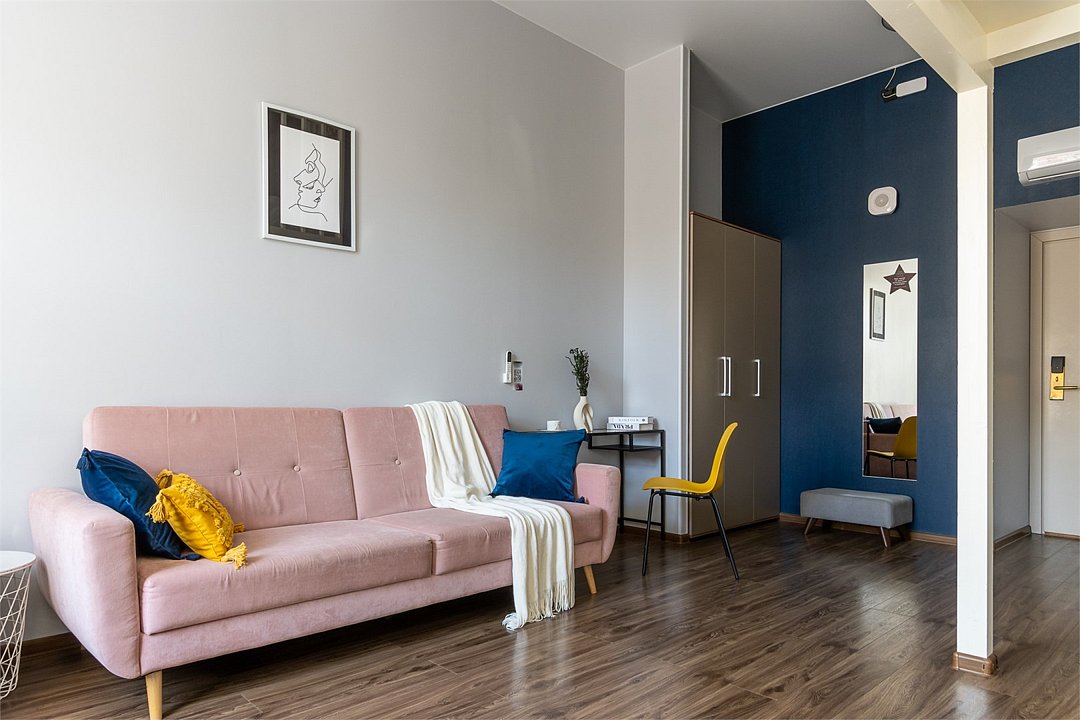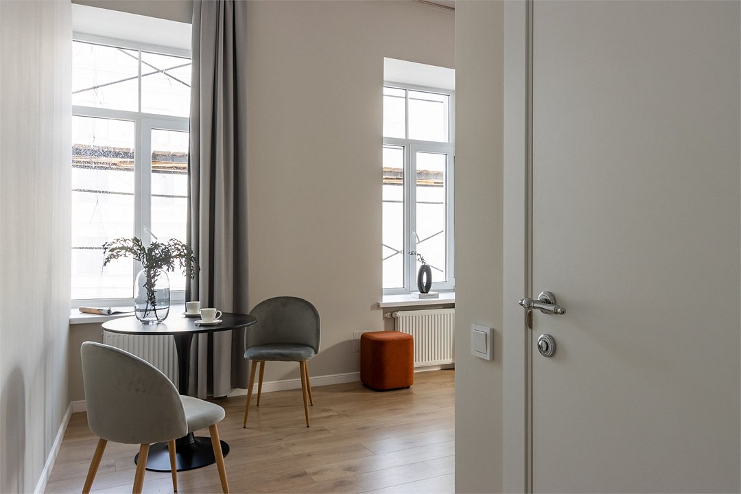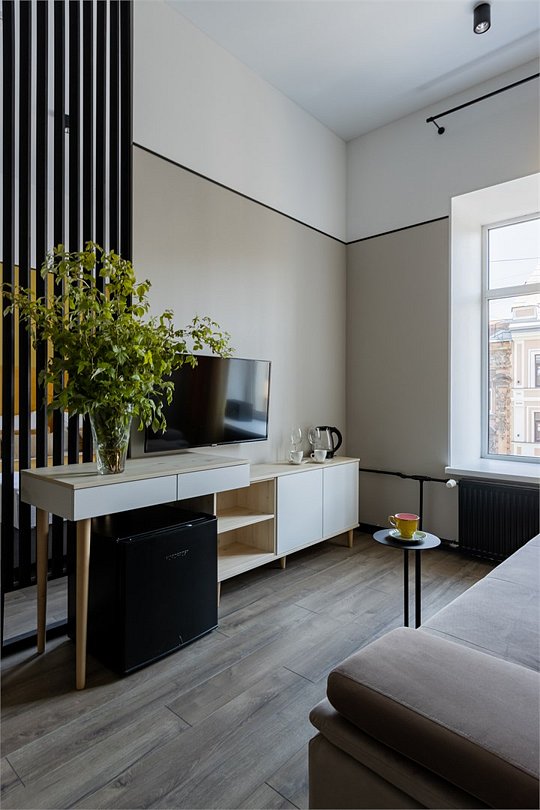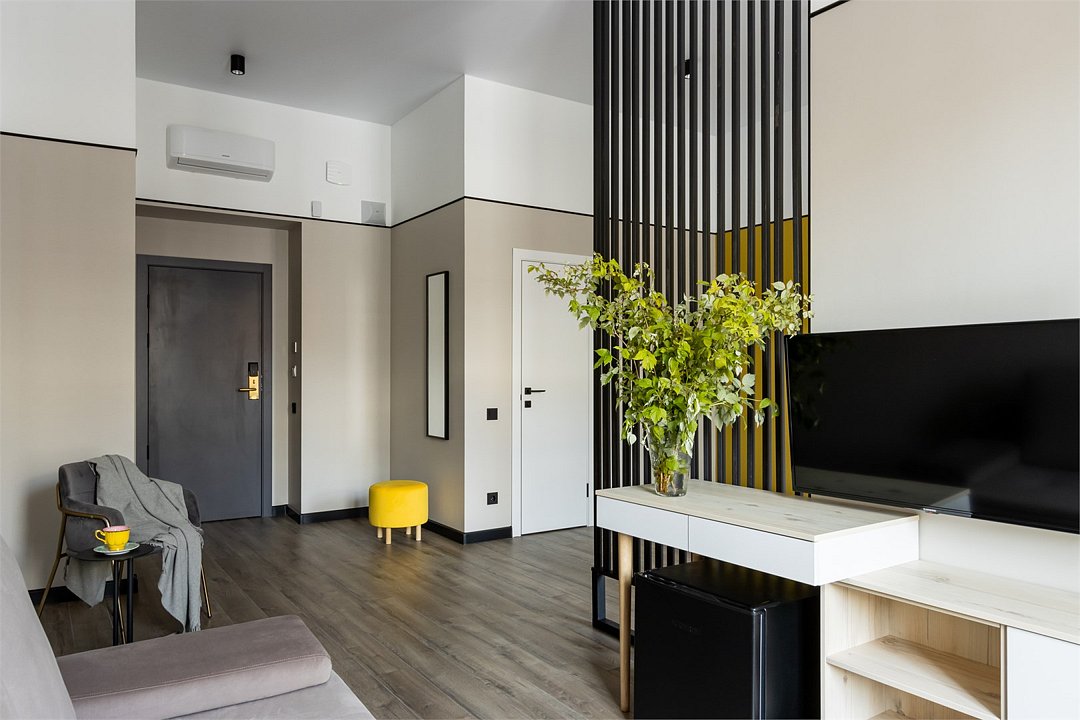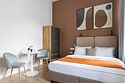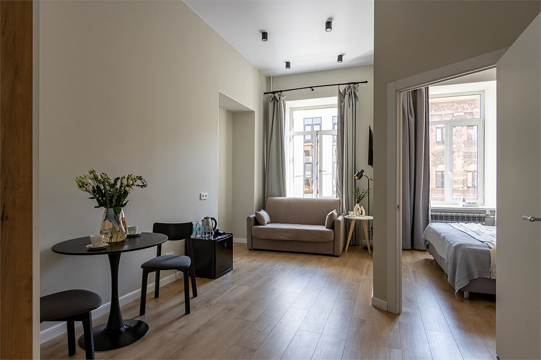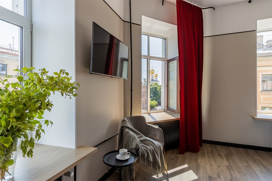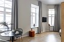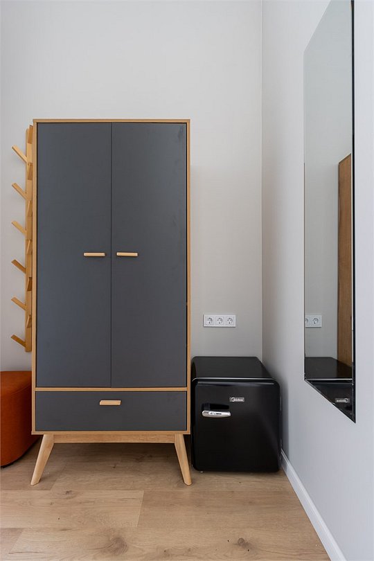 Звукоизолированный номер-студио с мини-кухней и кондиционером. В собственной ванной комнате: • Душ • Фен • Бесплатные туалетно-косметические принадлежности • Тапочки • Полотенца Вид: • Вид на город • Вид во внутренний дворик Удобства апартаментов: • Мини-кухня • Холодильник • Плита • Микроволновая печь • Кухонные принадлежности • Кондиционер • Телефон • Отопление • Деревянный или паркетный пол • Звукоизоляция • Услуга «звонок-будильник» • Москитная сетка • Шкаф или гардероб • Белье • Лестница для доступа к верхним этажам • Вешалка для одежды Бесплатный Wi-Fi! Курение: запрещеноУслуги и удобства