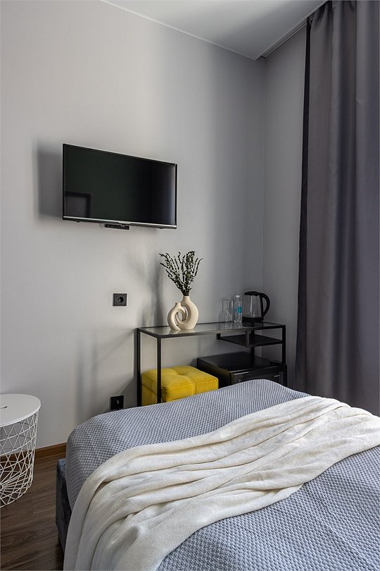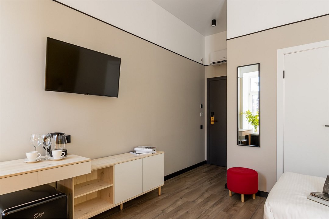 Звукоизолированный одноместный номер с телевизором с плоским экраном. В собственной ванной комнате: • Душ • Фен • Бесплатные туалетно-косметические принадлежности • Тапочки • Полотенца Вид: • Вид на город Удобства номера: • Холодильник • Кондиционер • Телефон • Отопление • Деревянный или паркетный пол • Звукоизоляция • Услуга «звонок-будильник» • Москитная сетка • Шкаф или гардероб • Белье • Лестница для доступа к верхним этажам • Вешалка для одежды Бесплатный Wi-Fi! Курение: запрещеноУслуги и удобства