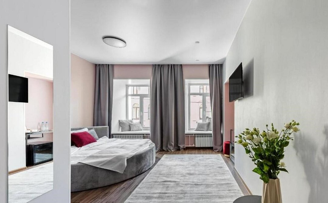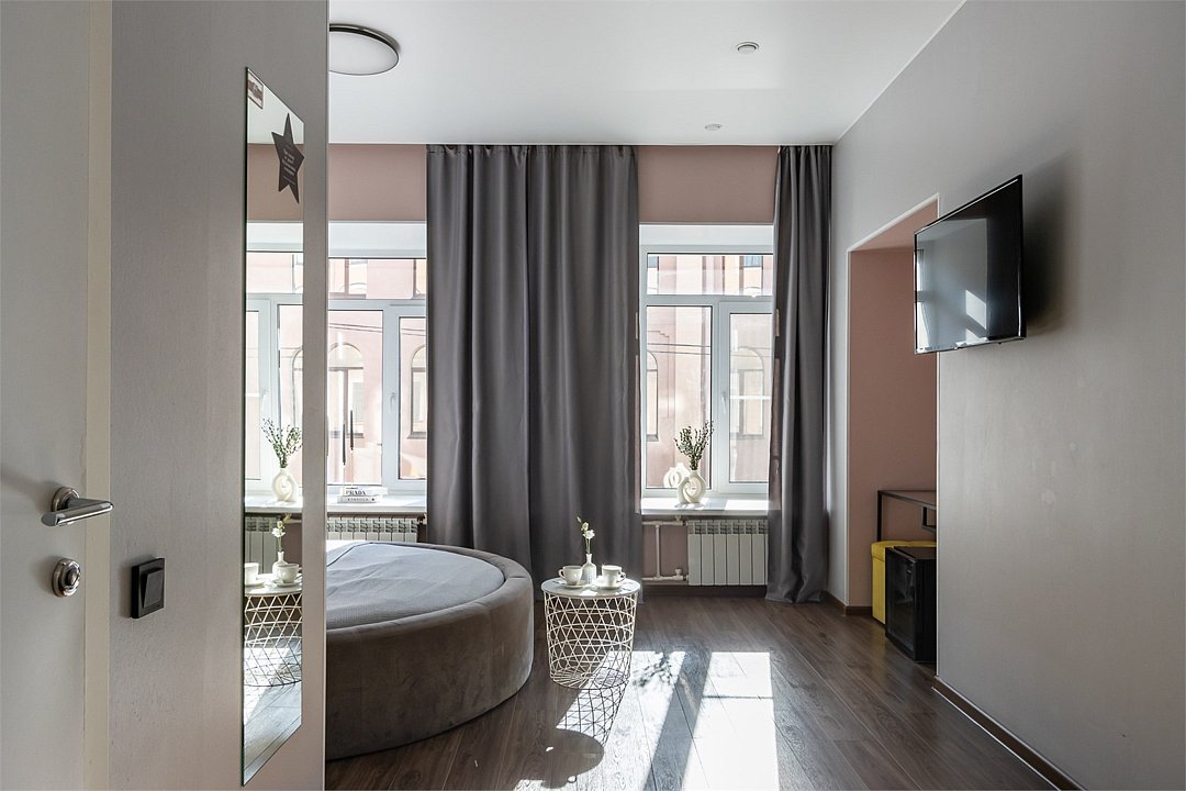 Особенность - круглая кровать в номере. В собственной ванной комнате: • Душ • Фен • Бесплатные туалетно-косметические принадлежности • Тапочки • Полотенца Вид: • Вид на город Услуги и удобства номера: • Холодильник • Кондиционер • Телефон • Отопление • Деревянный или паркетный пол • Звукоизоляция • Услуга «звонок-будильник» • Москитная сетка • Шкаф или гардероб • Белье • Лестница для доступа к верхним этажам • Вешалка для одежды Бесплатный Wi-Fi! Курение: запрещеноУслуги и удобства