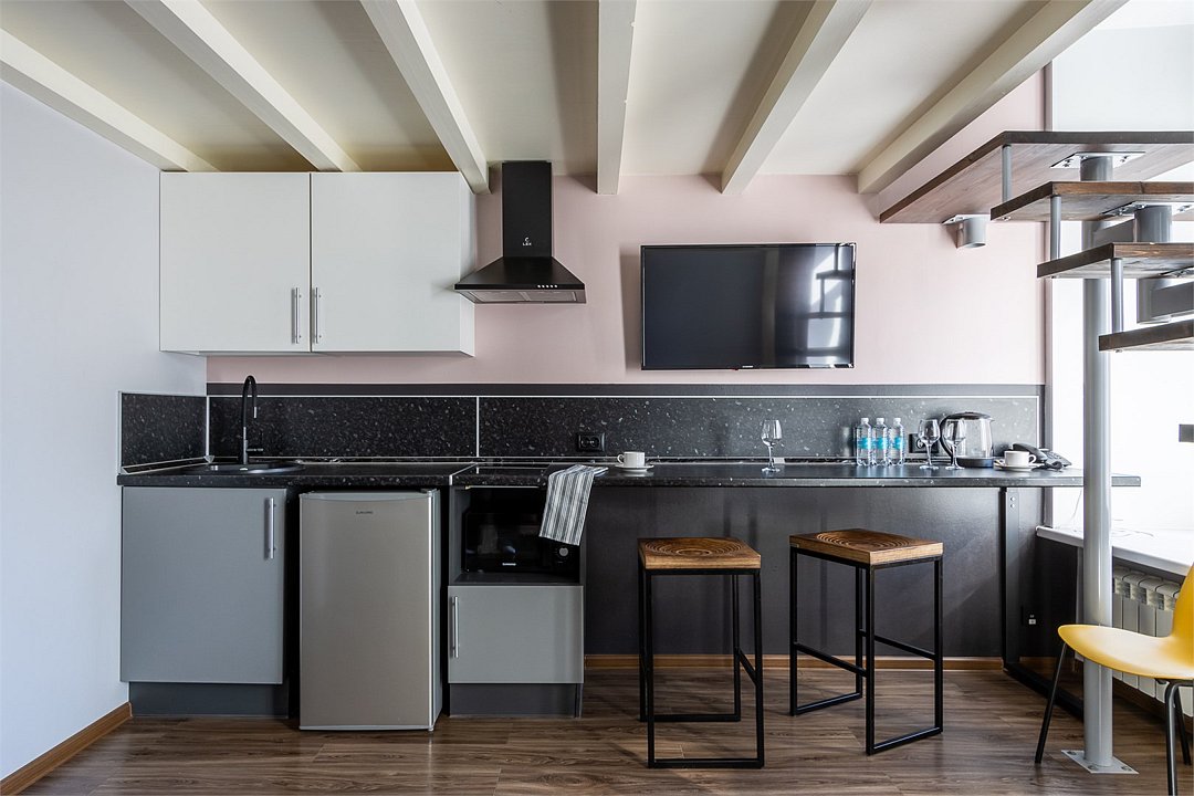 Двухкомнатный номер с мини-кухней и кондиционером. В собственной ванной комнате: • Душ • Фен • Бесплатные туалетно-косметические принадлежности • Тапочки • Полотенца Вид: • Вид на город Удобства апартаментов: • Мини-кухня • Холодильник • Плита • Микроволновая печь • Кухонные принадлежности • Кондиционер • Телефон • Отопление • Деревянный или паркетный пол • Звукоизоляция • Услуга «звонок-будильник» • Москитная сетка • Шкаф или гардероб • Белье • Лестница для доступа к верхним этажам • Вешалка для одежды Бесплатный Wi-Fi! Курение: запрещеноУслуги и удобства