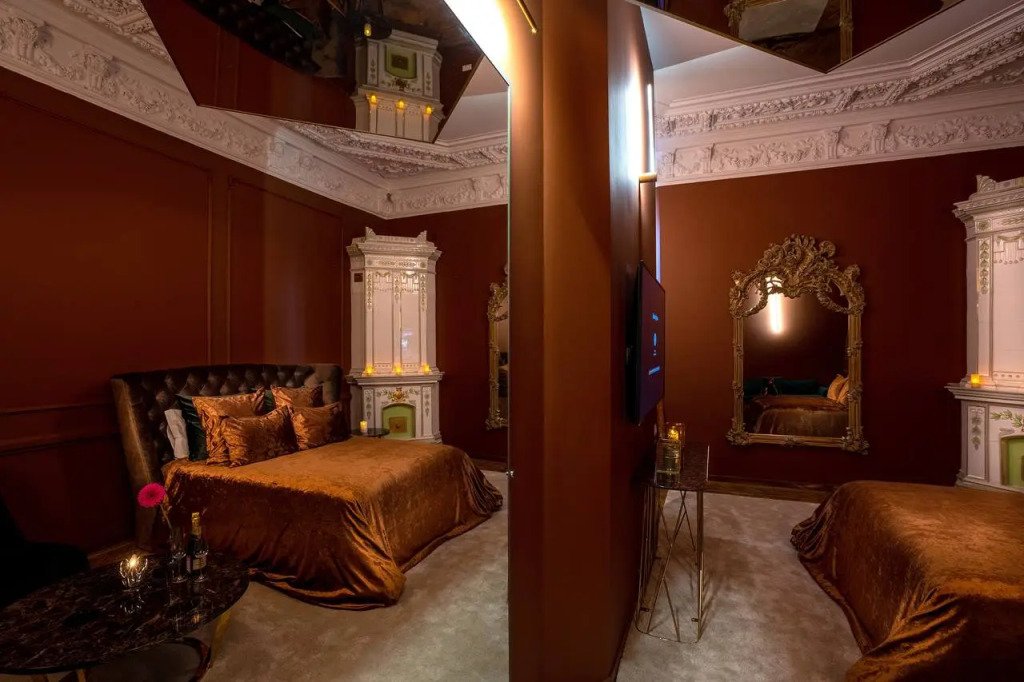 Тематические номера с огромными зеркалами на стенах и на потолках. Каждая комната задает особое настроение и новую тональность, укутывая гостей неописуемыми ощущениями.