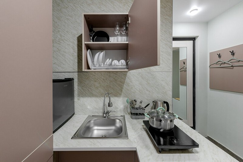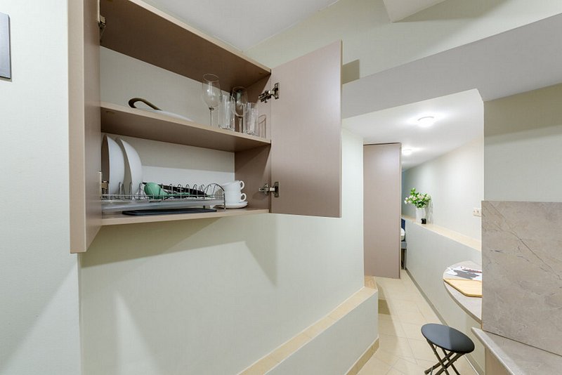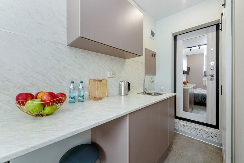 Эргономичная студия, на цокольном этаже 20 кв. м. Есть все необходимое для комфортного пребывания. На небольшой площади компактно размещены кровать 100*200 с удобным матрасом и постельным бельем, кухня, санузел с душевой, места для хранения. В кухонной зоне: варочная панель, мини холодильник, чайник и вся необходимая посуда для приготовления и сервировки; в ванной комнате: душевая, раковина, санузел, фен, полотенца, мыльные принадлежности. При необходимости есть утюг, гладильная доска, переносная мини сушилка для одежды. Телевидение с большим выбором каналов, зона wi-fi.