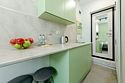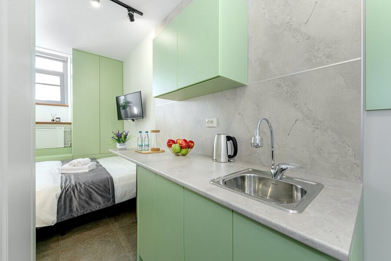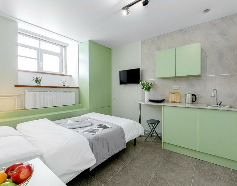 Эргономичная студия, на цокольном этаже для двух гостей 14 кв. м. Есть все необходимое для комфортного пребывания. На небольшой площади компактно размещены двуспальная кровать 140*200 с удобным матрасом и постельным бельем, кухня, санузел с душевой, места для хранения. В кухонной зоне: варочная панель, мини холодильник, чайник и вся необходимая посуда для приготовления и сервировки; в ванной комнате: душевая, раковина, санузел, фен, полотенца, мыльные принадлежности. При необходимости есть утюг, гладильная доска, переносная мини сушилка для одежды. Телевидение с большим выбором каналов, зона wi-fi.