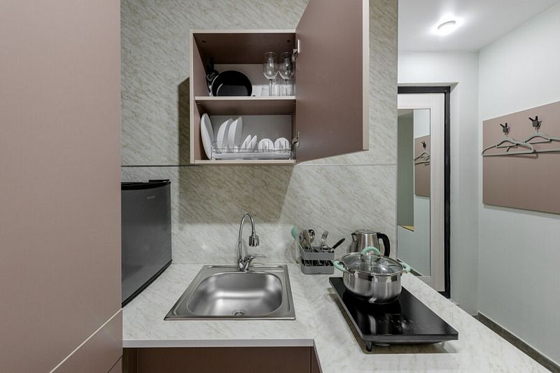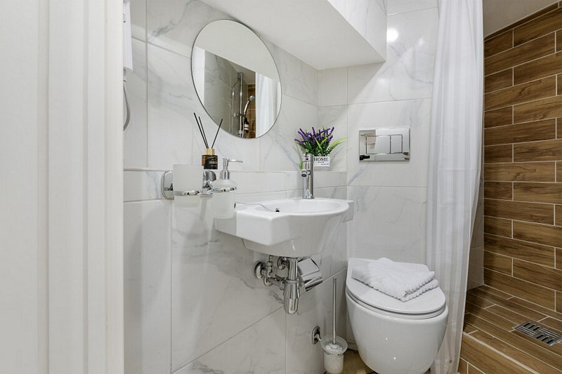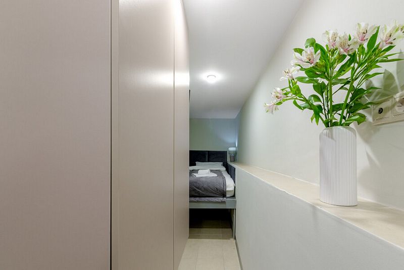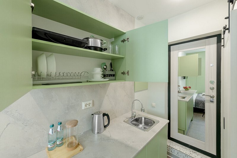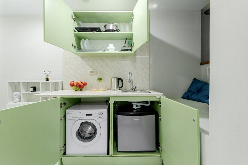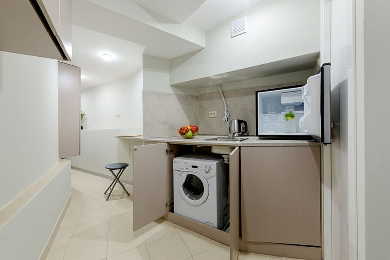 Эргономичная студия, на цокольном этаже для двух гостей 12 кв. м. Есть все необходимое для комфортного пребывания. На небольшой площади компактно размещены двуспальная кровать 140*200 с удобным матрасом и постельным бельем, кухня, санузел с душевой, места для хранения. В кухонной зоне: варочная панель, мини холодильник, микроволновая печь, чайник и вся необходимая посуда для приготовления и сервировки; в ванной комнате: душевая, раковина, санузел, фен, полотенца, мыльные принадлежности. При необходимости есть утюг, гладильная доска, переносная мини сушилка для одежды. Телевидение с большим выбором каналов, зона wi-fi.