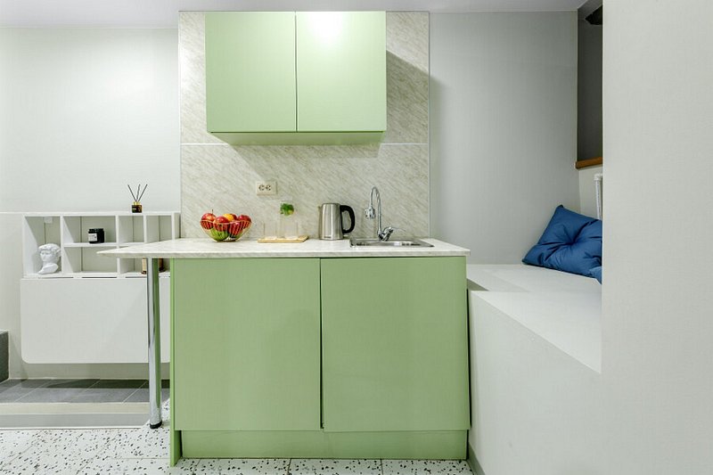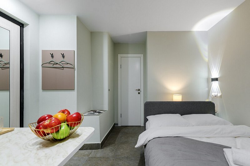 Эргономичная студия, на цокольном этаже для двух гостей 10 кв. м. Есть все необходимое для комфортного пребывания. На небольшой площади компактно размещены двуспальная кровать 140*200 с удобным матрасом и постельным бельем, кухня, санузел с душевой, места для хранения. В кухонной зоне: варочная панель, мини холодильник, чайник и вся необходимая посуда для приготовления и сервировки; в ванной комнате: душевая, раковина, санузел, фен, полотенца, мыльные принадлежности. При необходимости есть утюг, гладильная доска, переносная мини сушилка для одежды. Телевидение с большим выбором каналов, зона wi-fi.
