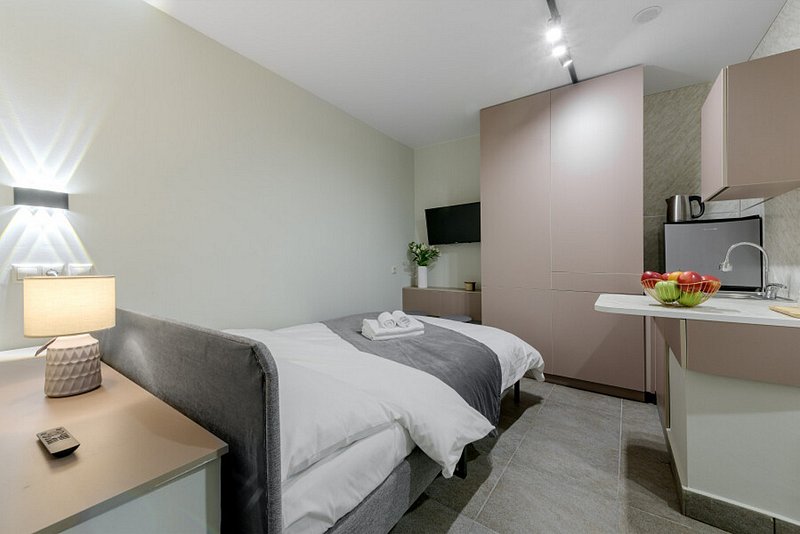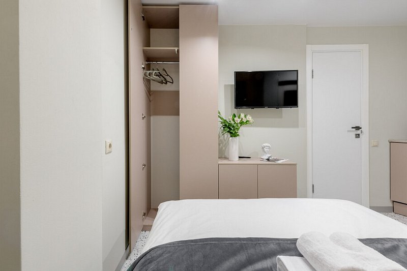 Эргономичная студия, на цокольном этаже для двух гостей 16 кв. м. Есть все необходимое для комфортного пребывания. На небольшой площади компактно размещены двуспальная кровать 140*200 с удобным матрасом и постельным бельем, кухня, санузел с душевой, места для хранения. В кухонной зоне: варочная панель, мини холодильник, чайник и вся необходимая посуда для приготовления и сервировки; в ванной комнате: душевая, раковина, санузел, фен, полотенца, мыльные принадлежности. При необходимости есть утюг, гладильная доска, переносная мини сушилка для одежды. Телевидение с большим выбором каналов, зона wi-fi.