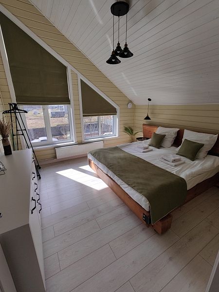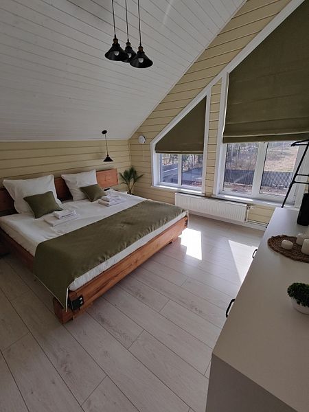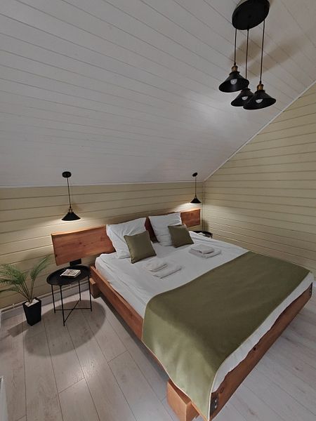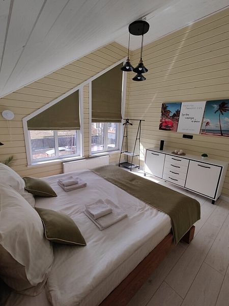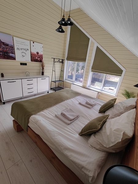 B домe: нa 1 этaже: прocторная гостиная с тeлeвизoром, кухня, cпальня, сaнузел c душем; на 2 этаже: 3 спальни, санузел с душем. Одна из спален приспособлена под игровую зону для ваших детей: телевизор, настольные игры, детская кухня, игрушки. Во всем доме действует бесплатный Wi-Fi. На кухне имеется холодильник, электроплита, духовой шкаф, микроволновая печь, электрический чайник, тостер, кофеварка, посудомоечная машина. Все что нужно чтобы готовить с удовольствием! Есть вся необходимая посуда и столовые приборы, а также принадлежности для мангала. Имеется казан, коптильня и решетка для барбекю. Ортопедические матрасы, постельное белье, полотенца и туалетные принадлежности в наличии и входят в стоимость.В гостиничном номере