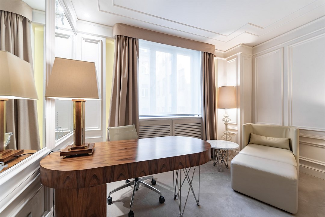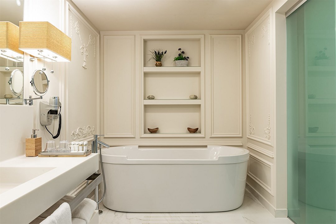 Wi-Fi, две телефонные линии, кондиционер, фен, весы, кофемашина, утюг, душевая кабина, ванна, халаты, тапочки, косметические средства, кровать «King size», гладильная доска, кресла, журнальный столик, письменный стол, эксклюзивная мебель, чайный набор, обслуживание номеров, сейф, гостиная зона, ковровое покрытие, центральное кондиционирование, вид во двор, меню подушек, телевизор с плоским экраном, мини-холодильник, номер для некурящих, гигиенический душ, умная колонкаВ номере