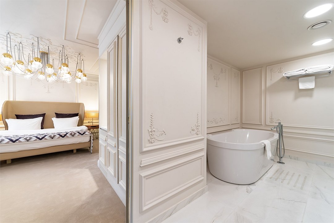 Люкс – дизайнерский номер, оформленный в светлых тонах и украшен зеркалами в стиле современной классики. Просторная кровать, уютная зона отдыха и эргономичная рабочая зона позволяют совместить отдых и работу. В распоряжении гостей: меню подушек, кофемашина Julius Meinl, Яндекс Станция с Алисой, мини-бар, комплементарная минеральная вода. Просторная ванная комната оборудована роскошной ванной, полноценной душевой, феном, весами и косметическими принадлежностями. В данной категории имеются и ванна, и душевая кабина.Услуги и удобства
