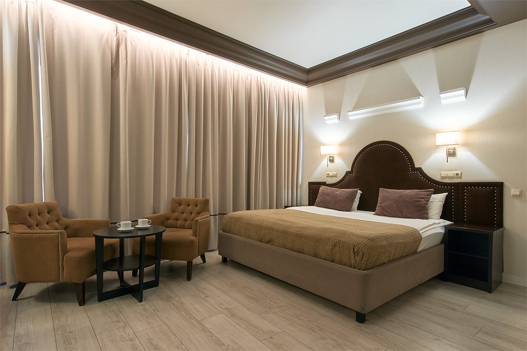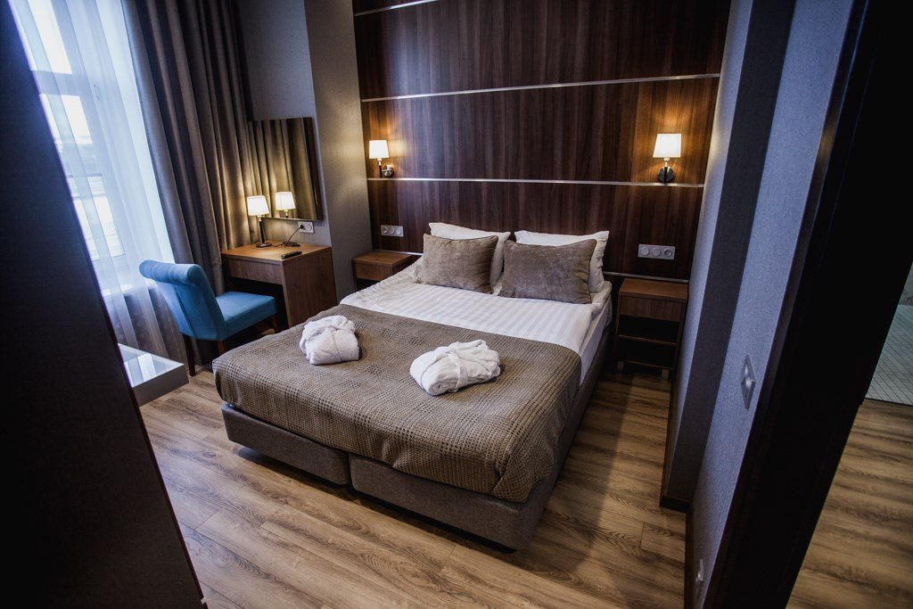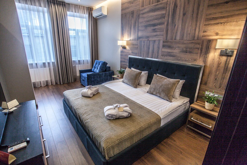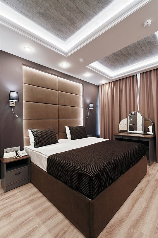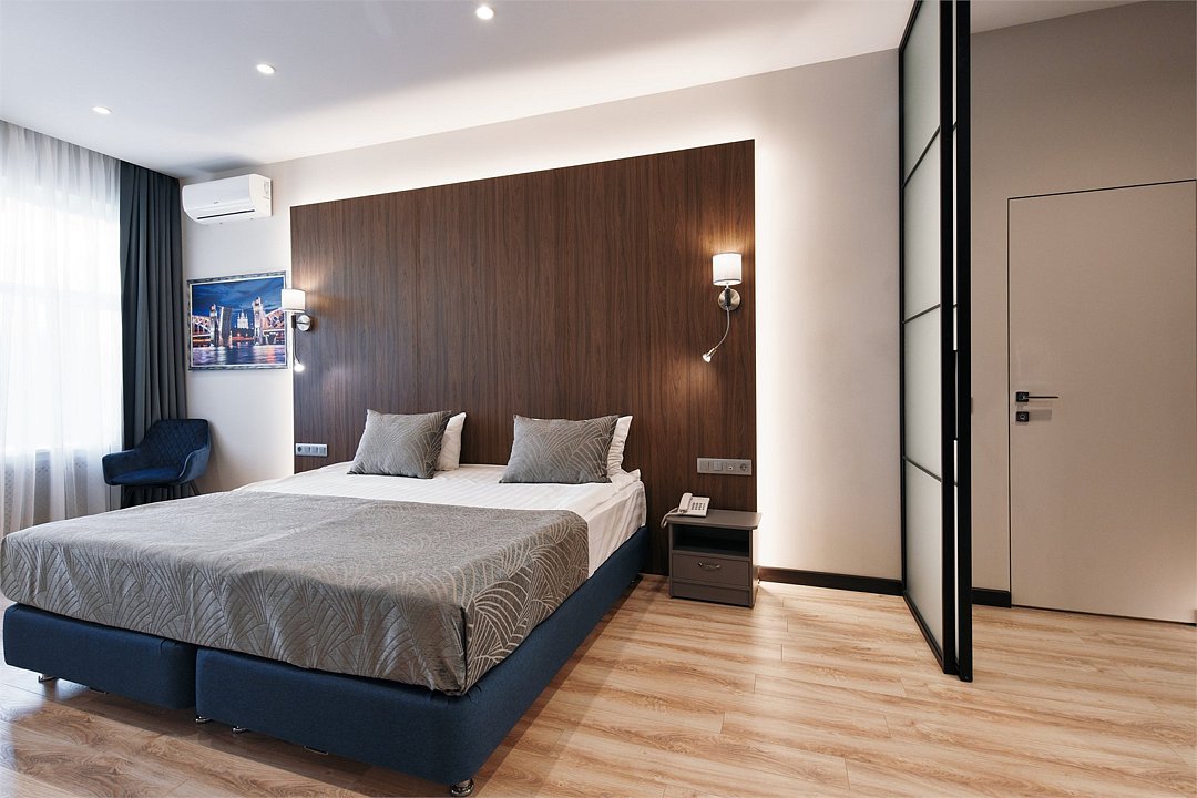 Эксклюзивный дизайн и светлые тона номера создают неповторимое сочетание комфорта и уюта. В каждом номере имеется большая двуспальная кровать, современная техника, ванная комната и душевая кабина. Так же предупреждаем наших гостей о том, что в здании отеля нет лифта. Номера расположены на 2,3.4 этажах.Услуги и удобства