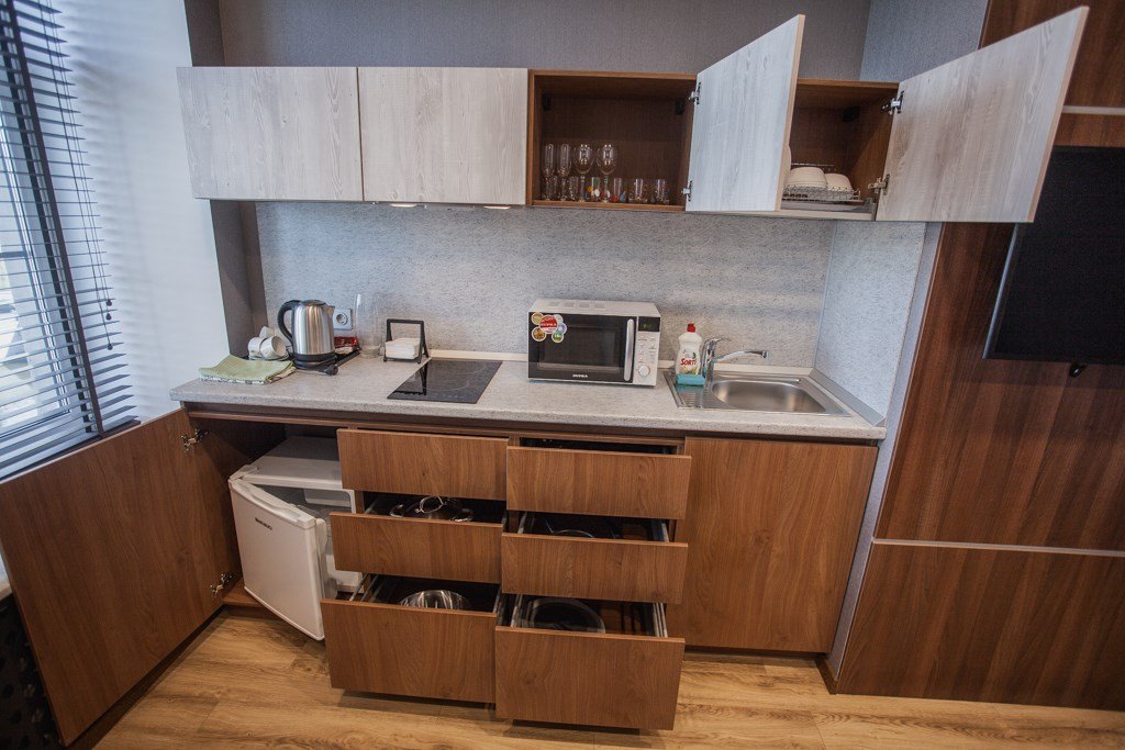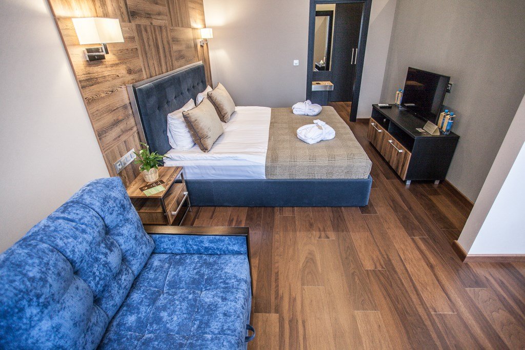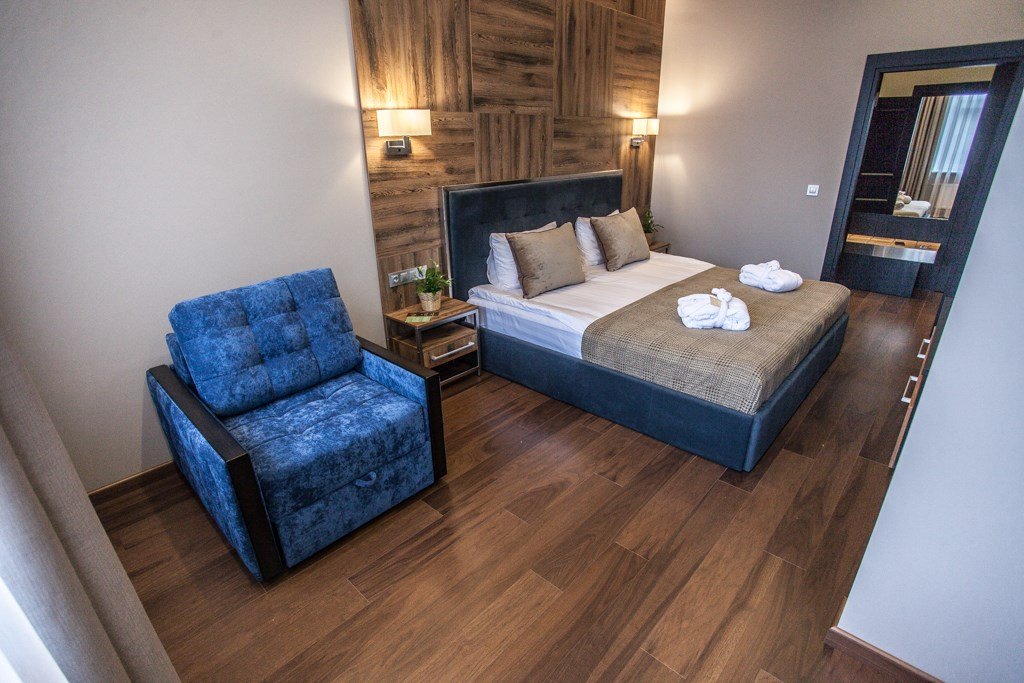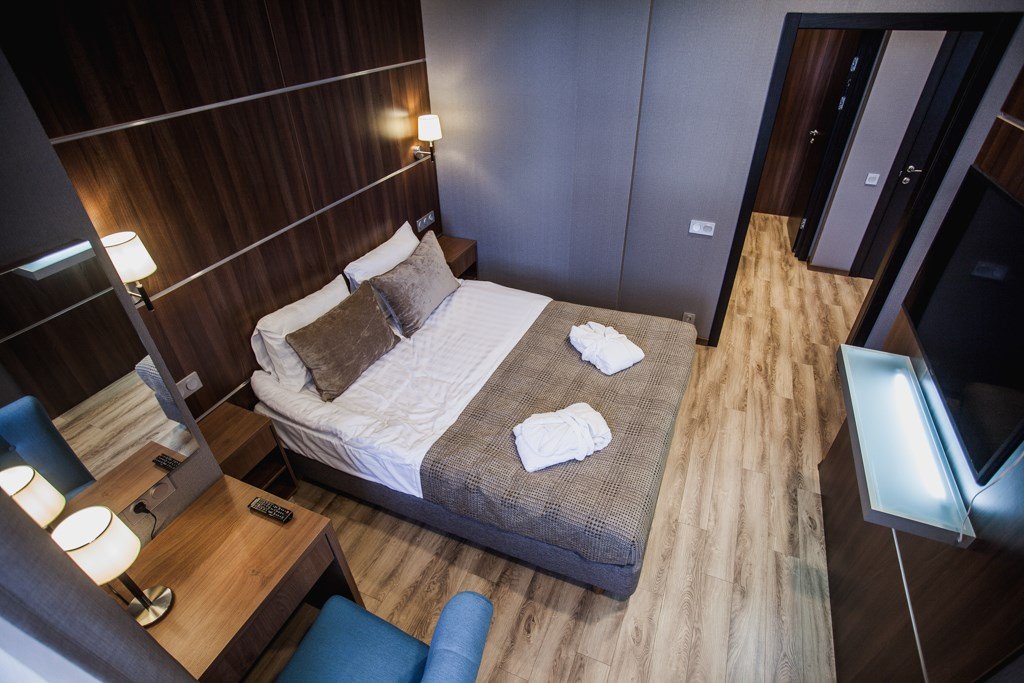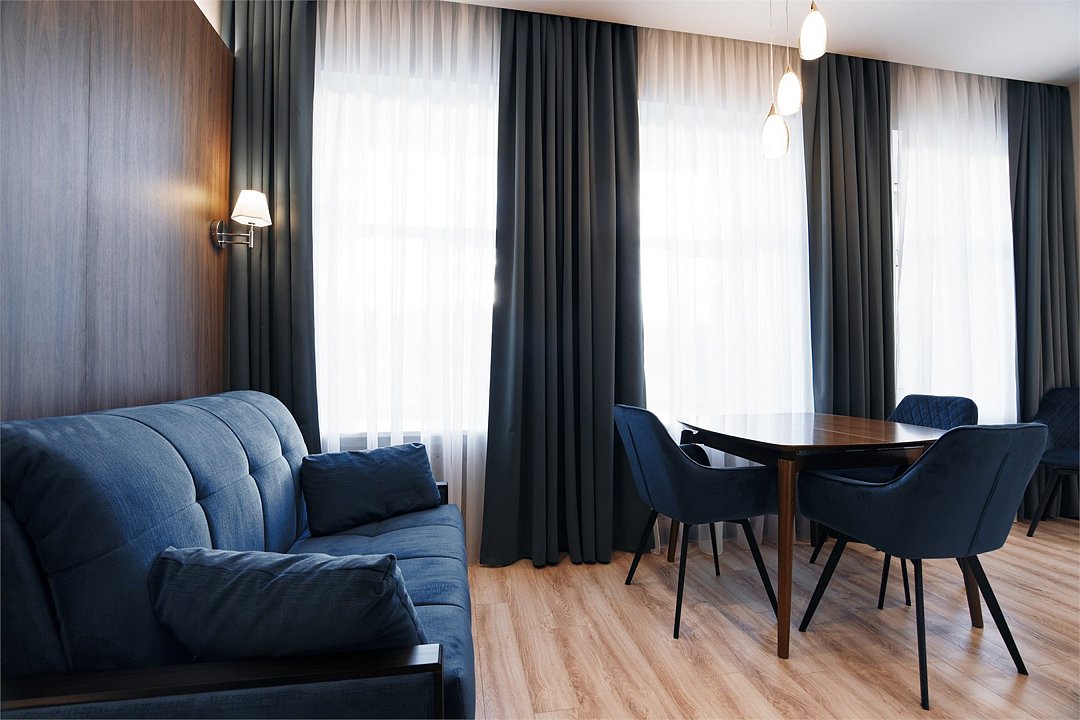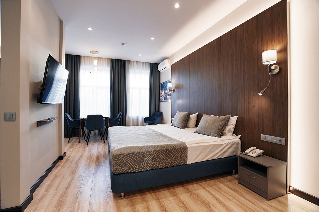 Апартаменты с одной спальней — просторный номер с повышенным уровнем комфорта. В комнате располагается большая двуспальная кровать, а на кухне двуспальный диван-кровать. Кухня оснащена всеми нужными для проживания вещами. Ванная комната оборудована всеми необходимыми принадлежностями. Так же предупреждаем наших гостей о том, что в здании отеля нет лифта. Номера расположены на 2,3.4 этажах.Услуги и удобства