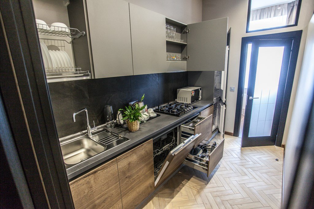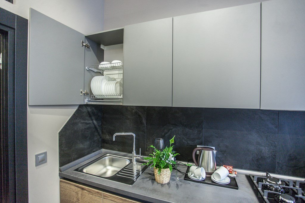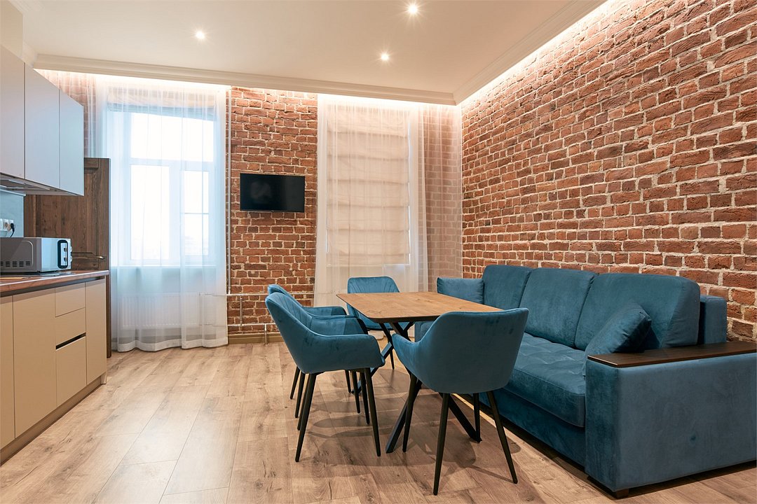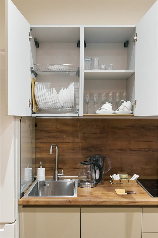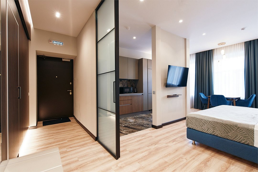 Тихие и уютные апартаменты, идеально сочетают в себе стиль и комфорт. В распоряжении гостей кухня, одна двуспальная кровать, кресло-кровать, ванная комната и современная техника. Так же предупреждаем наших гостей о том, что в здании отеля нет лифта. Номера расположены на 2,3.4 этажах.Услуги и удобства