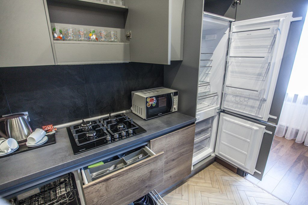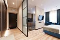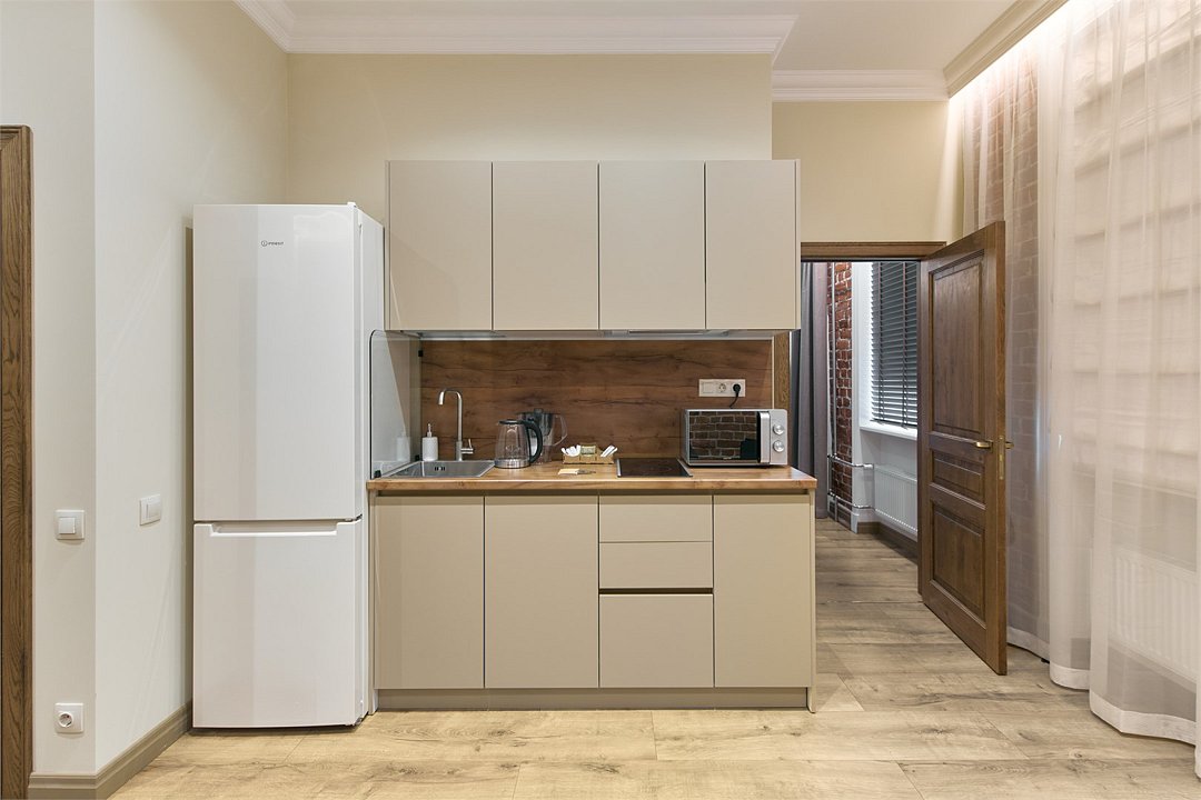 Уютные апартаменты с собственной кухней общей площадью 55 кв.м. с собственным санузлом и душевой, оборудованной кухней, спальней с кроватью king size и односпальной кроватью. В распоряжении гостей полностью оборудованная кухня с большим холодильником и всей необходимой посудой. На кухне раздвижной диван-книжка. Апартаменты выполнены в нейтральных тонах. Максимальная вместимость - 4 человека.Услуги и удобства
