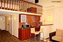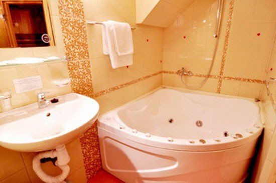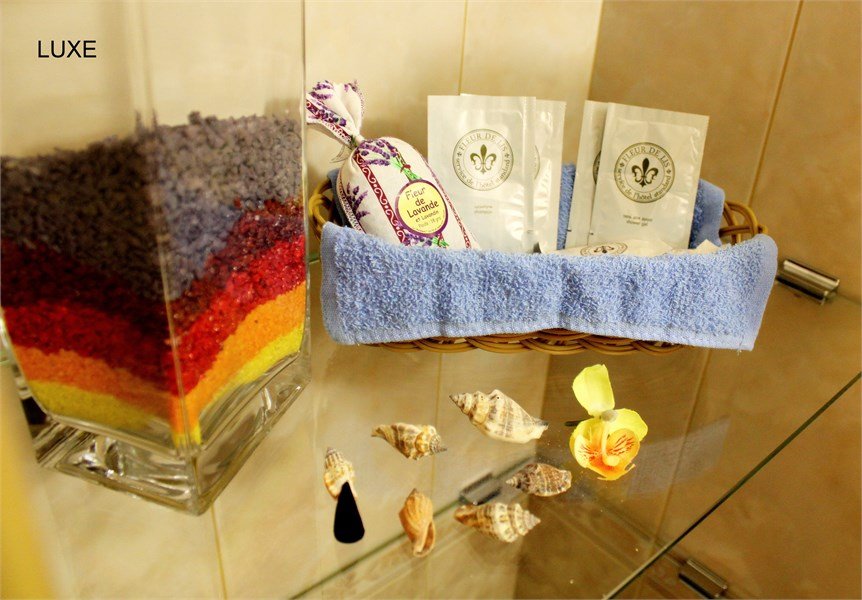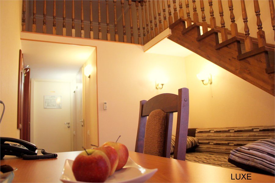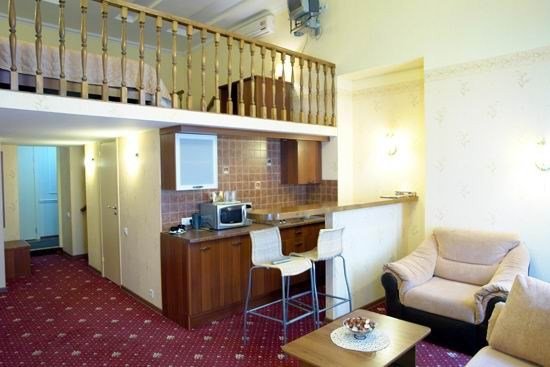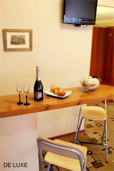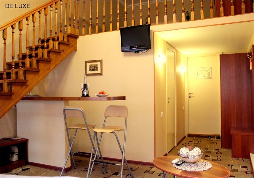 Прихожая: шкаф-купе со встроенным сейфом, подставка для чемодана, вешалка для верхней одежды. В комнате: двухспальная кровать 1.60м, прикроватные тумбочки, стол с зеркалом, стул, диван, два кресла, барная стойка, микроволновая печь, чайник, набор посуды, кондиционер, телевизор, спутниковое ТВ, DVD, выход в Интернет. Возможно размещение 3-го и 4-го спального места, детской кроватки. В ванной комнате: ванна, сауна, индивидуальные одноразовые туалетные принадлежности (шампунь, мыло, гель для душа), комплект полотенец, халат, тапочки, фен.Услуги и удобства