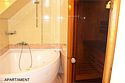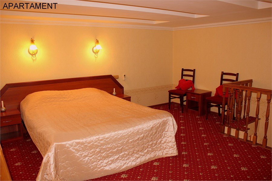 Прихожая: шкаф-купе со встроенным сейфом, подставка для чемодана, вешалка для верхней одежды. В комнате: двухспальная кровать 1.60 м, прикроватные тумбочки, стол с зеркалом, стул, диван, барная стойка, чайник, набор посуды, кондиционер, телевизор, спутниковое ТВ, DVD, выход в Интернет. Возможно размещение 3-го спального места (диван или детская кроватка). В ванной комнате: ванна, сауна, индивидуальные одноразовые туалетные принадлежности (шампунь, мыло, гель для душа), комплект полотенец, халат, тапочки, фен.Услуги и удобства