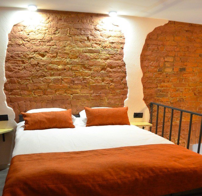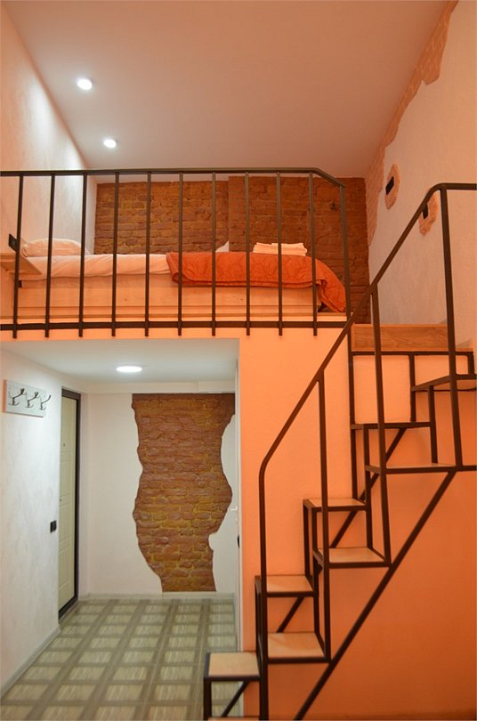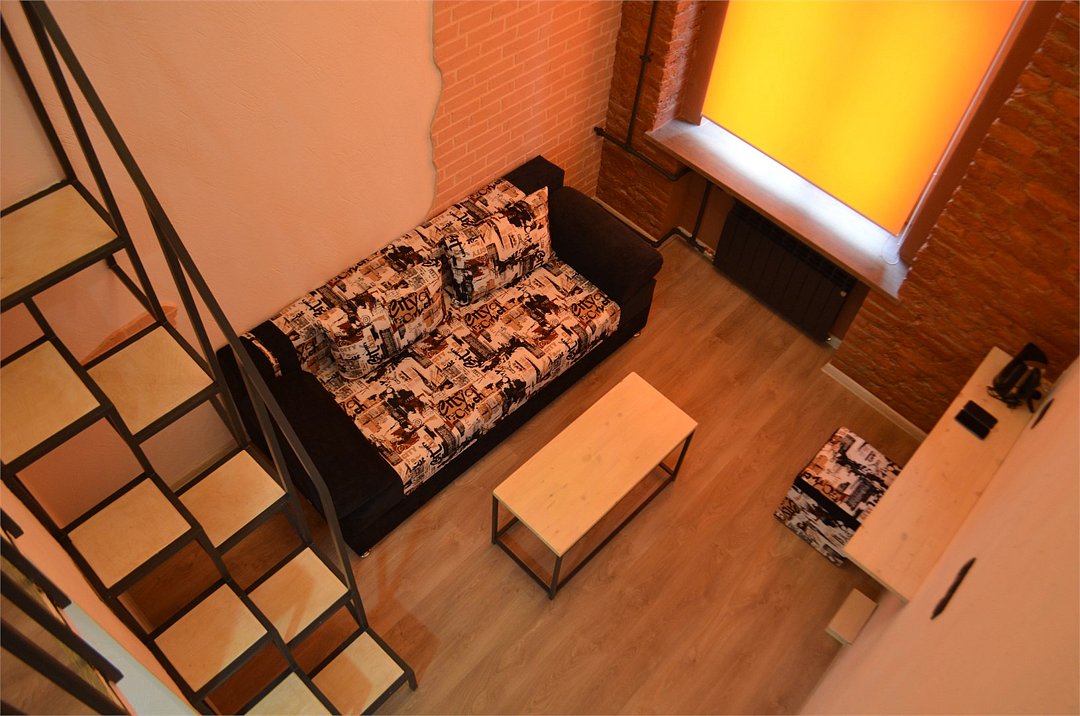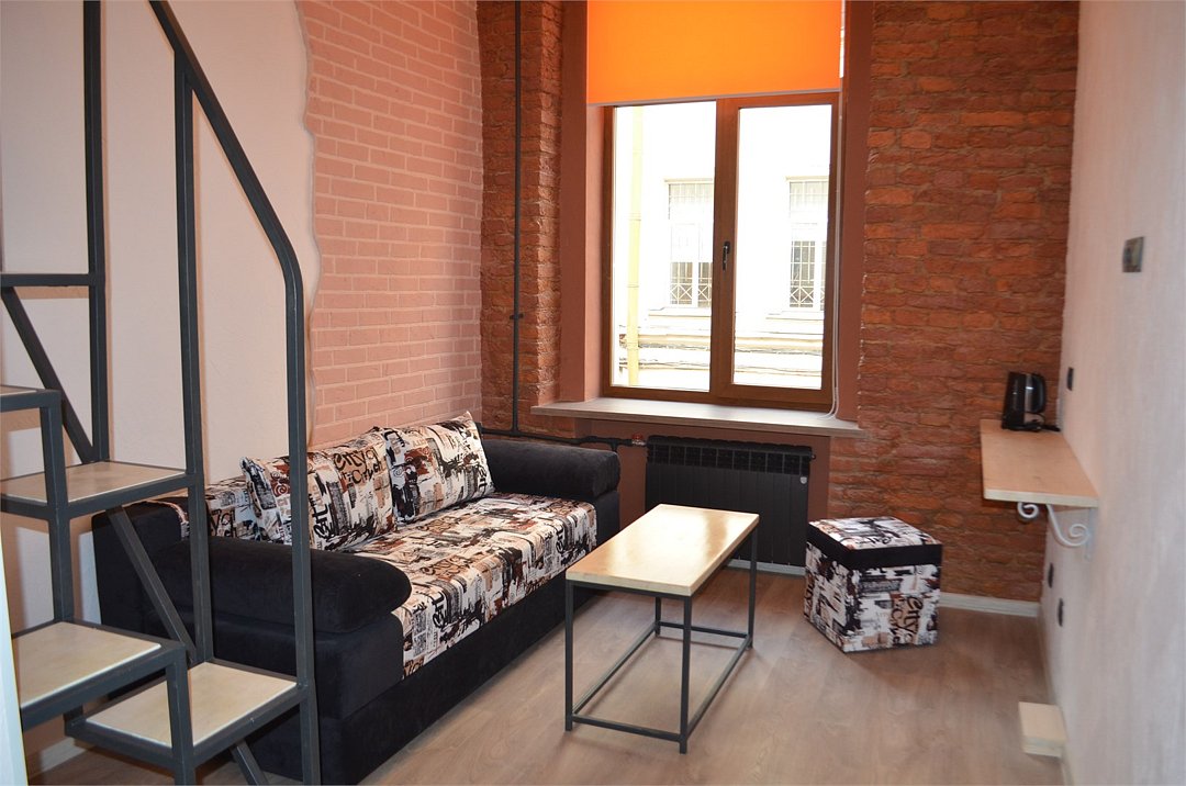 Исполнен в стиле LOFT. Двухуровневый. Первый этаж гостиная зона, второй этаж спальная зона. Экстравагантная лестница. Высота потолков 4 метра. Вход в соседней парадной. Ключи и регистрация на основной ресепшен отеля. Для любителей необычной обстановки.Услуги и удобства