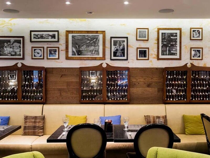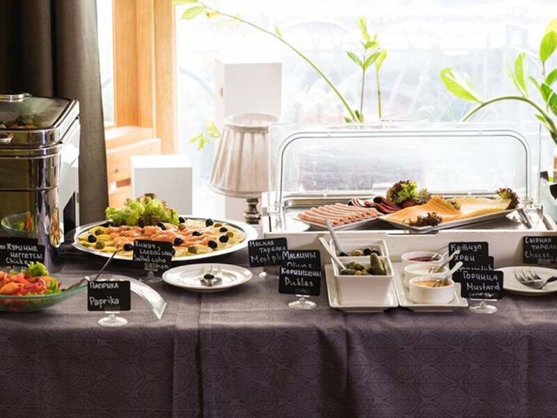 На территории отеля расположен ресторан «Нож справа, вилка слева», предлагающий блюда как русской, так и европейской кухни.