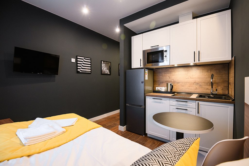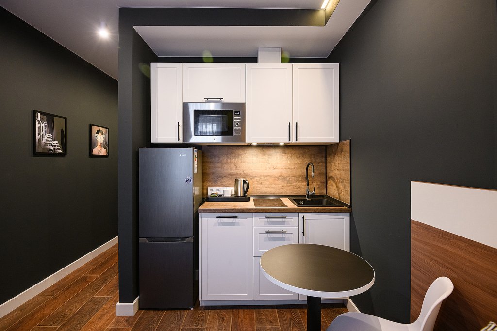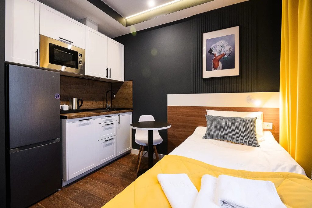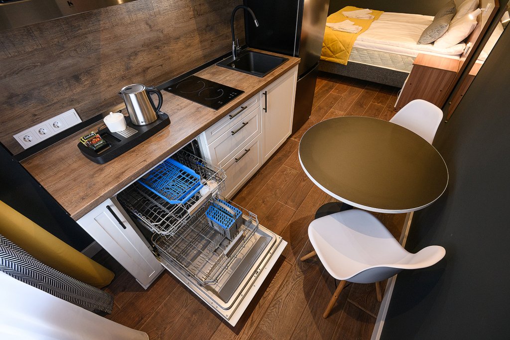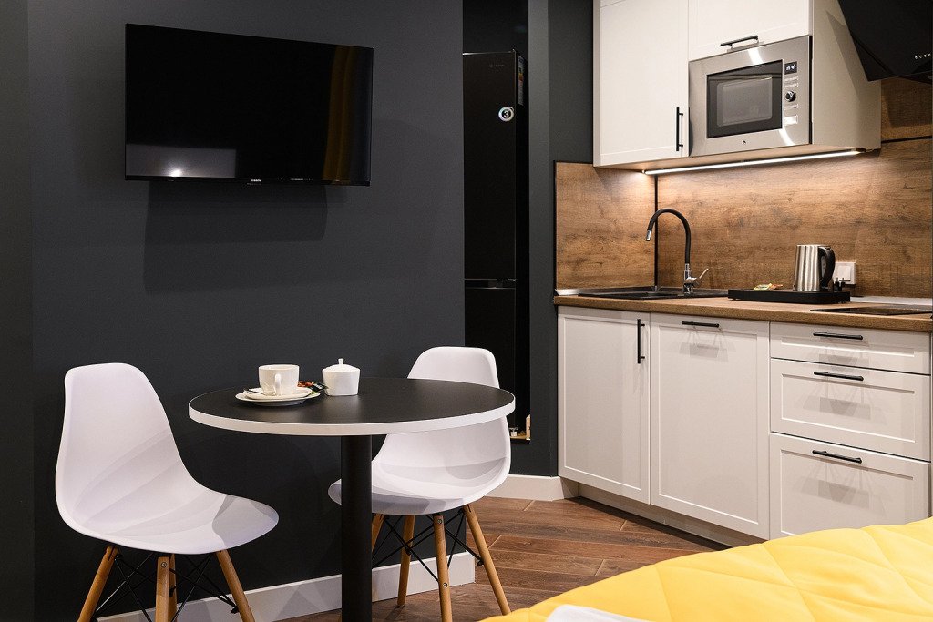 Каждый номер укомплектован для проживания и работы как на короткий, так и на длительный срок. Собственная кухня оснащена необходимой техникой: микроволновая печь, электрический чайник, плита, холодильник, посудомоечная машина и кухонная утварь для готовки. Гости всегда могут приготовить себе чай, воспользовавшись чайной станцией. В номерах есть стиральные машины, а также гладильные принадлежности и прочие мелочи, телевизор, доступ к Wi-fi. В качестве бонуса в номерах присутствуют косметические наборы, банные полотенца и тапочки, а в номерах категорий «Полулюкс» и «Люкс» также предоставляются халаты. Из номеров категории «Люкс» открывается панорамный вид города.