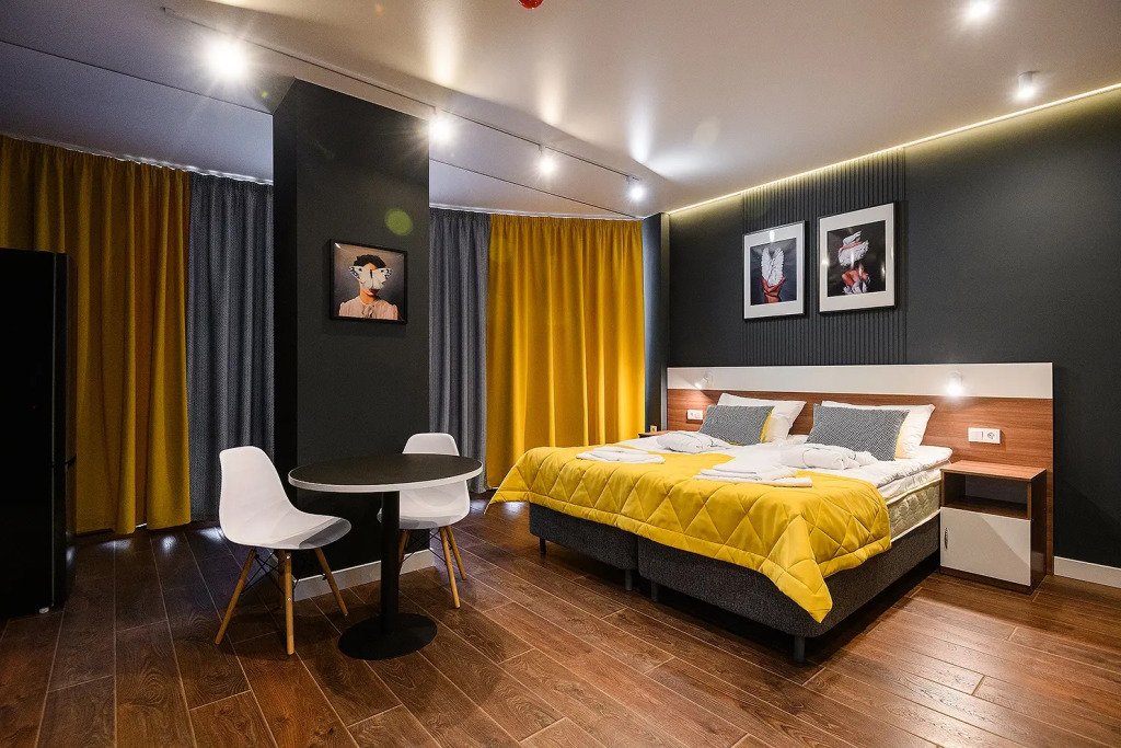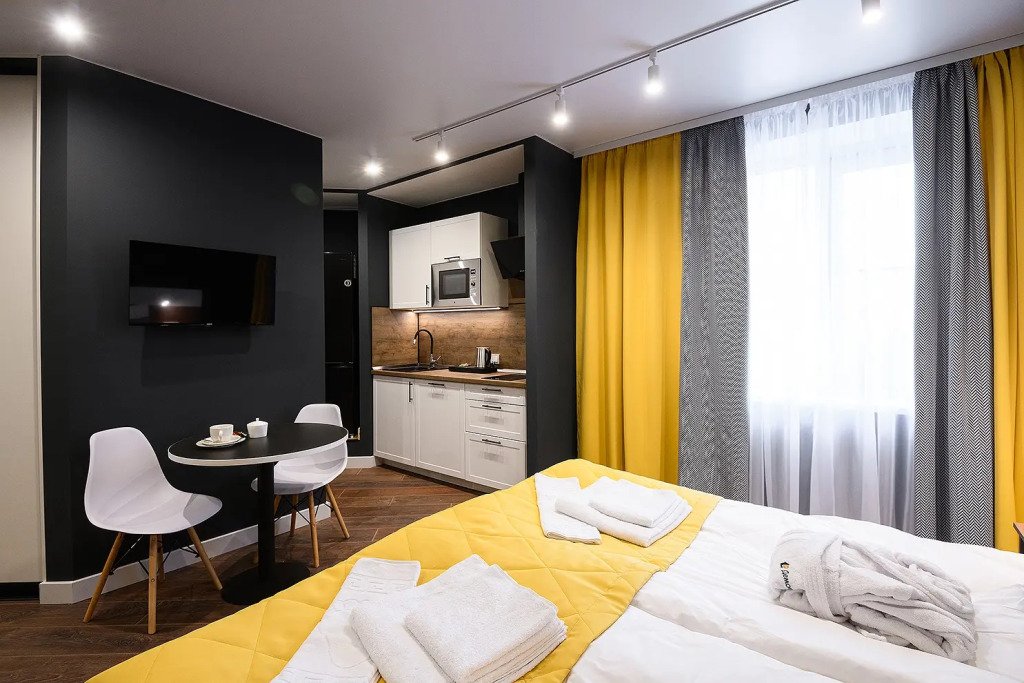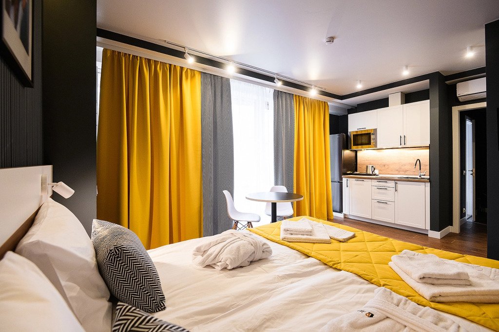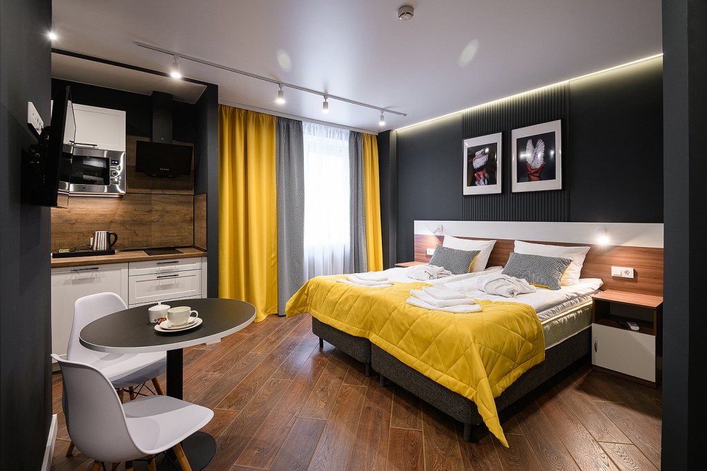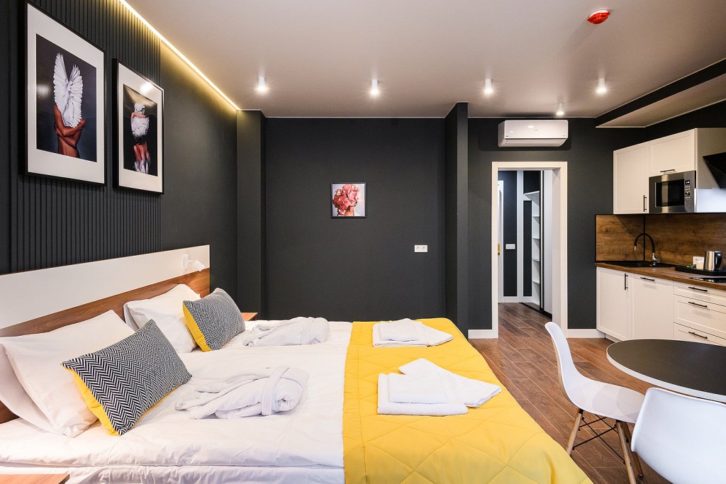 Апартаменты расположены на верхнем этаже многофункционального жилого комплекса, снабжены вентиляцией, кондиционерами, а также системой «тёплый пол», дизайнерской мебелью, зеркалом с подсветкой в ванной комнате и кроватями с ортопедическими матрасами. Тип кроватей — раздельные или большую двуспальную — возможно выбрать по предварительной договорённости с апарт-отелем. К услугам гостей работает круглосуточная стойка регистрации.