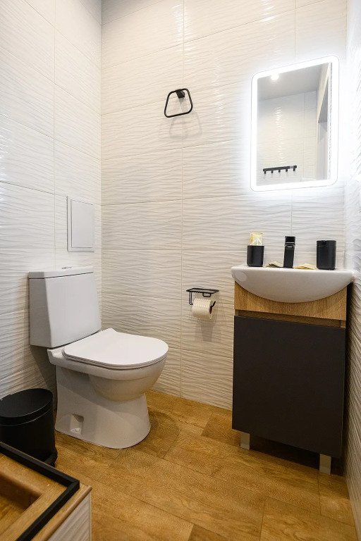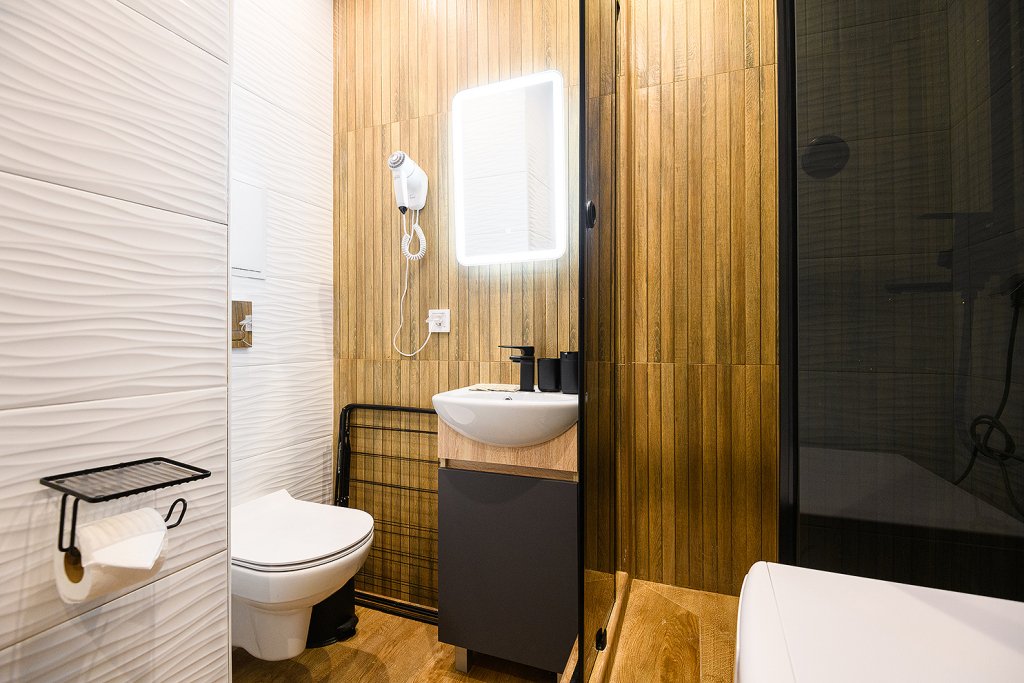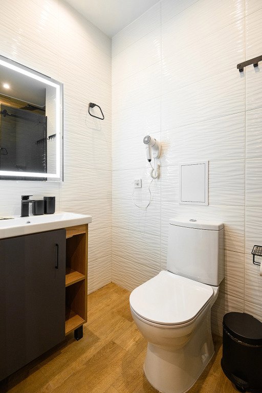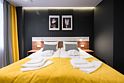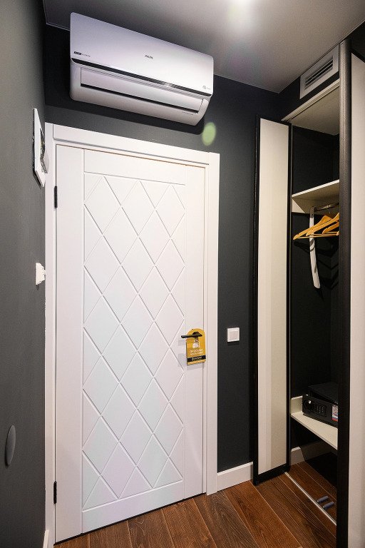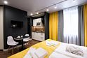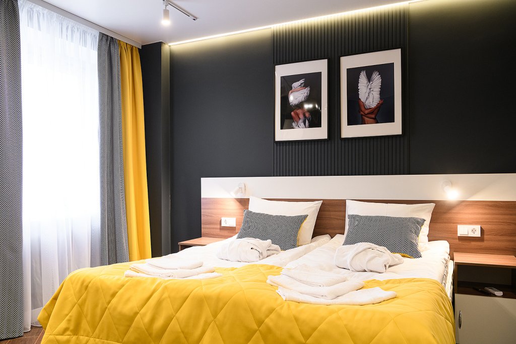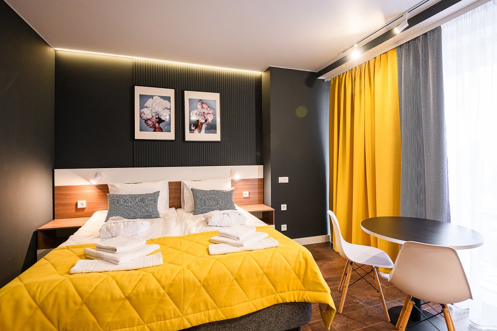 Апартаменты расположены на верхнем этаже многофункционального жилого комплекса, снабжены вентиляцией, кондиционерами, а также системой «тёплый пол», дизайнерской мебелью, зеркалом с подсветкой в ванной комнате и кроватями с ортопедическими матрасами. Тип кроватей — раздельные или большую двуспальную — возможно выбрать по предварительной договорённости с апарт-отелем. К услугам гостей работает круглосуточная стойка регистрации.