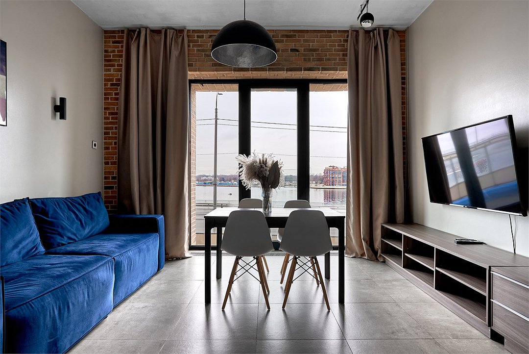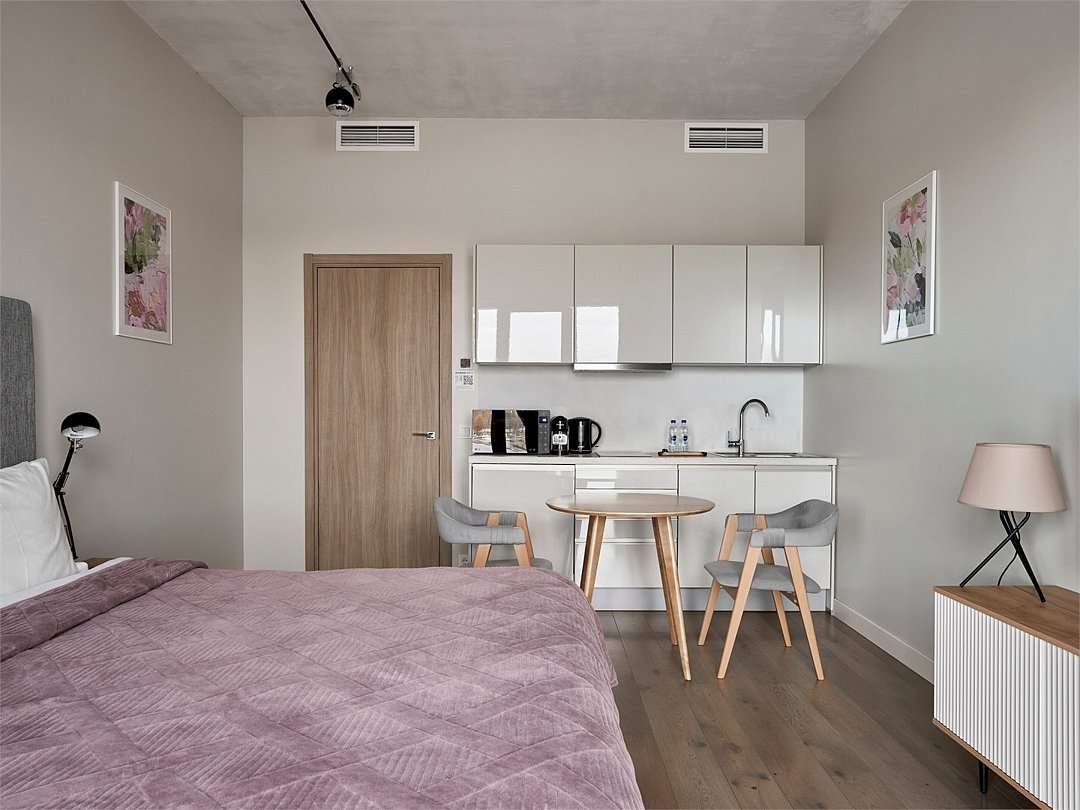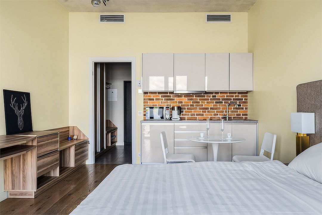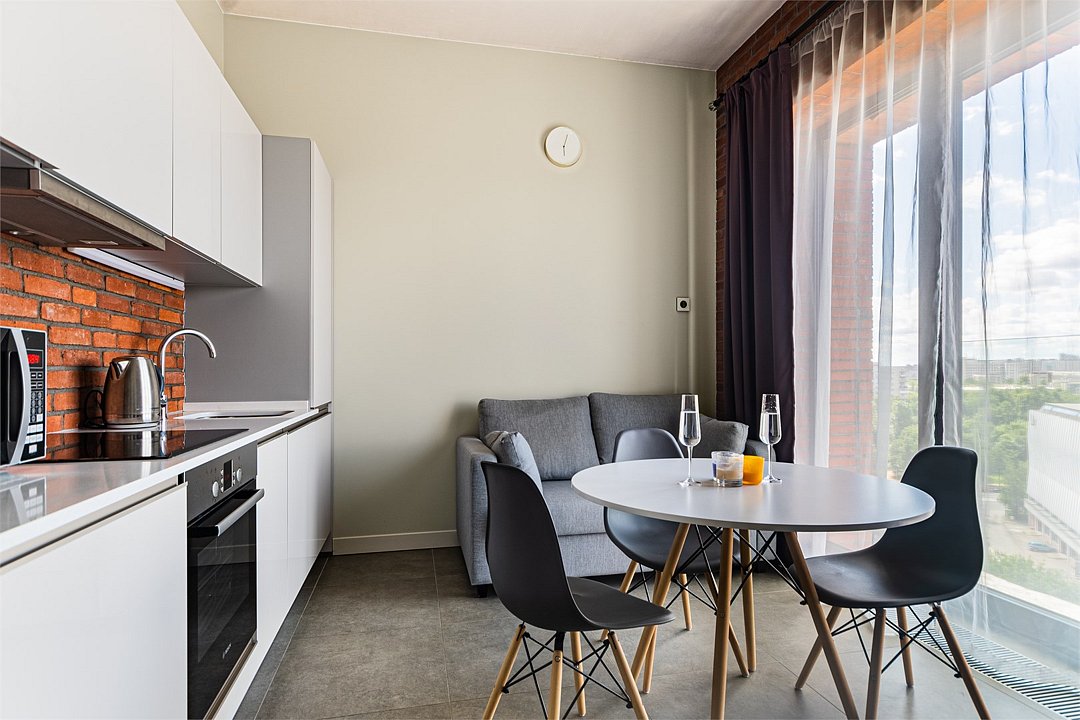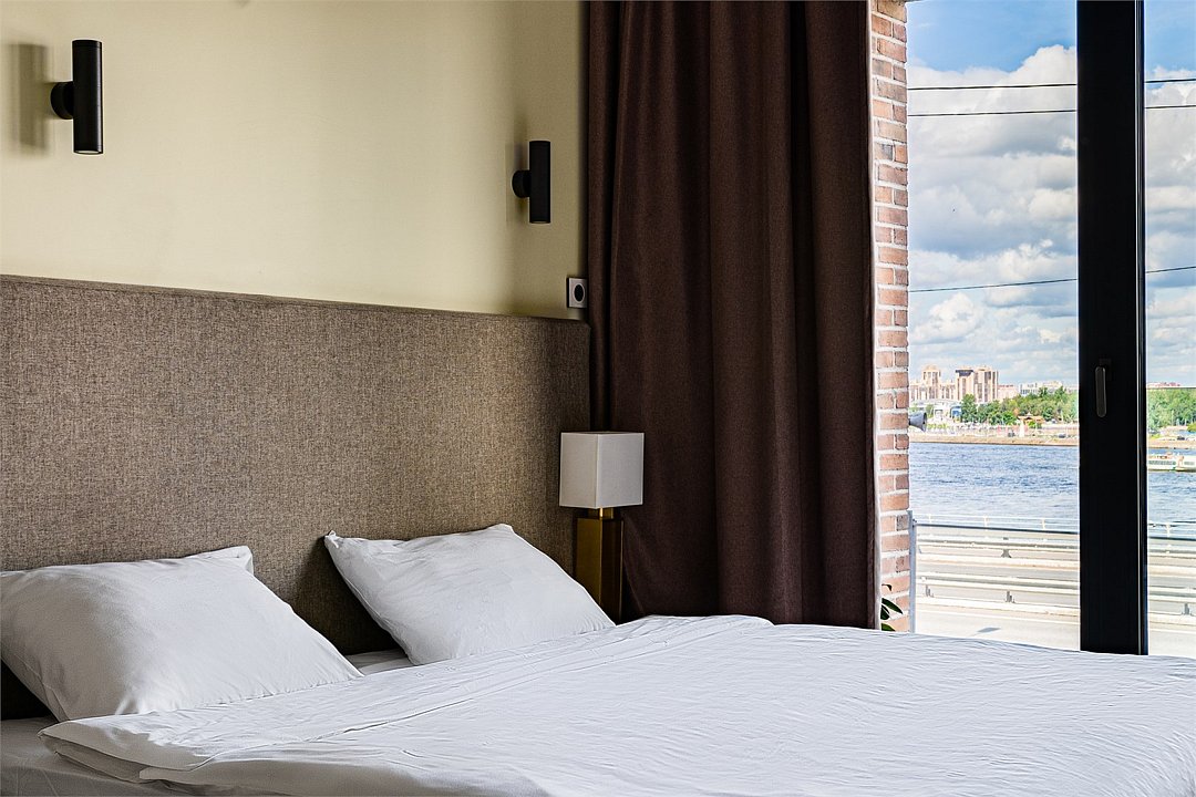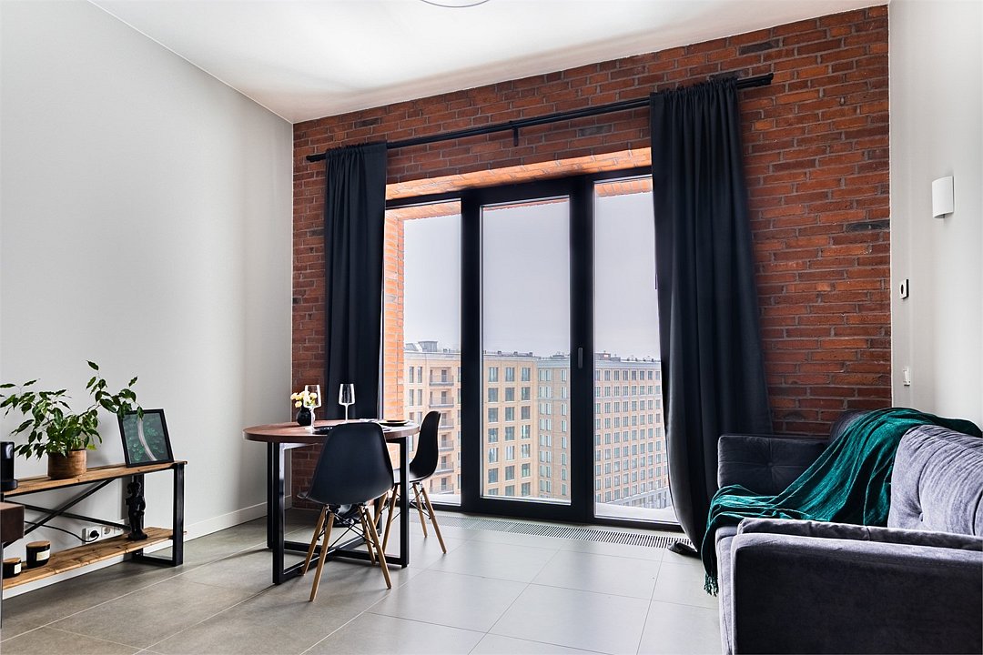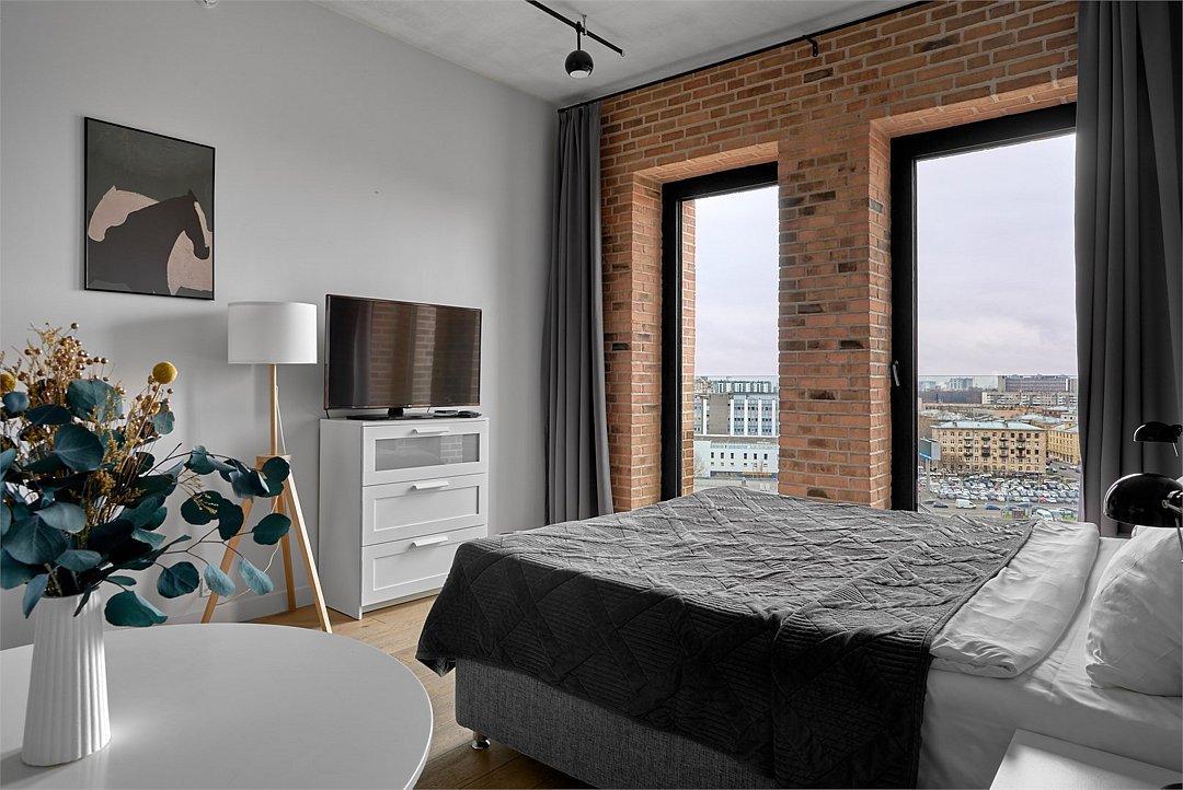 Апартаменты на 7,9 и 11 этажах площадью по 37 м² с видом на город для семейной пары с детьми или 3-х гостей Санкт-Петербурга. Высокие потолки, панорамные окна, отделка стен клинкерным кирпичом, звукоизоляция, климатконтроль. В апартаментах есть все необходимое: двуспальная кровать King size в спальне, гардеробная, удобный раскладной диван (ширина 120 см) в кухне-гостиной. Кухня оборудована бытовой техникой (плита, холодильник, чайник, микроволновка), а также посудой и столовыми приборами. В ванной комнате есть фен, гигиенические принадлежности, набор полотенец, тапочки. В стоимость проживания не включена ежедневная уборка со сменой постельного белья и полотенец — оплачивается дополнительно по запросу.Услуги и удобства