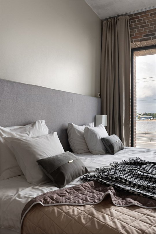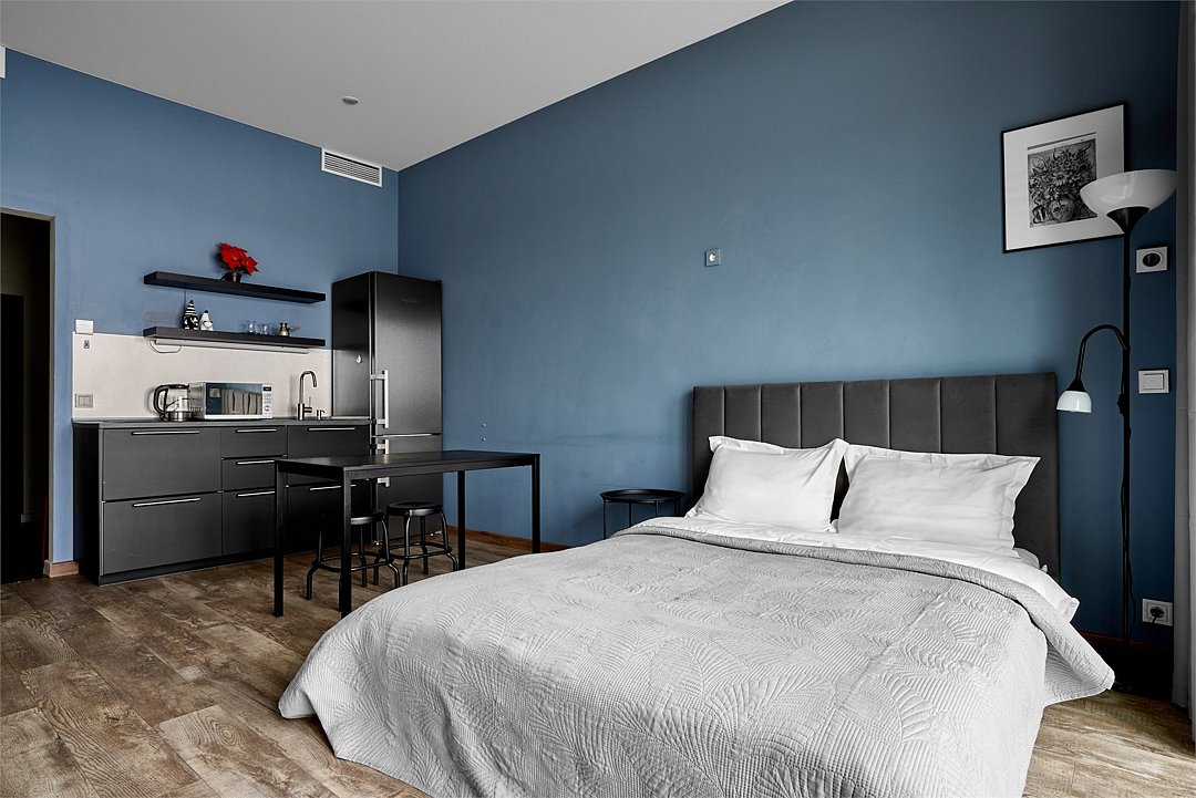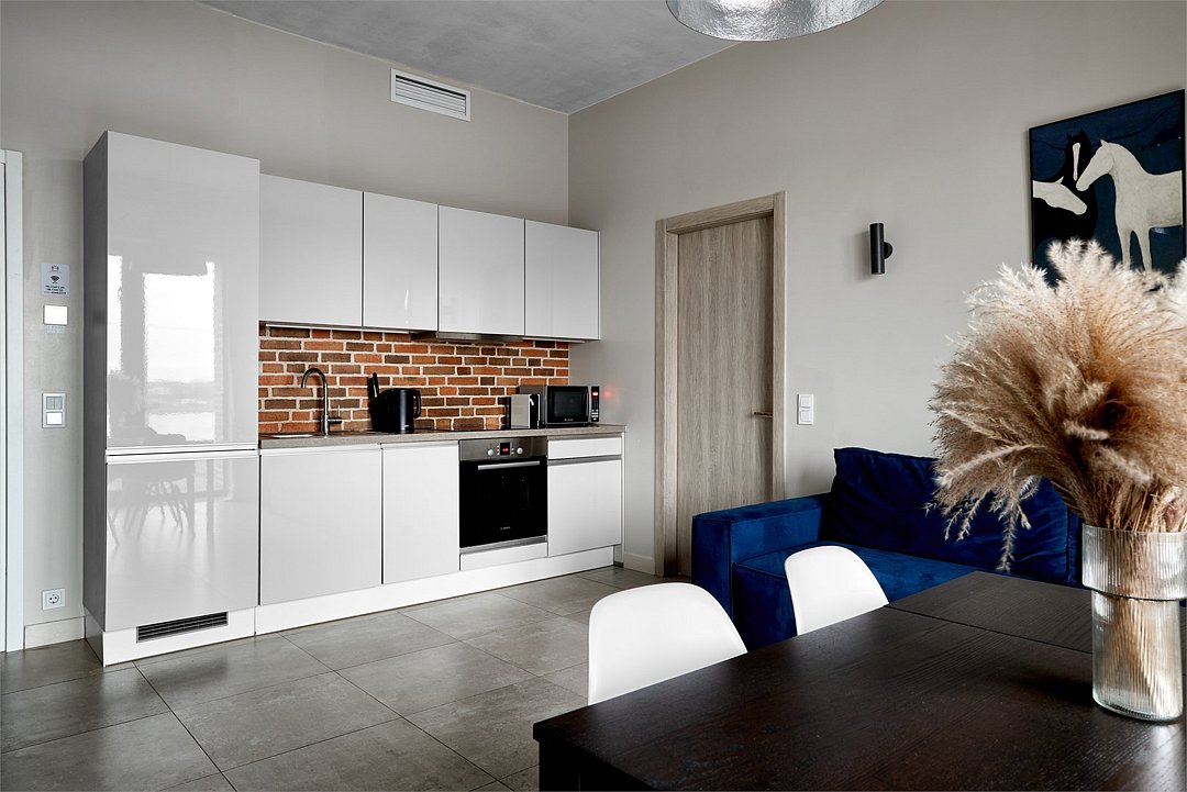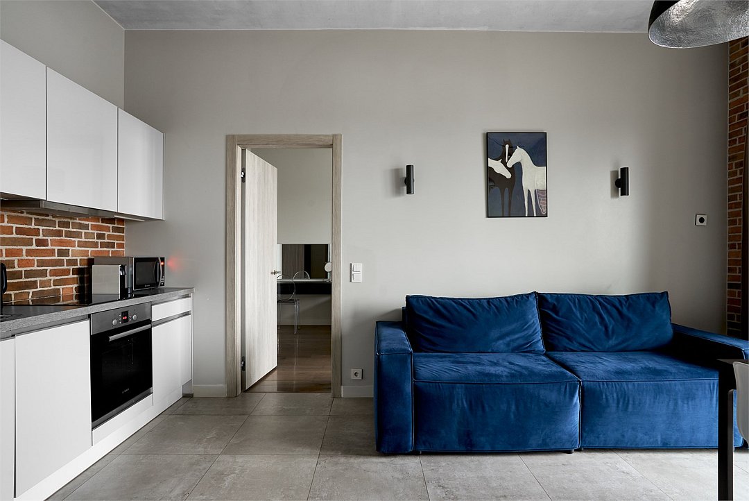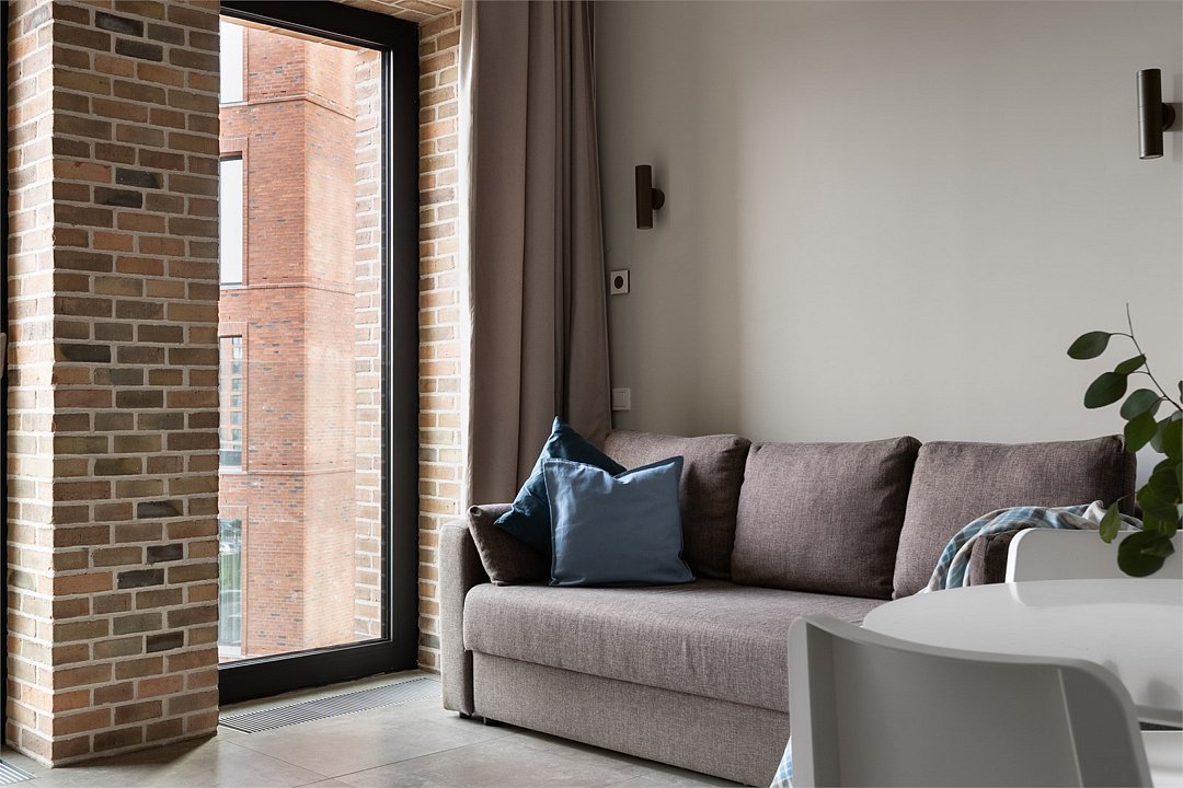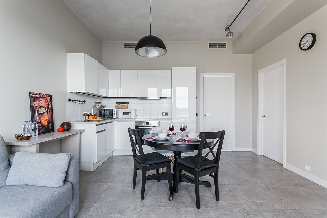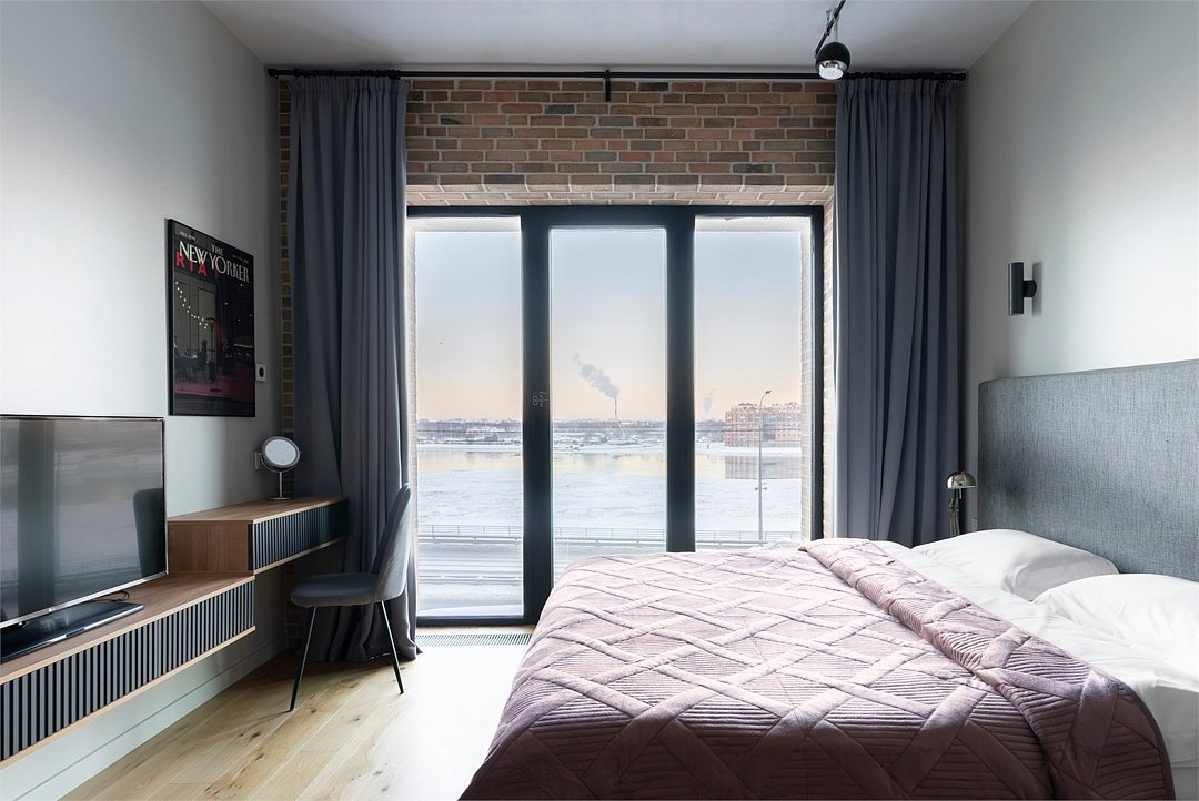 Апартаменты на 7,9 и 11 этажах площадью по 37 м² с видом на город для семейной пары с детьми или 3-х гостей Санкт-Петербурга. Высокие потолки, панорамные окна, отделка стен клинкерным кирпичом, звукоизоляция, климатконтроль. В апартаментах есть все необходимое: двуспальная кровать King size в спальне, гардеробная, удобный раскладной диван (ширина 120 см) в кухне-гостиной. Кухня оборудована бытовой техникой (плита, холодильник, чайник, микроволновка), а также посудой и столовыми приборами. В ванной комнате есть фен, гигиенические принадлежности, набор полотенец, тапочки. В стоимость проживания не включена ежедневная уборка со сменой постельного белья и полотенец — оплачивается дополнительно по запросу.Услуги и удобства