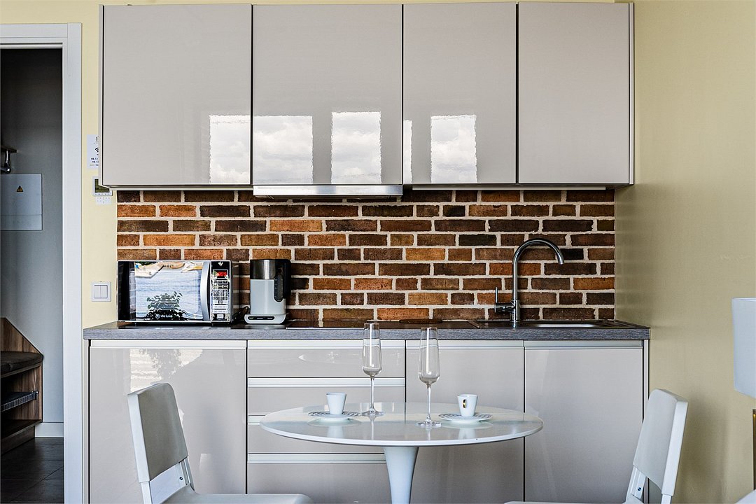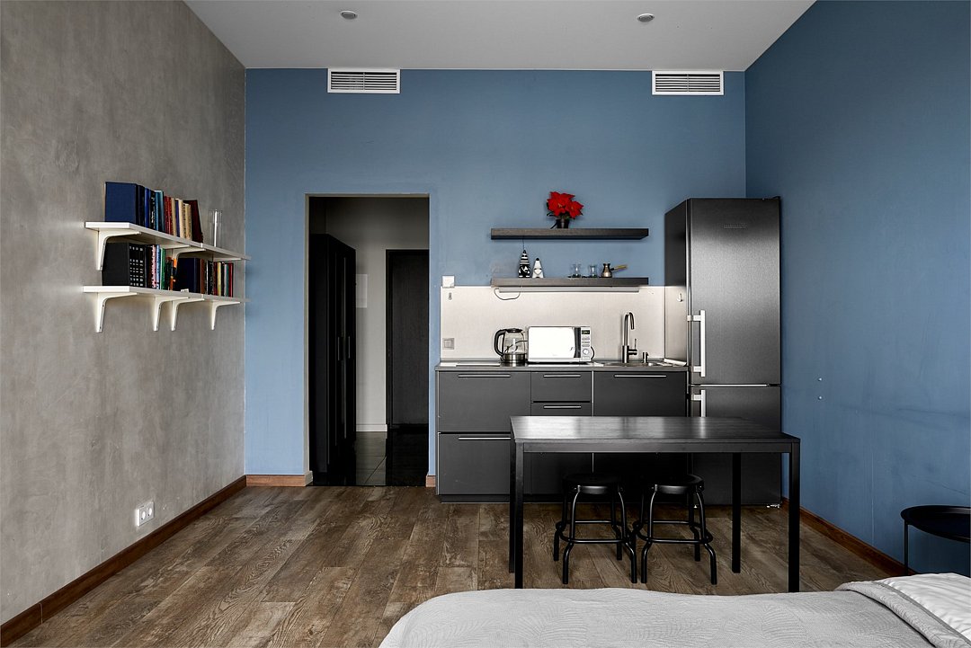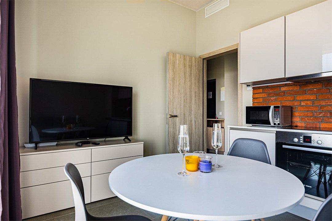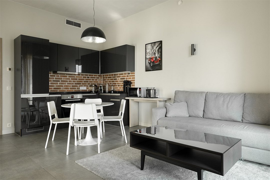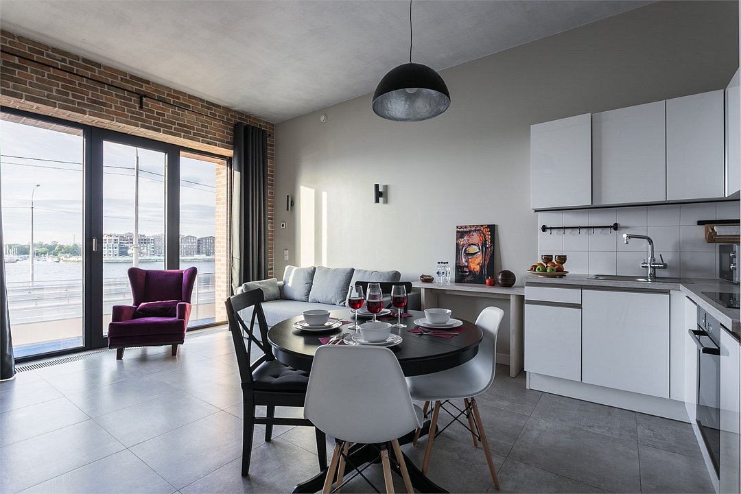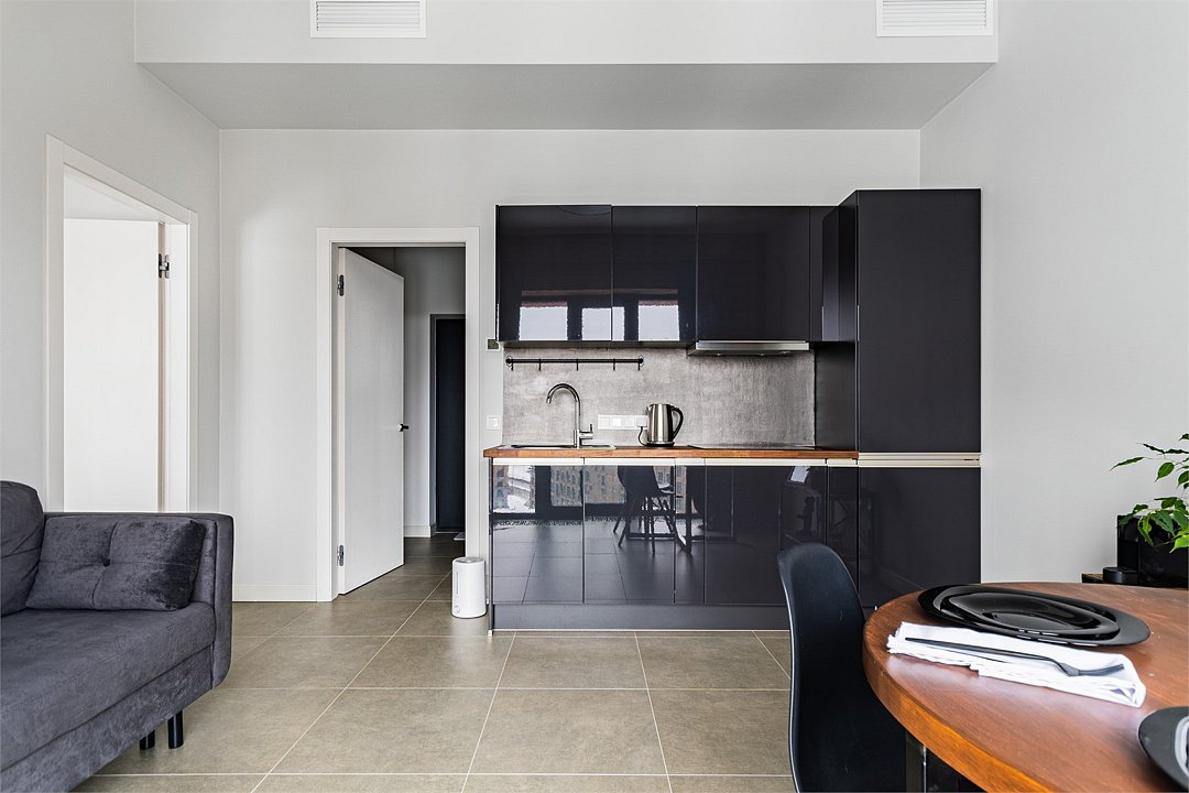Апартаменты на 7,9 и 11 этажах площадью по 37 м² с видом на город для семейной пары с детьми или 3-х гостей Санкт-Петербурга. Высокие потолки, панорамные окна, отделка стен клинкерным кирпичом, звукоизоляция, климатконтроль. В апартаментах есть все необходимое: двуспальная кровать King size в спальне, гардеробная, удобный раскладной диван (ширина 120 см) в кухне-гостиной. Кухня оборудована бытовой техникой (плита, холодильник, чайник, микроволновка), а также посудой и столовыми приборами. В ванной комнате есть фен, гигиенические принадлежности, набор полотенец, тапочки. В стоимость проживания не включена ежедневная уборка со сменой постельного белья и полотенец — оплачивается дополнительно по запросу.Услуги и удобства