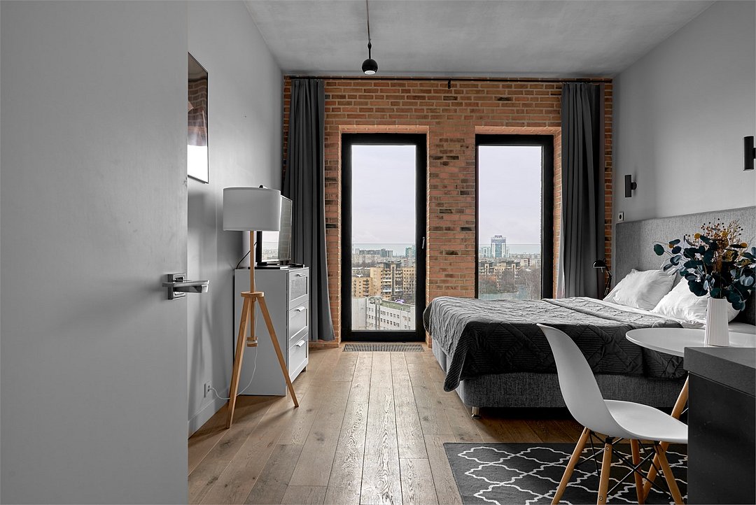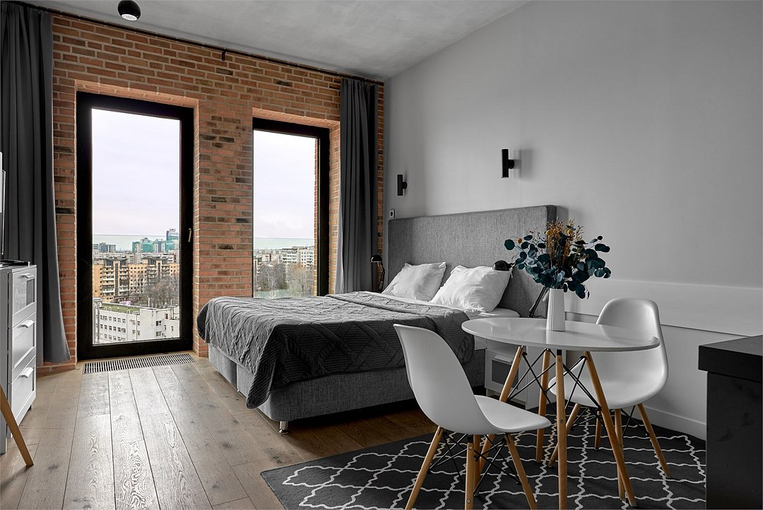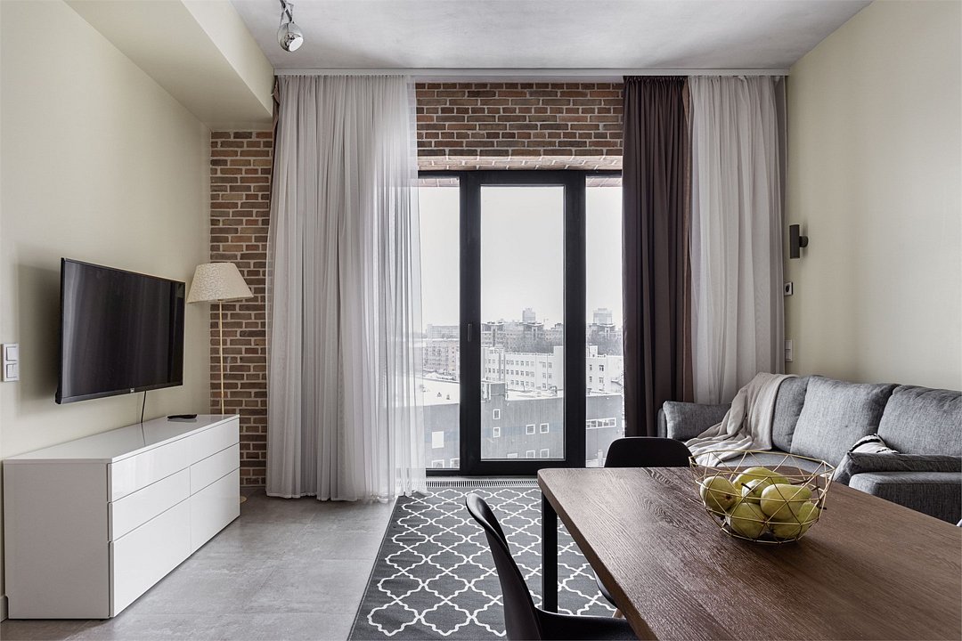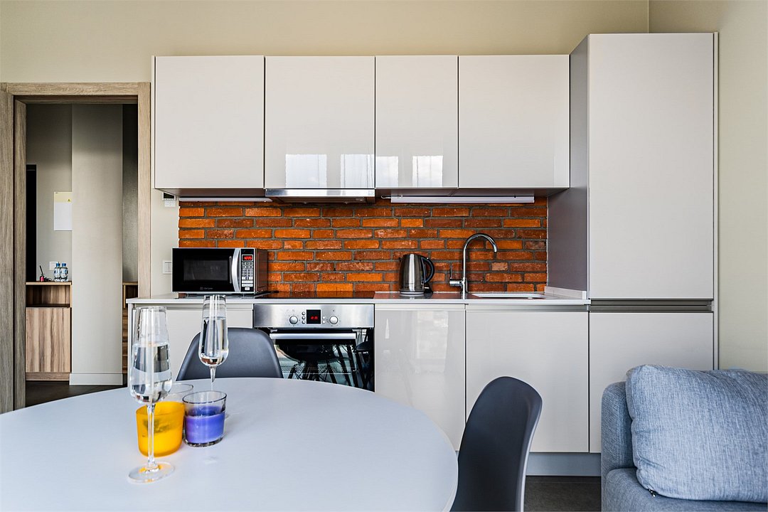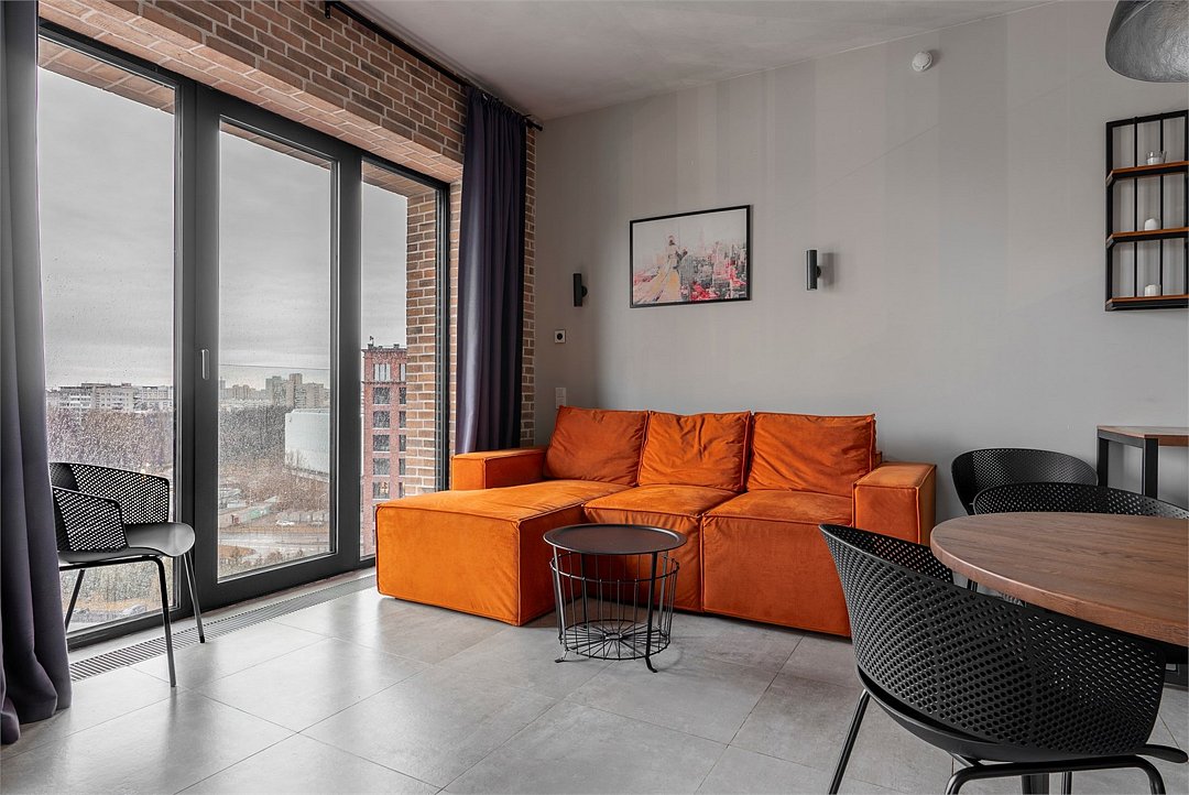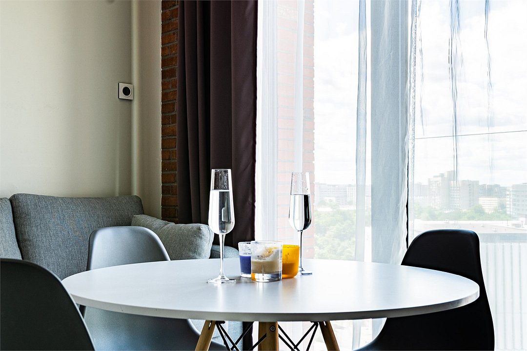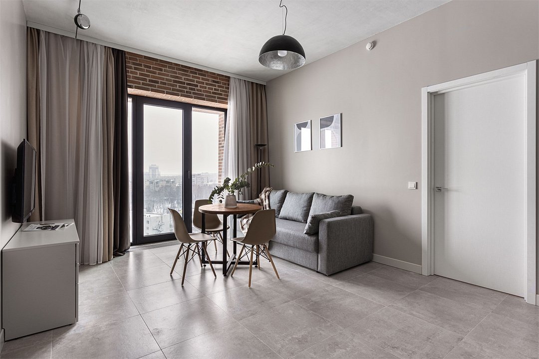 Апартаменты площадью 40м² на 7 или 11 этажах с видом на город для семейной пары с детьми или 4-х гостей — в категории фото двух апартаментов. Высокие потолки, панорамные окна, отделка стен клинкерным кирпичом, звукоизоляция, климатконтроль. В апартаментах есть все необходимое: двуспальная кровать King size в спальне, гардеробная, удобный раскладной диван (ширина 160 см) в кухне-гостиной. Кухня оборудована бытовой техникой (плита, холодильник, чайник, кофемашина, микроволновка), посудой и столовыми принадлежностями. В ванной комнате есть фен, гигиенические принадлежности и набор полотенец. В стоимость проживания не включена ежедневная уборка со сменой постельного белья и полотенец — оплачивается дополнительно по запросу.Услуги и удобства