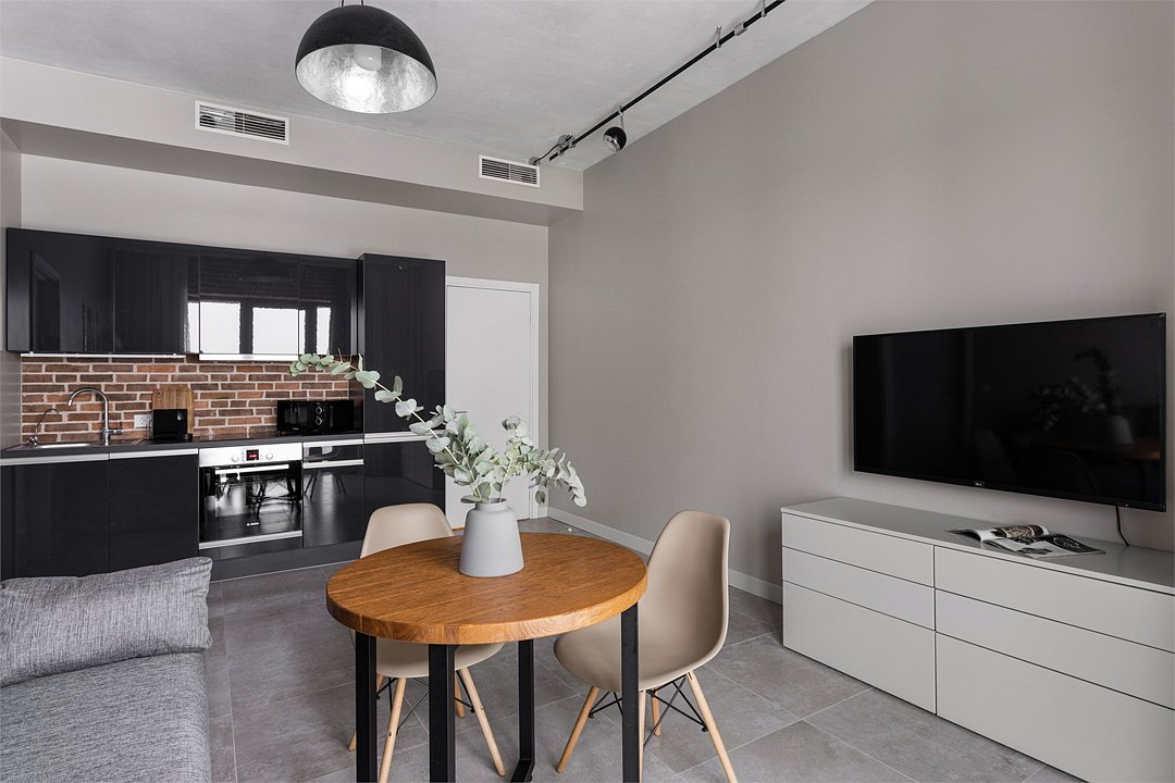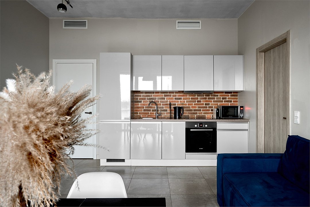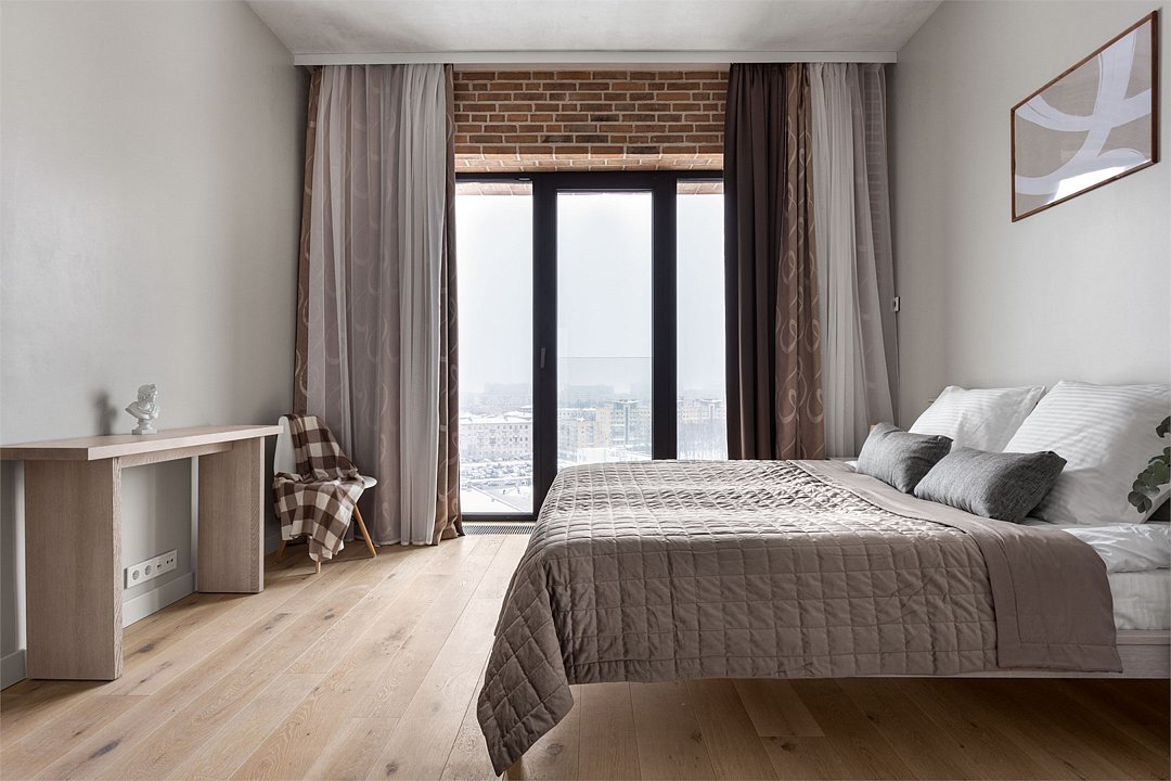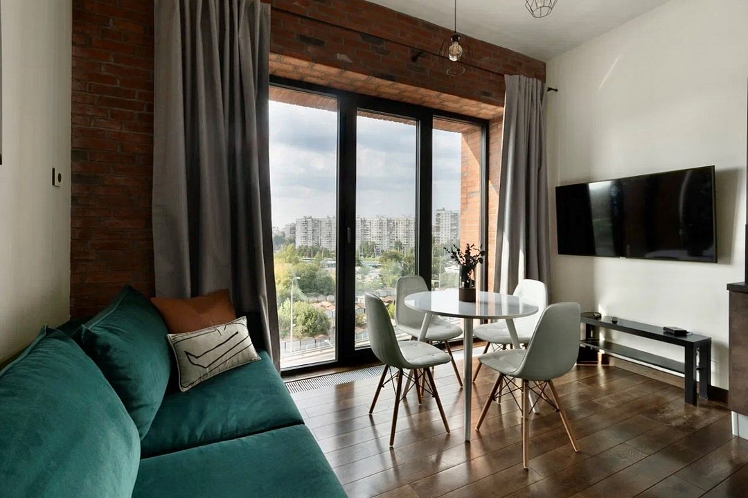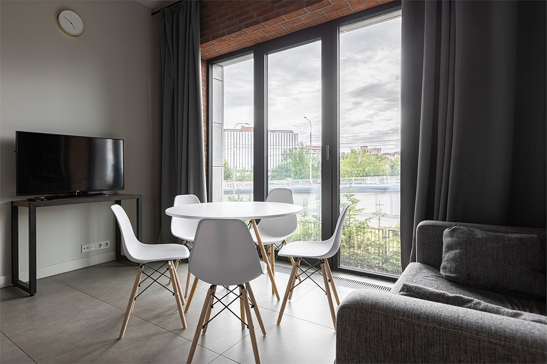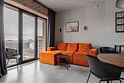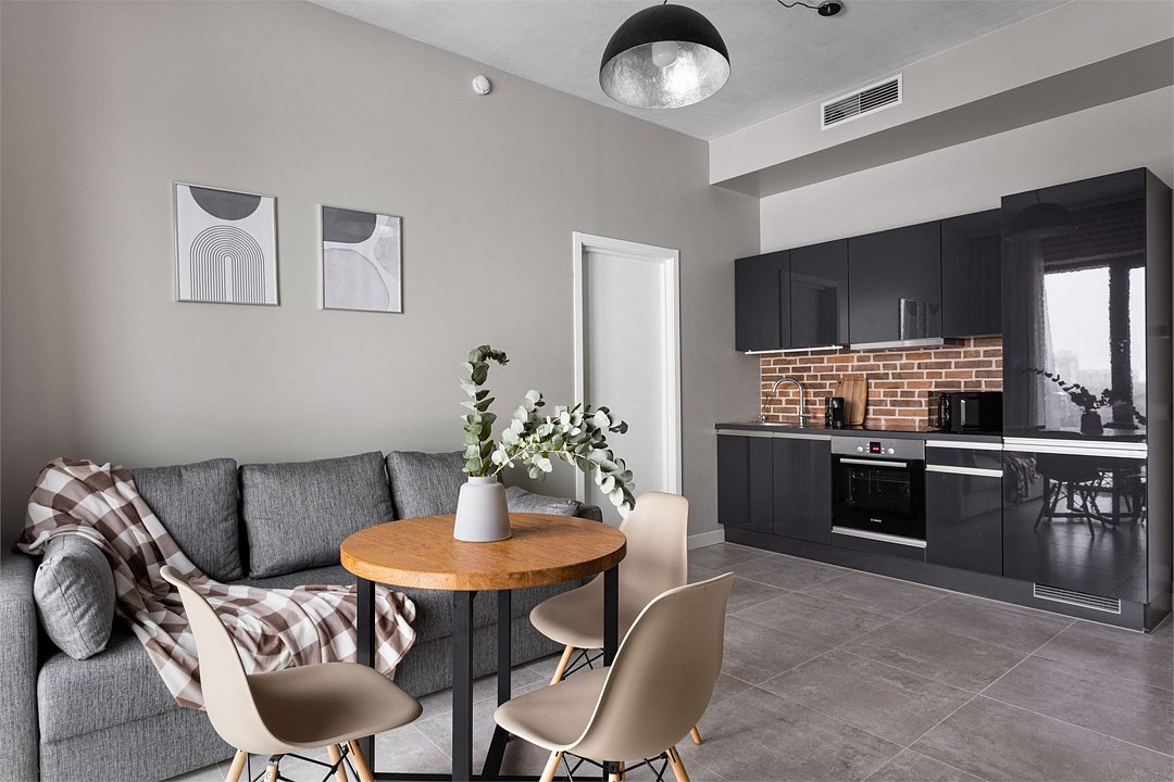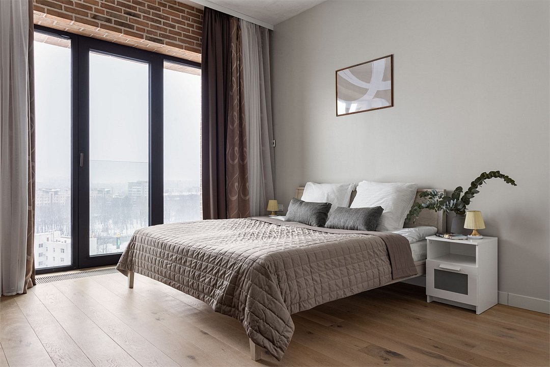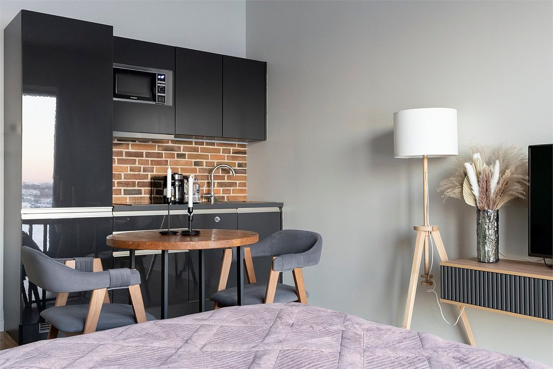 Апартаменты площадью 40м² на 7 или 11 этажах с видом на город для семейной пары с детьми или 4-х гостей — в категории фото двух апартаментов. Высокие потолки, панорамные окна, отделка стен клинкерным кирпичом, звукоизоляция, климатконтроль. В апартаментах есть все необходимое: двуспальная кровать King size в спальне, гардеробная, удобный раскладной диван (ширина 160 см) в кухне-гостиной. Кухня оборудована бытовой техникой (плита, холодильник, чайник, кофемашина, микроволновка), посудой и столовыми принадлежностями. В ванной комнате есть фен, гигиенические принадлежности и набор полотенец. В стоимость проживания не включена ежедневная уборка со сменой постельного белья и полотенец — оплачивается дополнительно по запросу.Услуги и удобства
