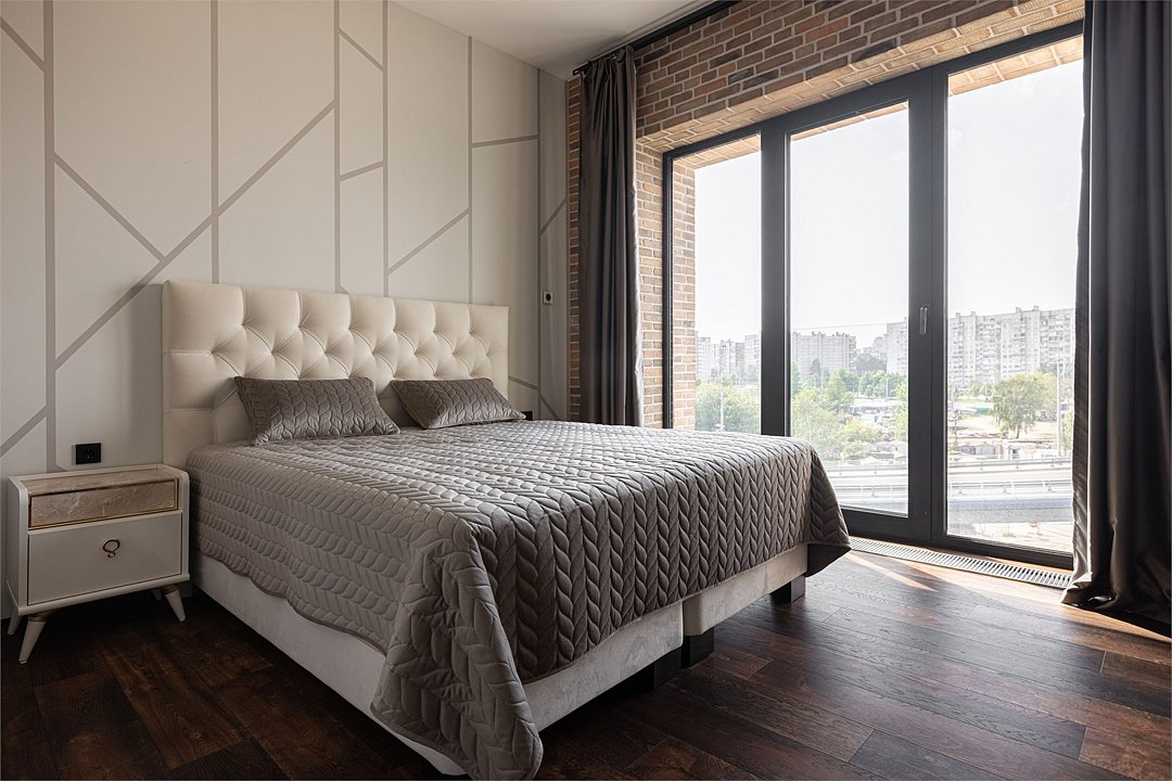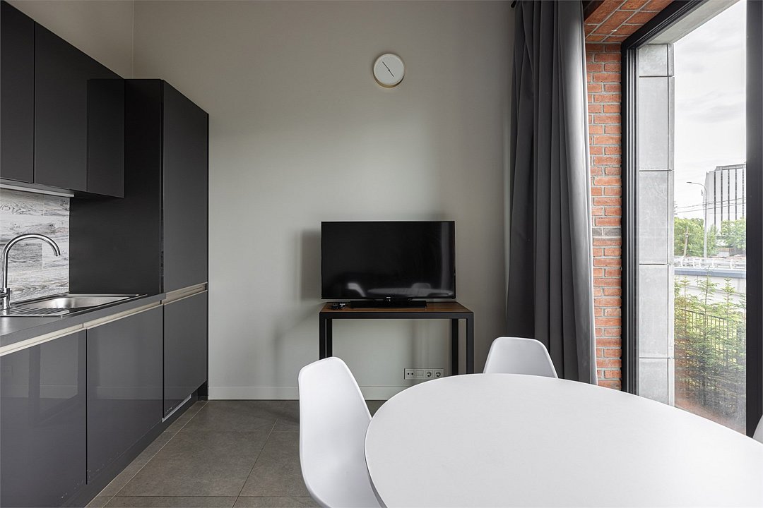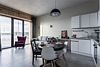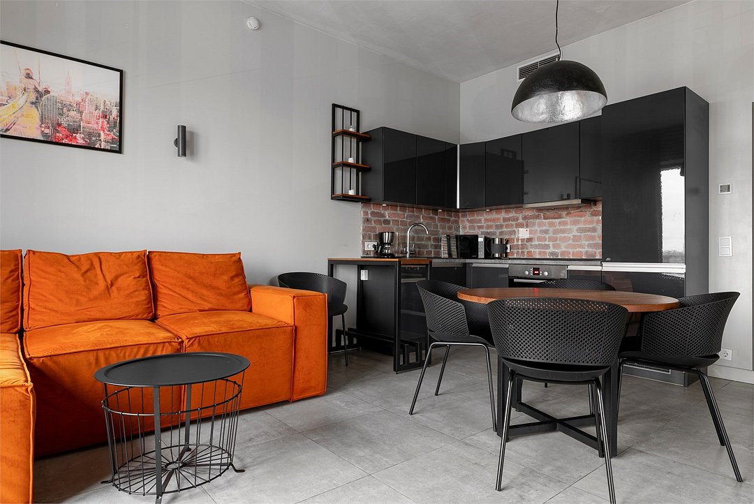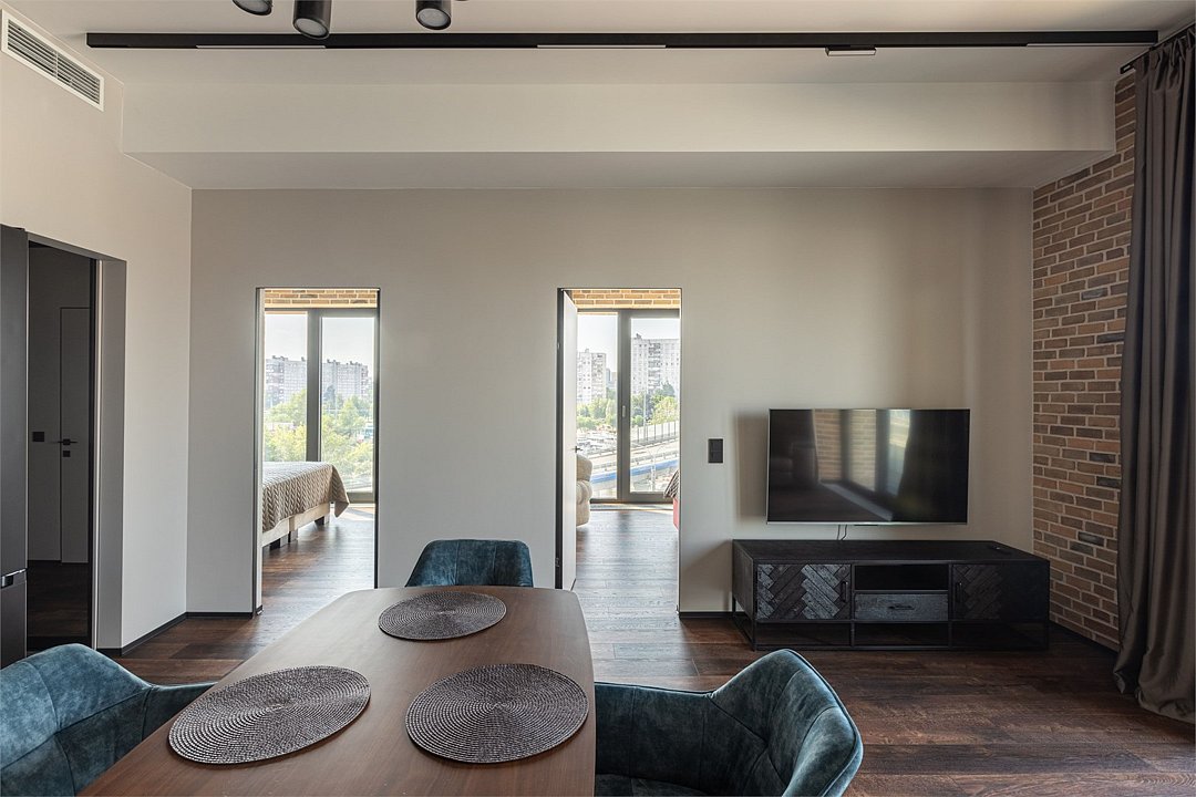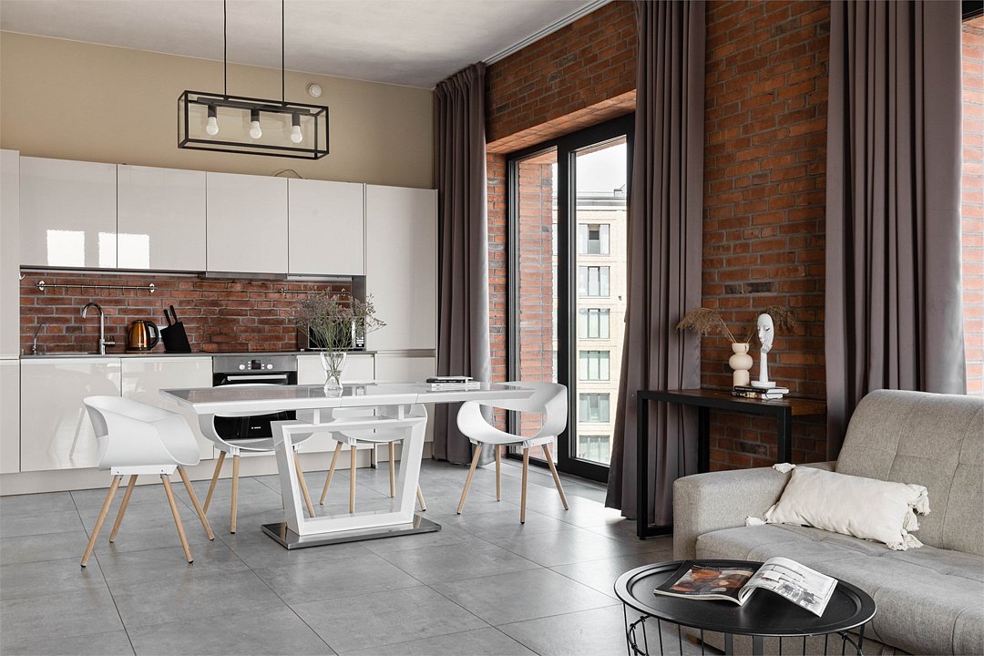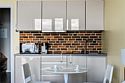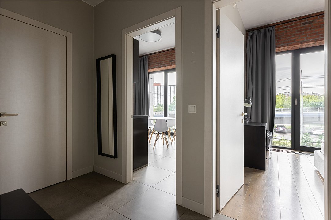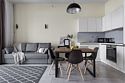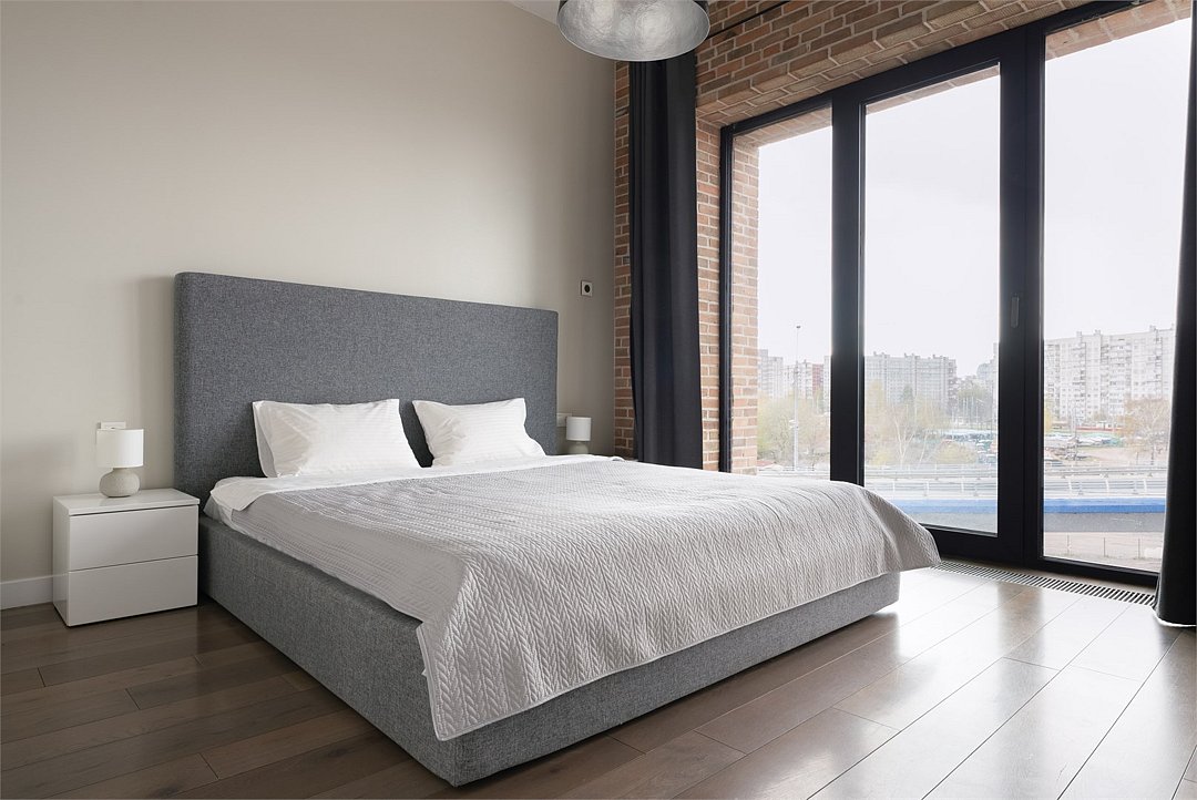 Апартаменты площадью 40м² на 7 или 11 этажах с видом на город для семейной пары с детьми или 4-х гостей — в категории фото двух апартаментов. Высокие потолки, панорамные окна, отделка стен клинкерным кирпичом, звукоизоляция, климатконтроль. В апартаментах есть все необходимое: двуспальная кровать King size в спальне, гардеробная, удобный раскладной диван (ширина 160 см) в кухне-гостиной. Кухня оборудована бытовой техникой (плита, холодильник, чайник, кофемашина, микроволновка), посудой и столовыми принадлежностями. В ванной комнате есть фен, гигиенические принадлежности и набор полотенец. В стоимость проживания не включена ежедневная уборка со сменой постельного белья и полотенец — оплачивается дополнительно по запросу.Услуги и удобства