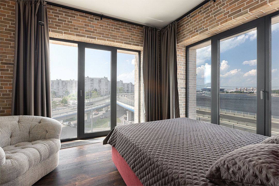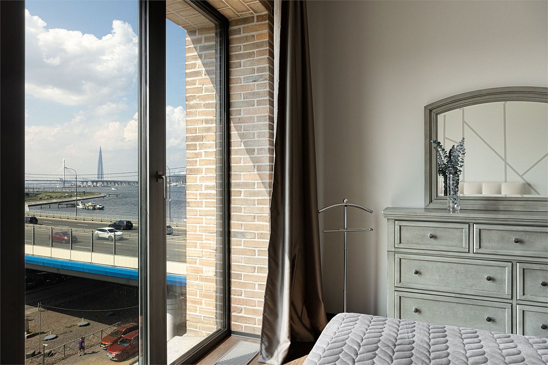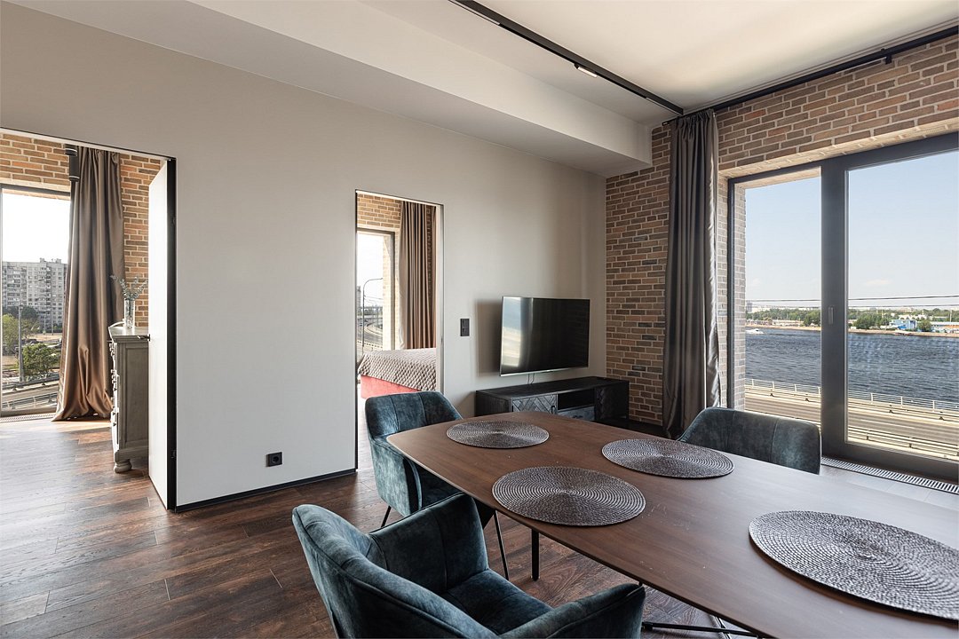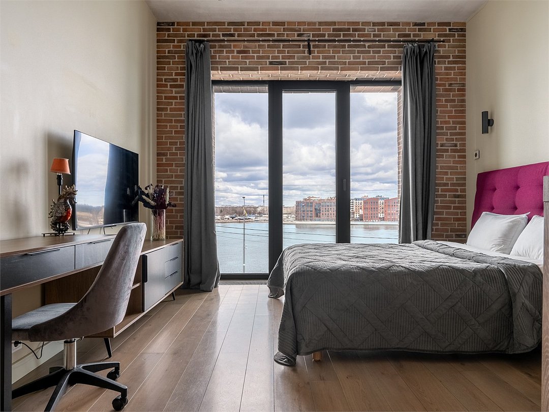 Просторные трехкомнатные Люкс апартаменты на 5 этаже площадью 70м² с шикарным панорамным видом из окон на реку Неву, Газпром Арену и Лахта- Центр для семейной пары с детьми или 5-ти гостей Санкт-Петербурга! Высокие потолки, панорамные окна, потрясающий вид из окон на реку, отделка стен клинкерным кирпичом, звукоизоляция, климатконтроль, ортопедические матрасы — сделают ваш отдых незабываемым! В апартаментах есть все необходимое: две двуспальные кровати в 2-х спальнях с удобными ортопедическими матрасами, мягкий раскладной диван для 5-го гостя в кухне-гостиной, большой телевизор с функцией Smart TV. Кухня оборудована всей бытовой техникой (плита, холодильник, чайник, микроволновка), посудой и столовыми приборами, а также капсульной кофемашиной c приветственным набором капсул. В ванной комнате: душевая, фен, гигиенические принадлежности, набор полотенец, стиральная машина, тапочки. В стоимость проживания не включена ежедневная уборка со сменой постельного белья и полотенец — оплачивается дополнительно по запросу.Услуги и удобства