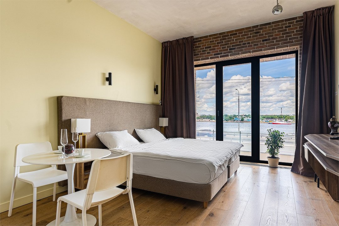 Видовые апартаменты-студии на 4 и 5 этажах с видом из панорамных окон на реку Неву, Газпром Арену и Лахта Центр — прекрасный выбор для одного или двух гостей Санкт-Петербурга! Высокие потолки, панорамные окна, отделка одной из стен клинкерным кирпичом, звукоизоляция, климатконтроль. В апартаментах есть все необходимое: двуспальная кровать (180см*200см) с удобнейшим матрасом, кондиционер, телевизор с цифровым тв, Wi-Fi, обеденная группа, плита, микроволновая печь, холодильник, чайник, посуда, столовые приборы, гардеробная с утюгом и гладильной доской, тапочки, ванная комната с феном, стиральной машиной, гигиеническими принадлежностями и набором полотенец. В стоимость проживания не включена ежедневная уборка со сменой постельного белья и полотенец — оплачивается дополнительно по запросу.Услуги и удобства
