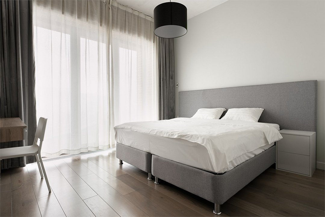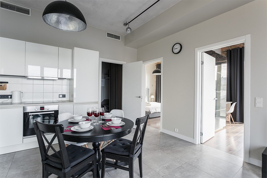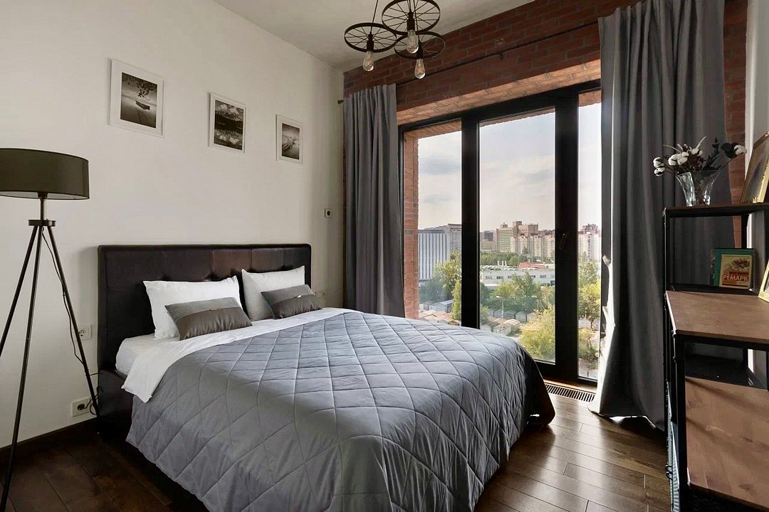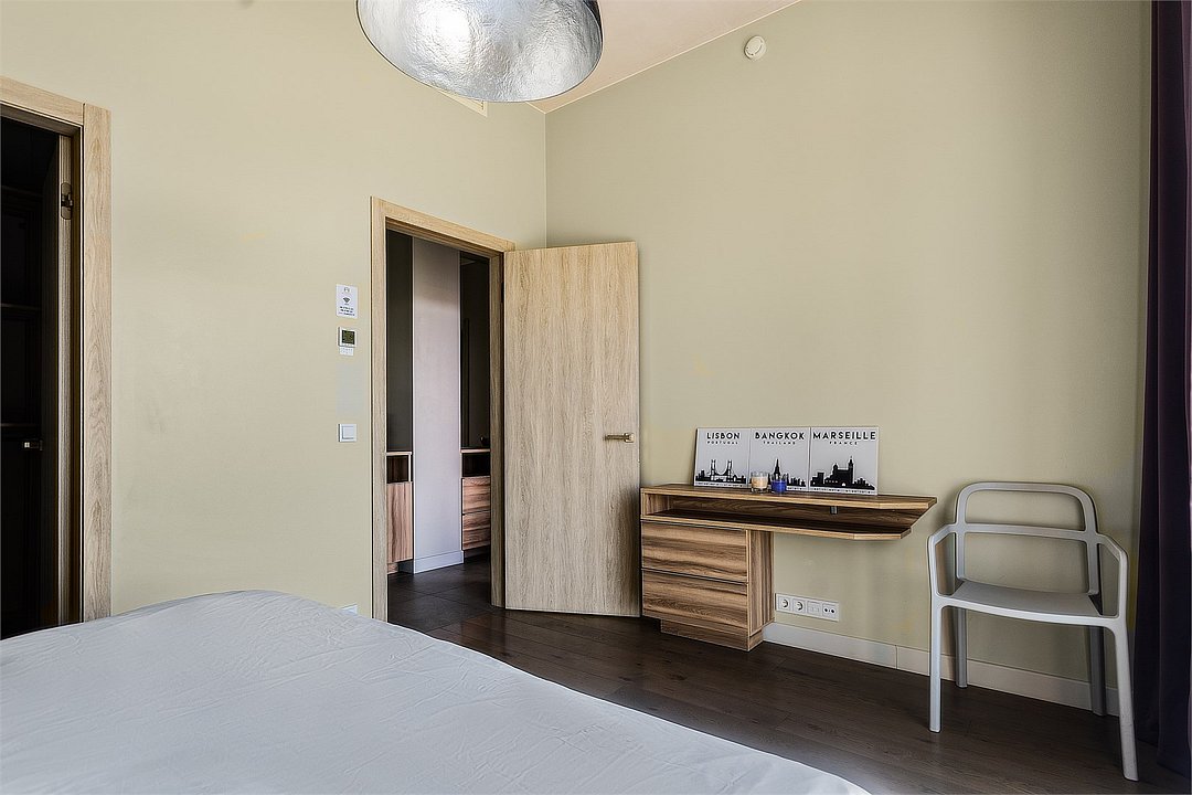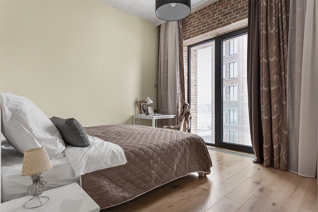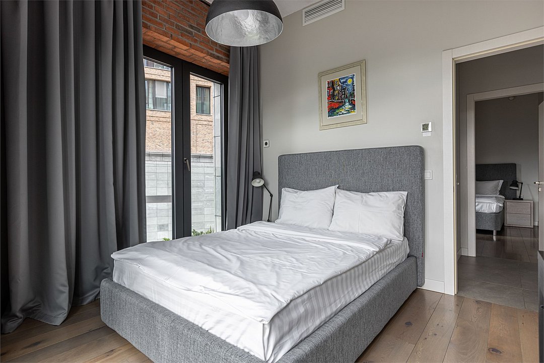Уютный апартамент на 2 этаже с видом на тихий внутренний двор и на город для семейной пары с детьми или 5-ти гостей. Высокие потолки, панорамные окна, отделка стен клинкерным кирпичом, звукоизоляция, климатконтроль. В апартаменте есть все необходимое: две двуспальные кровати в спальнях (180х200 и 160х200), гардеробная, удобный раскладной диван (ширина 120) в кухне-гостиной, техника (плита, холодильник, чайник, стиральная машина), посуда, столовые приборы, душевая, фен, гигиенические принадлежности, набор полотенец, тапочки. В стоимость проживания не включена ежедневная уборка со сменой постельного белья и полотенец — оплачивается дополнительно по запросу.Услуги и удобства