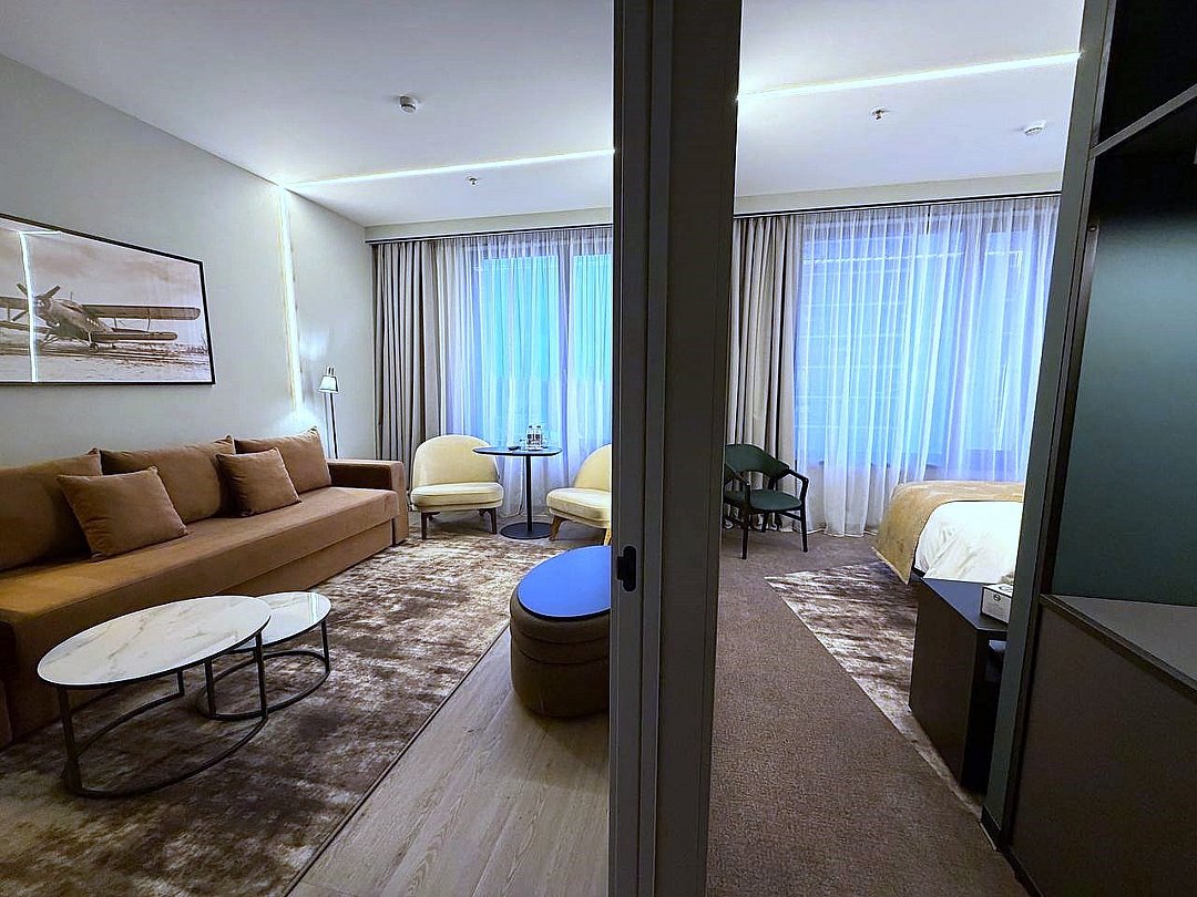 Номер площадью 42 кв.м. с гостиной и отдельной спальней. Просторный двухкомнатный номер оформлен в современном стиле. Продуманный дизайн и современное оснащение номера подарят ощущение исключительного комфорта. В номере: телевизор с интерактивной системой управления, беспроводной интернет, мини-бар, чайная станция, бутилированная вода, гладильные принадлежности и сейф. Ванная комната оснащена душевой кабиной, набором индивидуальных банных принадлежностей, а также феном. Есть возможность разместить кроватку для ребенка до 3х лет. В стоимость проживания включено безлимитное посещение гидротермального комплекса по предварительной записи (для посещения с детьми действуют ограничения)Услуги и удобства