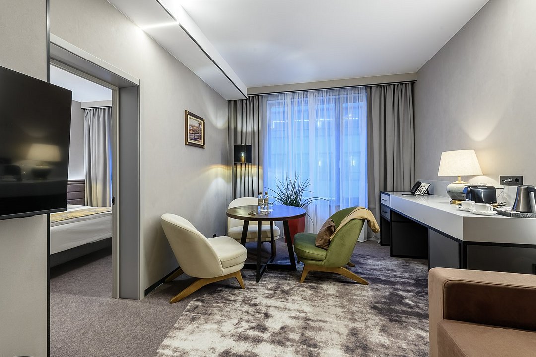 Просторный двухкомнатный номер отличает изысканность и современный комфорт. Натуральные материалы в отделке, благородные ткани и утонченная фурнитура. В номере: телевизор с интерактивной системой управления в каждой комнате, беспроводной интернет, мини-бар, чайная станция, бутилированная вода, гладильные принадлежности и сейф. Ванная комната оснащена ванной, набором индивидуальных банных принадлежностей, а также феном. Есть возможность разместить кроватку для ребенка до 3х лет, либо дополнительную кровать. Для гостей комплиментарно: -доступ в фитнес зал (24/7) -безлимитный доступ в спа-зону (бассейн, комната отдыха, сауна) -Трансфер аэропорт Пулково / железнодорожный вокзал - отель - Для путешествующих на автомобиле наземная парковка предоставляется бесплатно при наличии мест. Количество гостей: до 3-х гостейУслуги и удобства