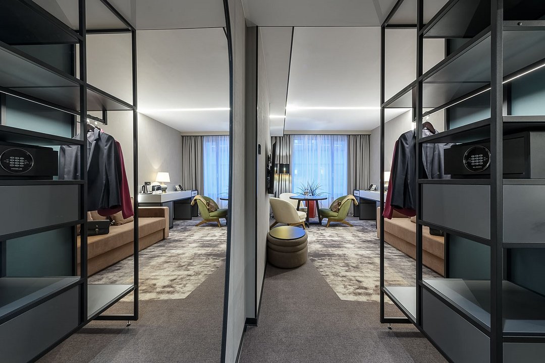 телевизор, интерактивное телевидение, Wi-Fi, фен, электронные замки, кофемашина, утюг, ванная комната, душевая кабина, ванна, дополнительный санузел, халаты, банные полотенца, тапочки, гигиенические средства, косметические средства, кровать «Queen size», гладильная доска, гардеробная, вешалки, зеркало, комод, звуконепроницаемые стены и окна, информационная карта, меню, сейф, минеральная вода, раковина, гостиная зона, ковровое покрытие, вид на город, туалет, раскладной диван, внутренний телефон, номер для некурящих, фанкойл, неограниченное посещение СПА, гигиенический душ, чайная станция, услуги прачечной (платно), мини-бар (платно), шапочка для душа, мыло, затемняющая штора, зеркало в полный рост, прачечная (за дополнительную плату), можно с питомцамиВ гостиничном номере