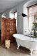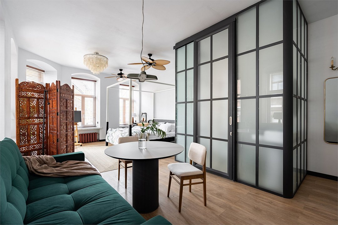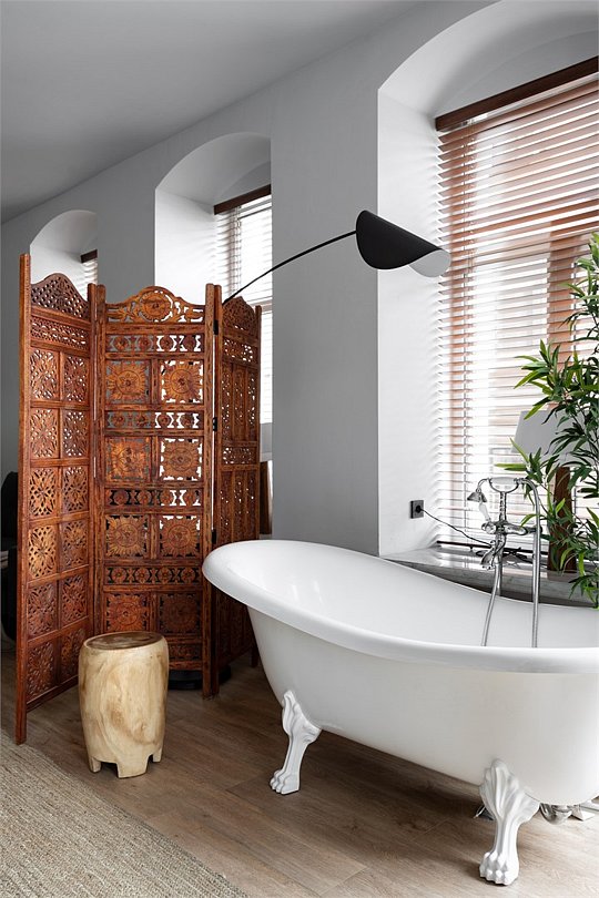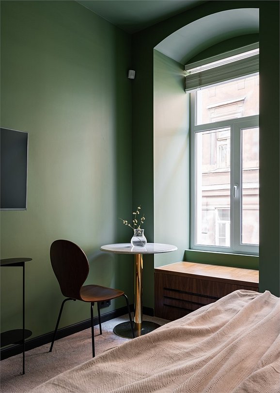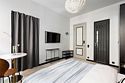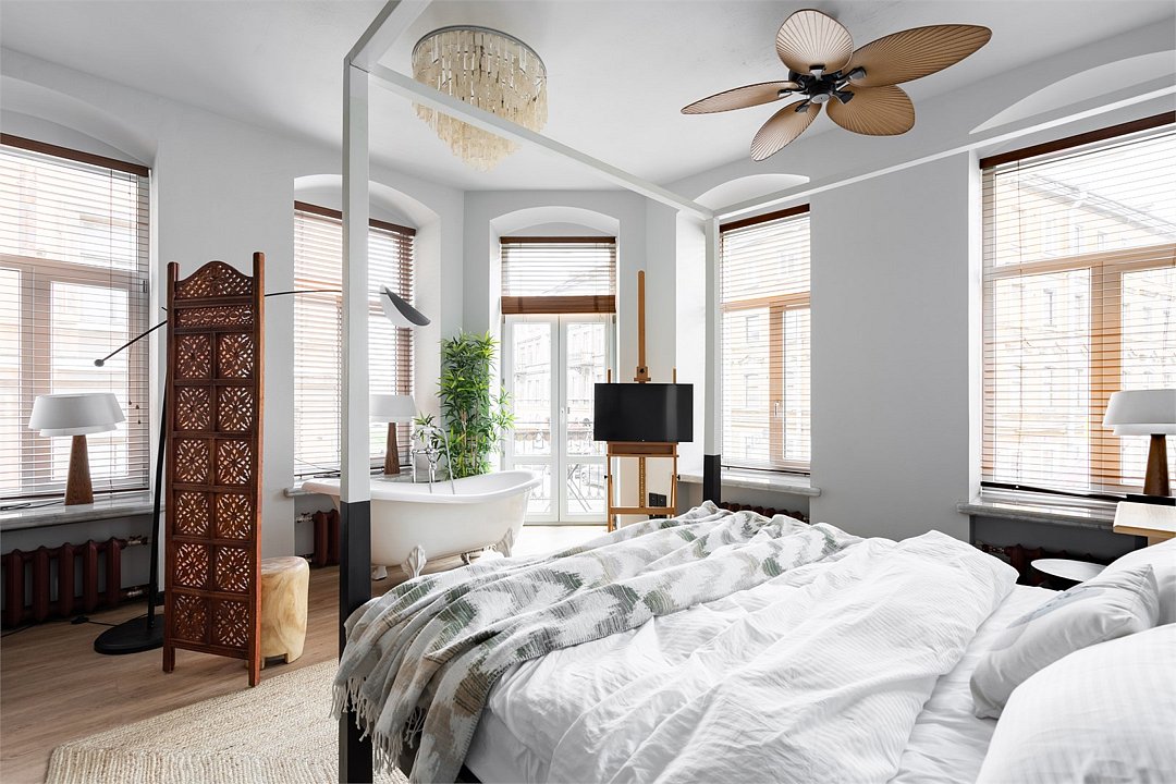 Номер Люкс с ванной прямо в спальне. В комнате идеальный свет благодаря семи окнам на юго-запад, а деревянные жалюзи усиливают спецэффекты петербургского солнца. Кровать со стойками, тропические вентиляторы, индийская ширма, белый мрамор и орнаментальная плитка возвращают к теме путешествий.Услуги и удобства
