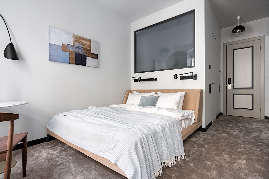 телевизор, Wi-Fi, интернет, светильник, настольные лампы, система безопасности, электронные замки, микроволновая печь, санузел, теплый пол, халаты, банные полотенца, тапочки, гигиенические средства, двуспальная кровать, стулья, вешалки, зеркало, эксклюзивная мебель, чайный набор, чайник, унитаз, раковина, ковровое покрытие, отопление, душ, вид на город, высокие потолки, стул, стол, тумба, туалетные средства, мини-холодильник, шкаф-купе, теплые полы, usb портВ аппартаментах
