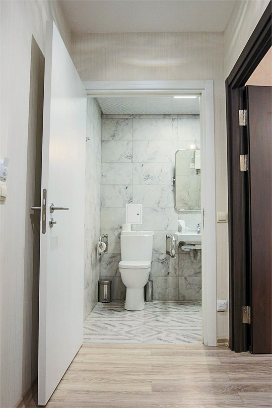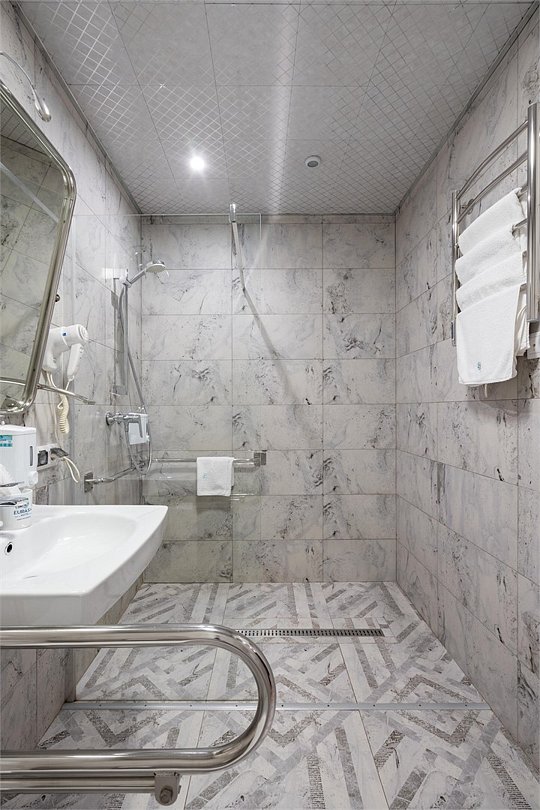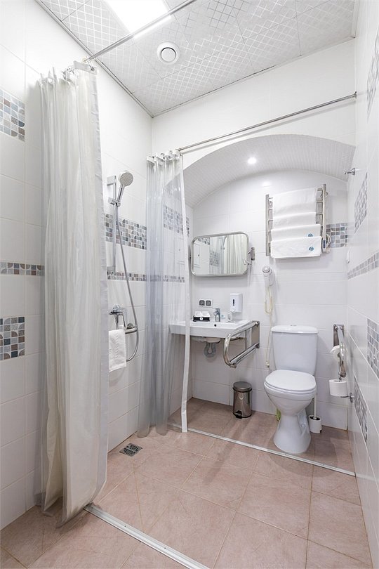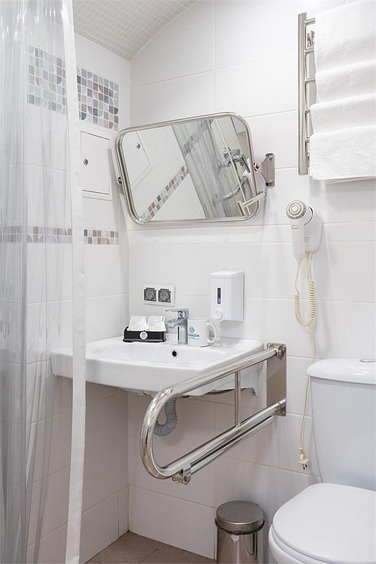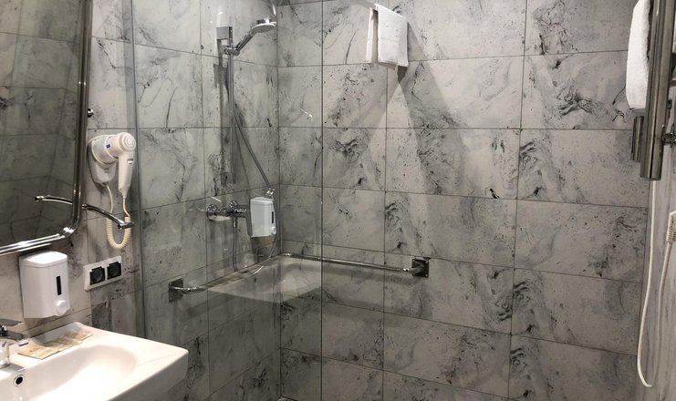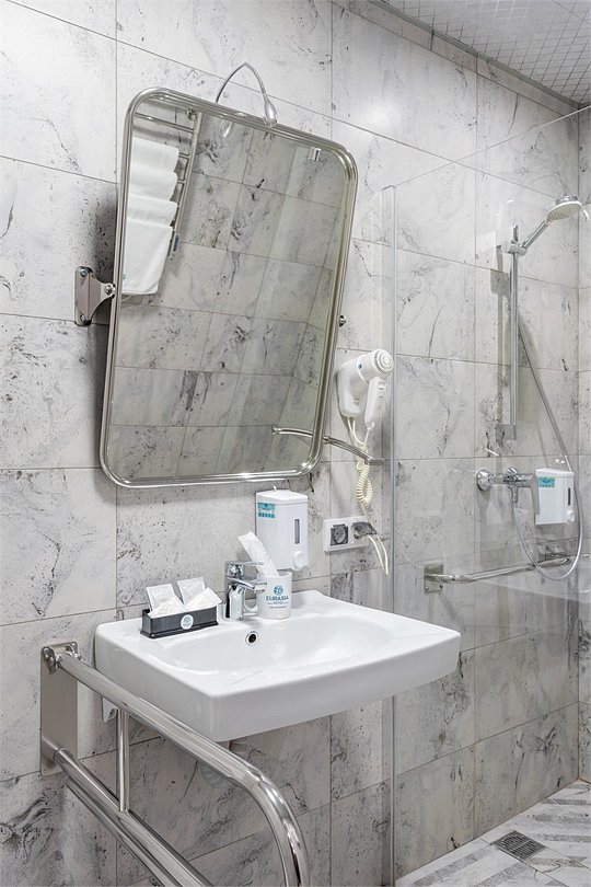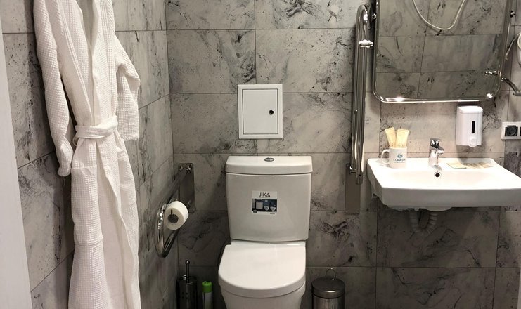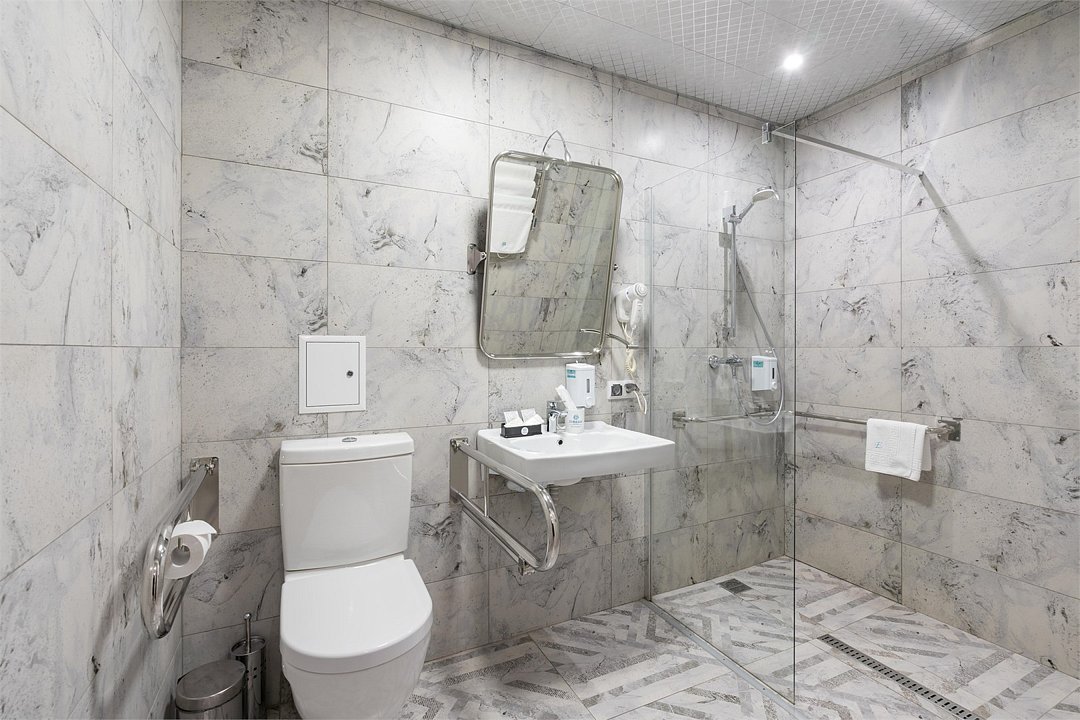 Также в отеле созданы условия для приема гостей с ограниченными возможностями. Специально оборудованы два номера - эконом Арт и Делюкс Арт. Безбарьерное пространство предусматривает широкие дверные проемы, санузлы со специальными поручнями, низкие раковины, сидения, кнопки или телефоны для вызова персонала, возможность подъехать на коляске к кровати или столику.