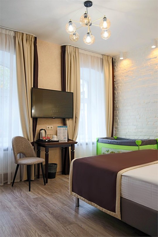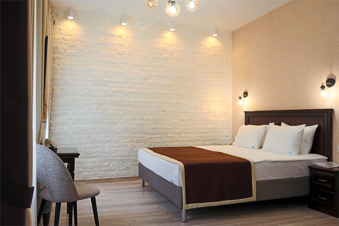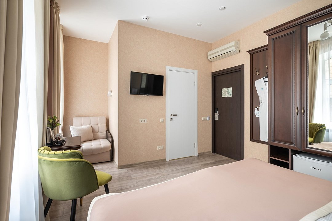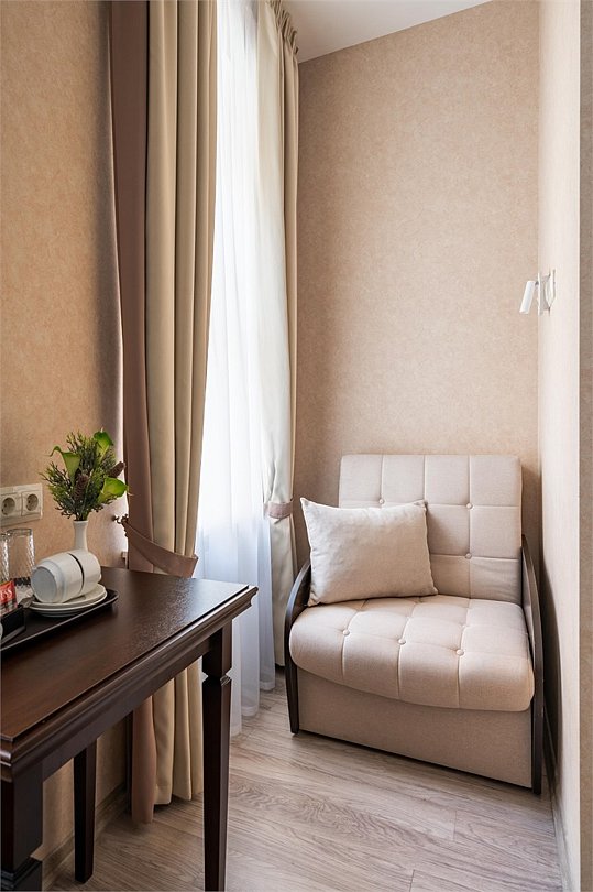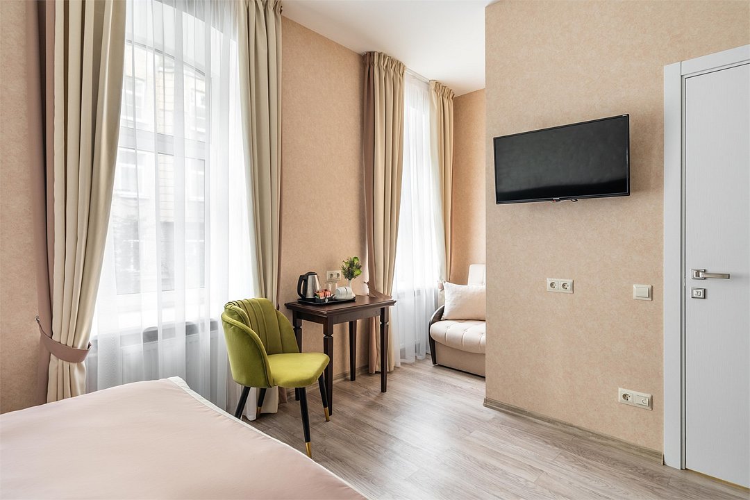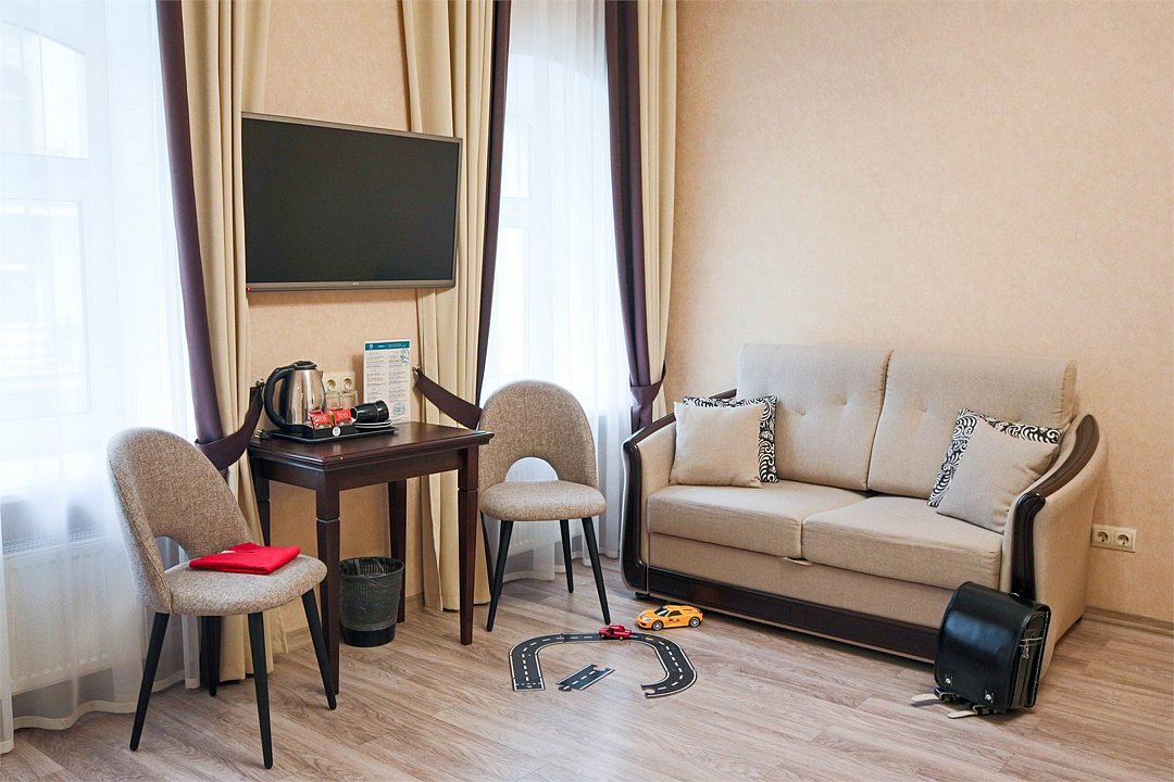 Современный комфортабельный номер класса Джуниор Сюит, выполненный по эксклюзивному дизайн-проекту в нейтральных тонах с использованием натуральных материалов. Изюминка номера - стена декорированная натуральным туфом или историческая стена здания заботливо сохраненная для гостей. Ортопедический матрас с функцией памяти и звуконепроницаемые двери будут способствовать спокойному сну. Теплые полы, гигиенический душ, система обеззараживания воздуха, умный режим безопасности несомненно создадут высокий уровень комфорта и защищенности. При заезде, в номере вас будут ожидать зубной и бритвенный наборы, гель, шампунь, мыло и шапочка для душа. Для любителей свободы и открытого пространства рекомендуем данный номер на 4 этаже отеля. В номере имеется смарт ТВ с плоским экраном, холодильник, гостиный уголок. При необходимости диван может быть трансформирован в дополнительное спальное место. Номер рекомендован для комфортного проживания семейных пар и деловых людей, приехавших в командировку. Один из номеров данной категории оборудован для размещения маломобильного гостя - колясочника: широкие дверные проемы, поручни и наклонное зеркало, безбарьерная среда в санузле и специальные занавеси для комфортного и безопасного приема водных процедур непосредственно в специальной коляске. Номер также оснащен дополнительными поручнями, опорами, специализированным раскладным столиком. При бронировании данного номера Вам необходимо оставить депозит в размере 1000 рублей. При выезде, если имущество данного номера не пострадало, депозит возвращается в полном объеме. Мебелировка номера может незначительно отличаться.Услуги и удобства