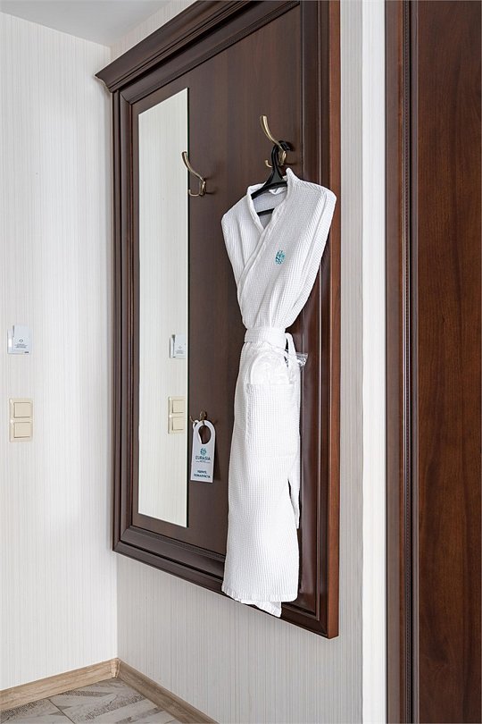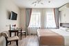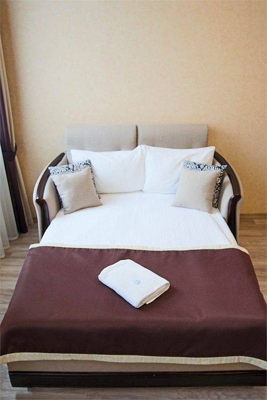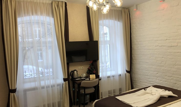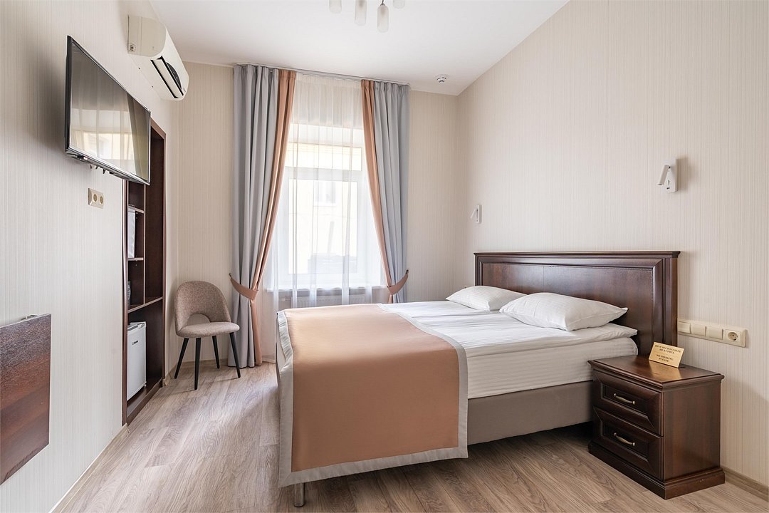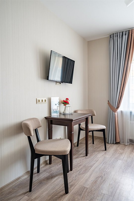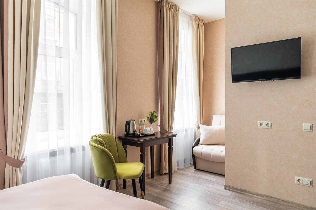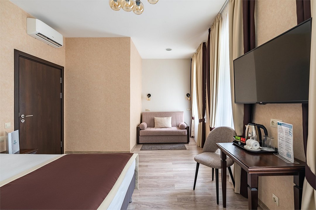 Современный комфортабельный номер класса Джуниор Сюит, выполненный по эксклюзивному дизайн-проекту в нейтральных тонах с использованием натуральных материалов. Изюминка номера - стена декорированная натуральным туфом или историческая стена здания заботливо сохраненная для гостей. Ортопедический матрас с функцией памяти и звуконепроницаемые двери будут способствовать спокойному сну. Теплые полы, гигиенический душ, система обеззараживания воздуха, умный режим безопасности несомненно создадут высокий уровень комфорта и защищенности. При заезде, в номере вас будут ожидать зубной и бритвенный наборы, гель, шампунь, мыло и шапочка для душа. Для любителей свободы и открытого пространства рекомендуем данный номер на 4 этаже отеля. В номере имеется смарт ТВ с плоским экраном, холодильник, гостиный уголок. При необходимости диван может быть трансформирован в дополнительное спальное место. Номер рекомендован для комфортного проживания семейных пар и деловых людей, приехавших в командировку. Один из номеров данной категории оборудован для размещения маломобильного гостя - колясочника: широкие дверные проемы, поручни и наклонное зеркало, безбарьерная среда в санузле и специальные занавеси для комфортного и безопасного приема водных процедур непосредственно в специальной коляске. Номер также оснащен дополнительными поручнями, опорами, специализированным раскладным столиком. При бронировании данного номера Вам необходимо оставить депозит в размере 1000 рублей. При выезде, если имущество данного номера не пострадало, депозит возвращается в полном объеме. Мебелировка номера может незначительно отличаться.Услуги и удобства