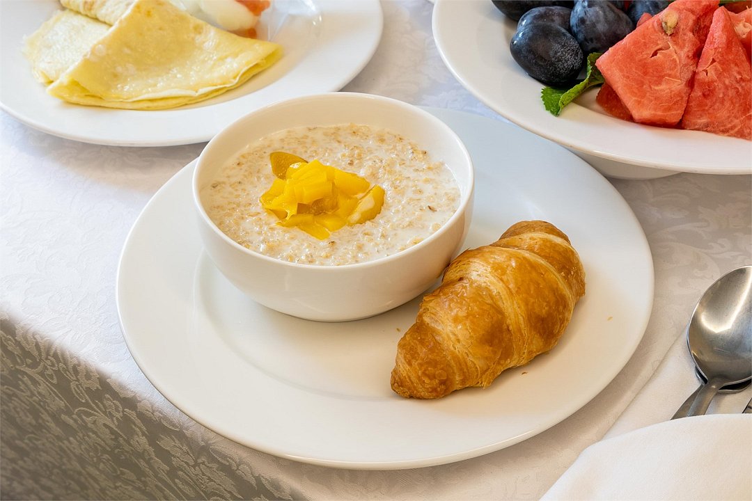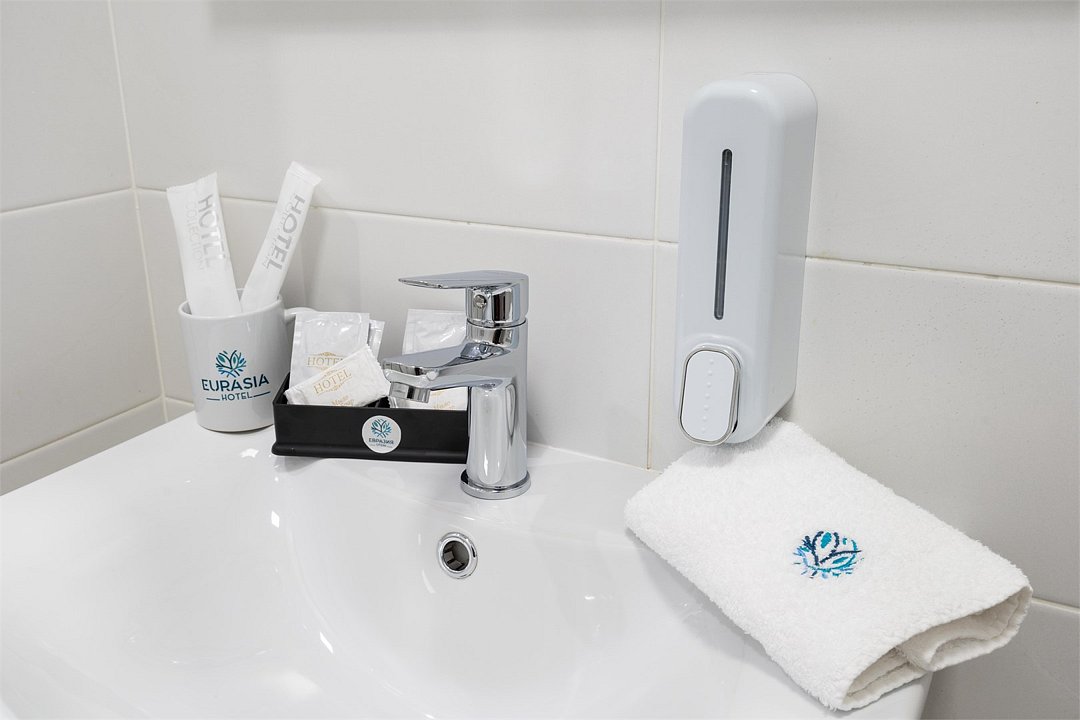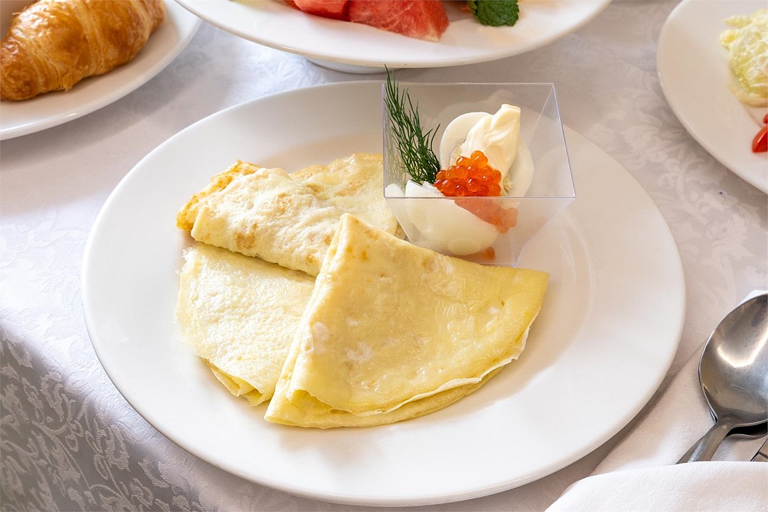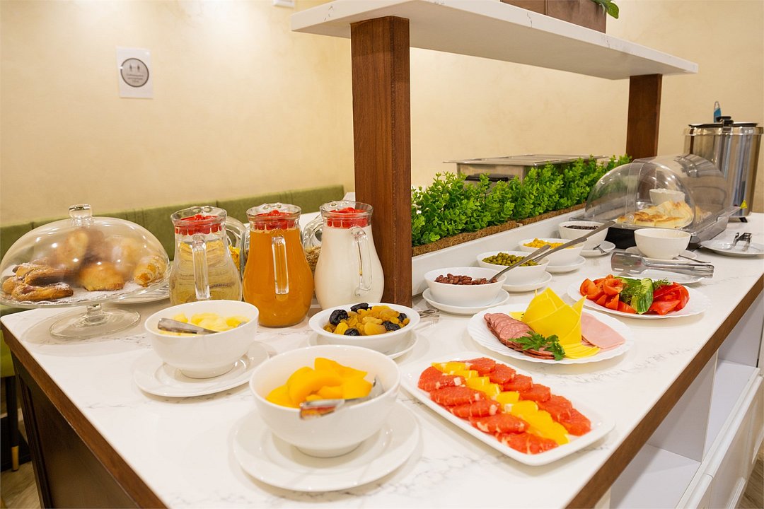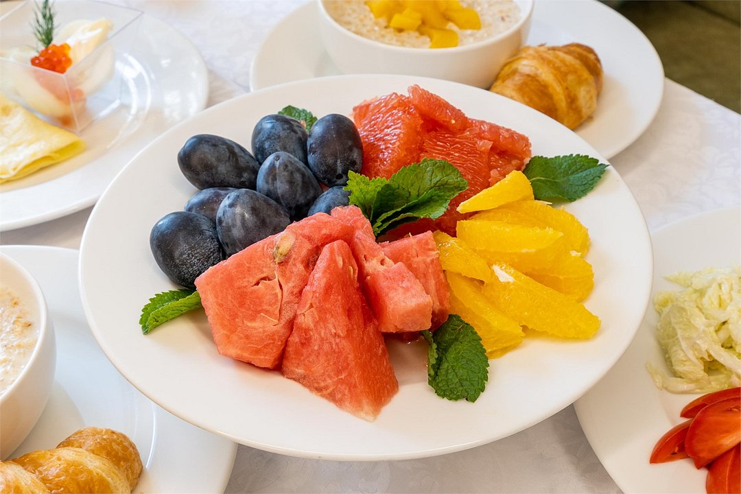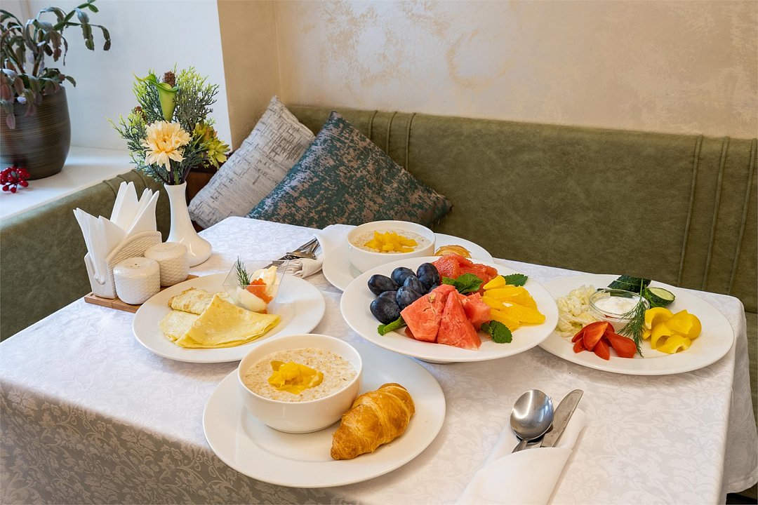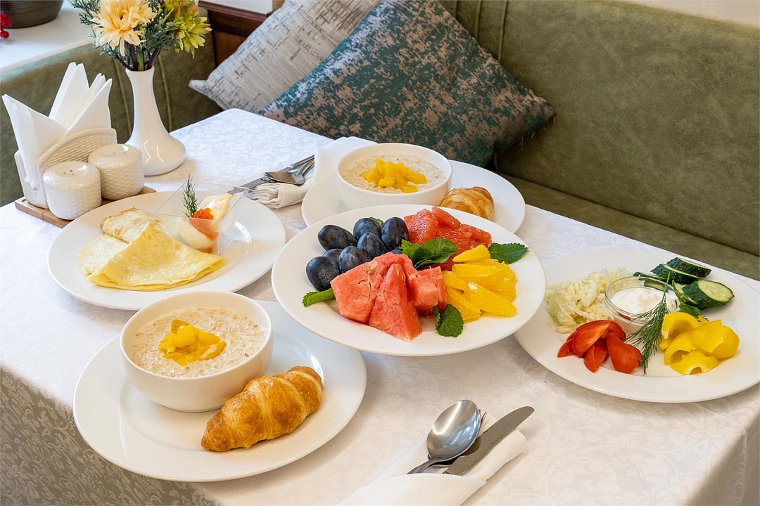 Завтрак сервируется каждое утро с 08:00 до 11:00 для гостей Отеля. Предлагаются горячие блюда: каша, омлет, яичница, сосиски, блины в ассортименте, круассаны, сырная и колбасная нарезки, мюсли и хлопья, свежие овощи и фрукты, йогурты, джемы, печенье. Напитки: кофе, чай, молоко, соки. Отель Евразия предоставляет для своих гостей сытный сбалансированный завтрак на любой вкус. Из предложенного меню гости могут выбрать любые блюда, в зависимости от настроения, вкусовых предпочтений и образа жизни.