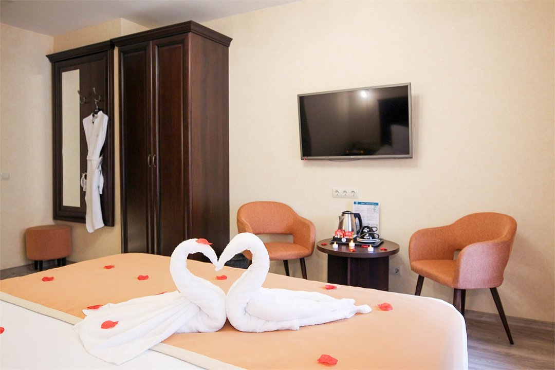 Современный комфортабельный номер, выполненный по эксклюзивному дизайн-проекту в нейтральных тонах с использованием натуральных материалов. Ортопедический матрас с функцией памяти и звуконепроницаемые двери будут способствовать спокойному сну. Теплые полы, гигиенический душ, умный режим безопасности несомненно создадут высокий уровень комфорта и защищенности. При заезде, в номере вас будут ожидать зубной набор, гель, шампунь, мыло и шапочка для душа. В номере имеется полноценное рабочее место, оборудованное необходимыми розетками и разъемами для подключения ваших гаджетов, а также смарт ТВ с плоским экраном, холодильник, гостиный уголок. При необходимости раскладное кресло может быть использовано в качестве дополнительного спального места. В номере сервируется чай, гостям предлагается чайный набор. Номер рекомендован для комфортного проживания деловых людей, приехавших в командировку и семейных пар. При бронировании данного номера Вам необходимо оставить депозит в размере 1000 рублей. При выезде, если имущество данного номера не пострадало, депозит возвращается в полном объеме. Мебелировка номера может незначительно отличаться.Услуги и удобства