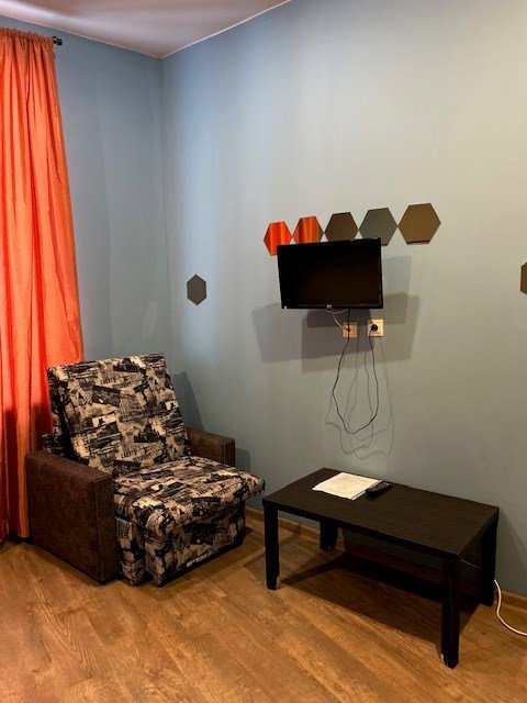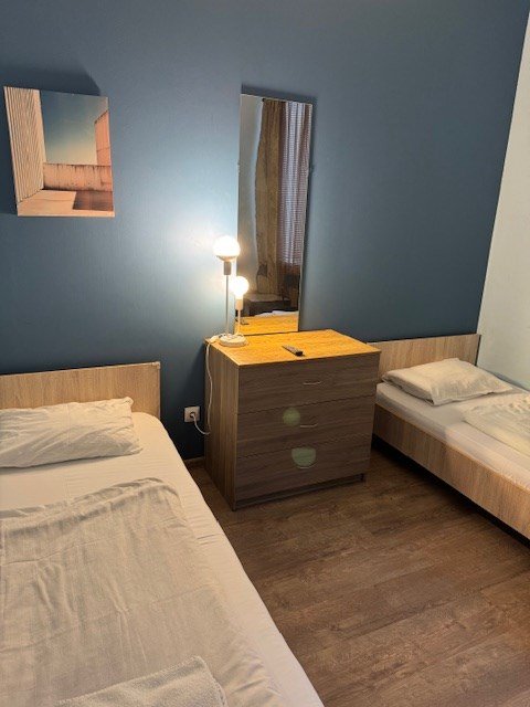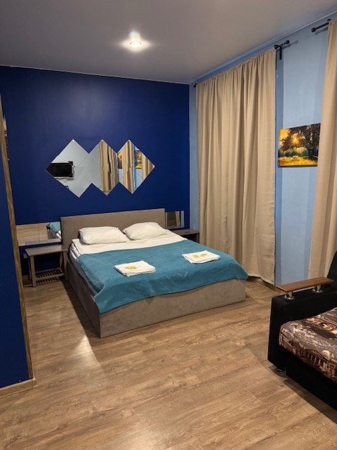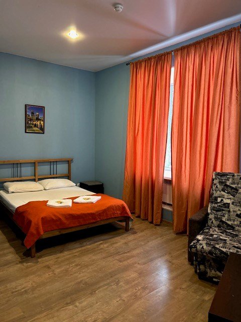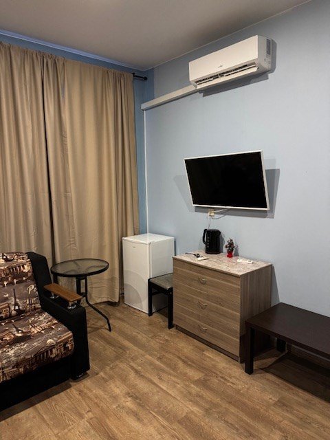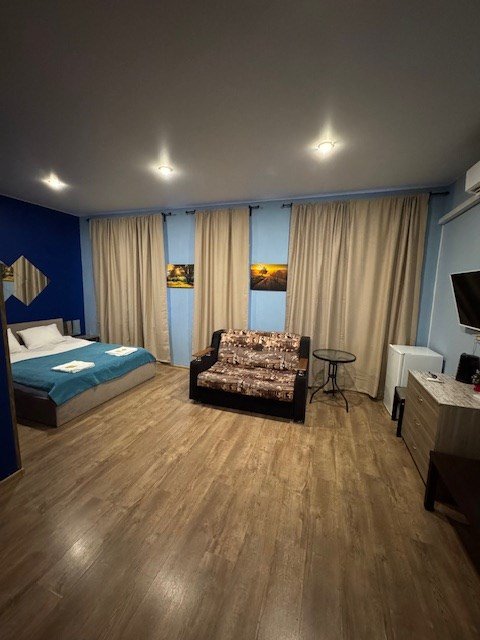 Трехместный номер с двуспальной кроватью и двуспальным диваном. В номере имеются холодильник, телевизор, кондиционер, шкаф, стол, стулья, торшер, исправный интернет, душевая и санузел в номере.Услуги и удобства