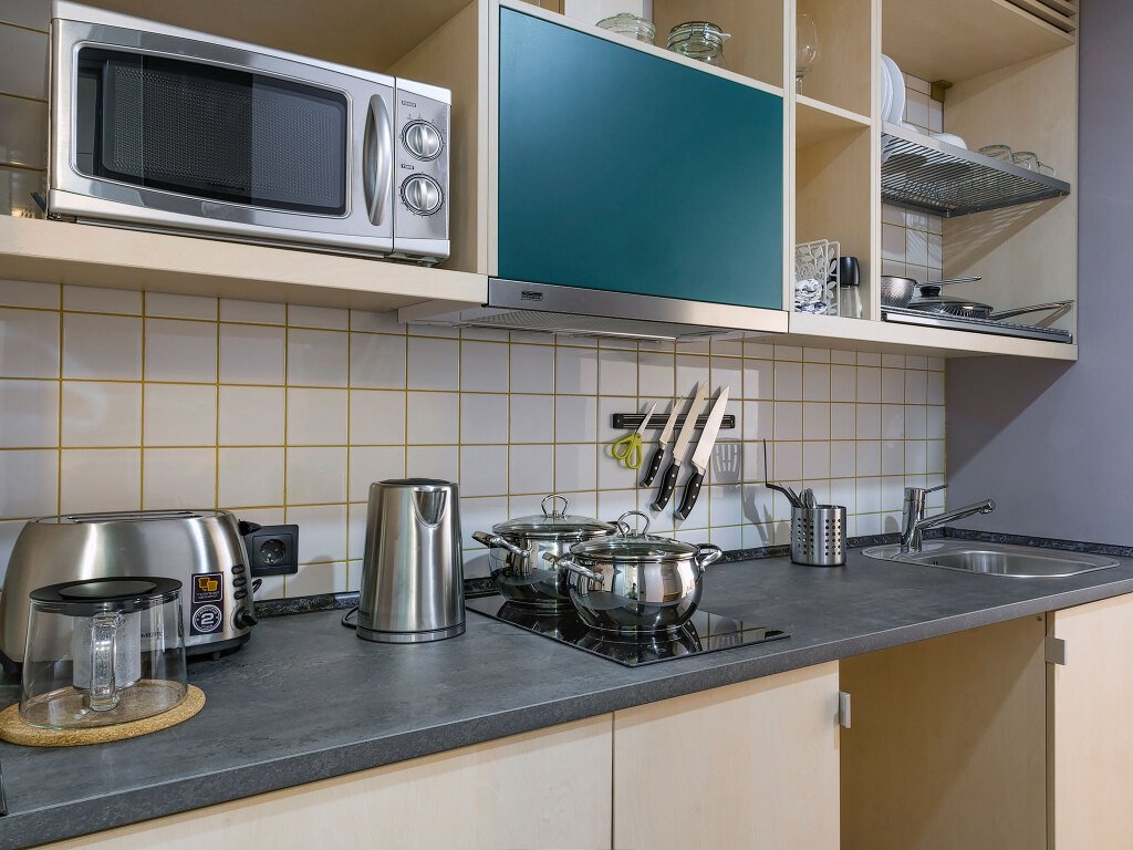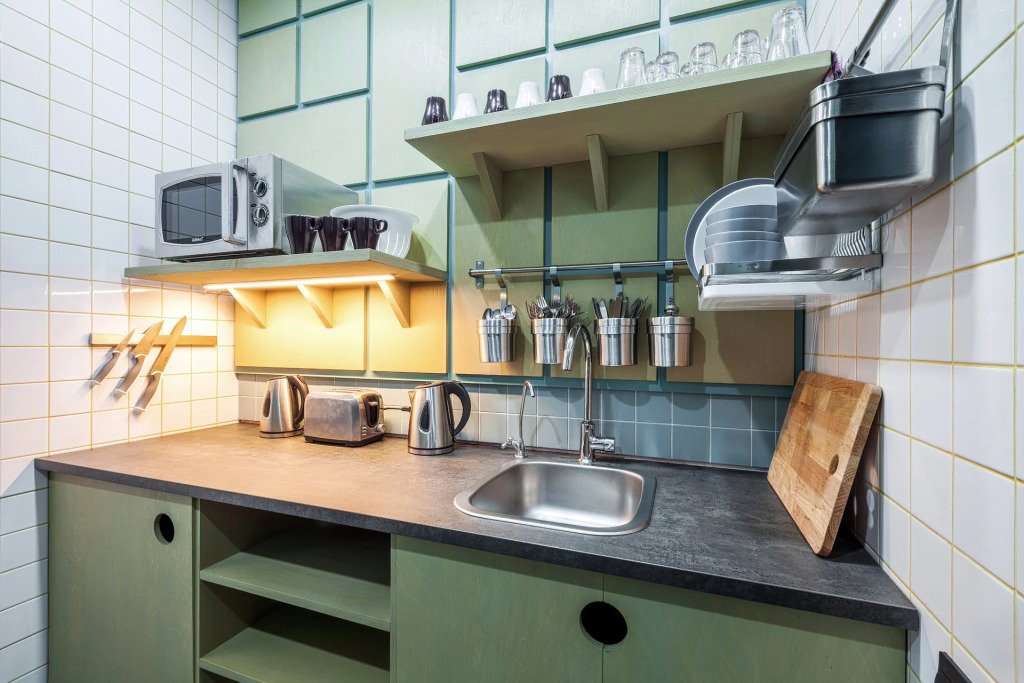 На каждом этаже есть небольшая кухня, где имеются посуда, микроволновая печь и кран с фильтрованной питьевой водой. На четвёртом этаже расположено кафе, где гости могут позавтракать или перекусить после насыщенного дня в городе. Имеется прачечная самообслуживания.
