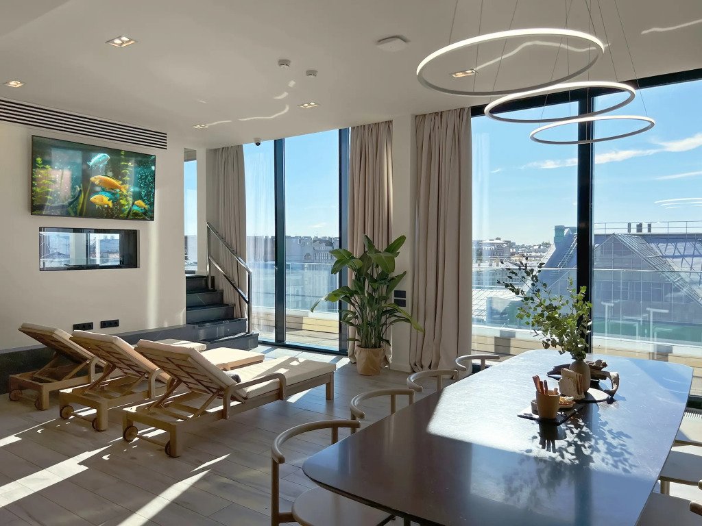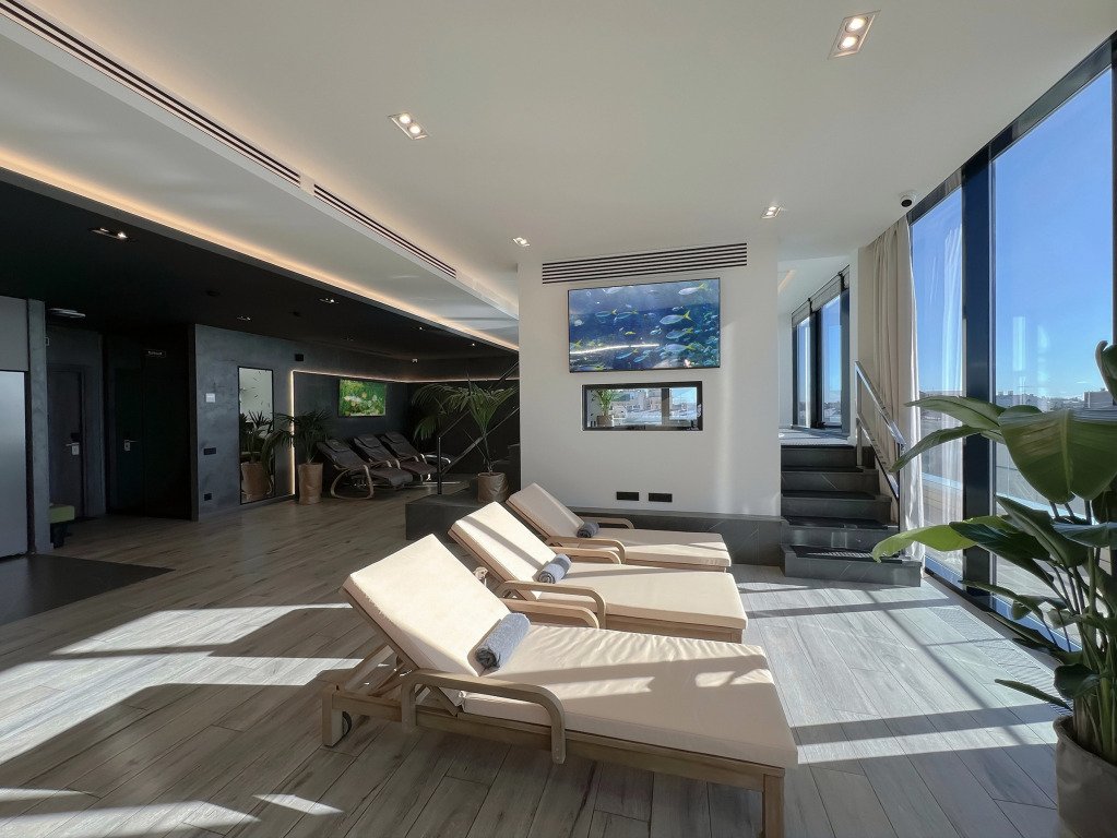 На седьмом этаже отеля расположено общественное спа-пространство Skyfall, где можно провести 2.5 ч на коллективном сеансе, погрузившись в атмосферу спа-ухода на фоне видов Петербурга.