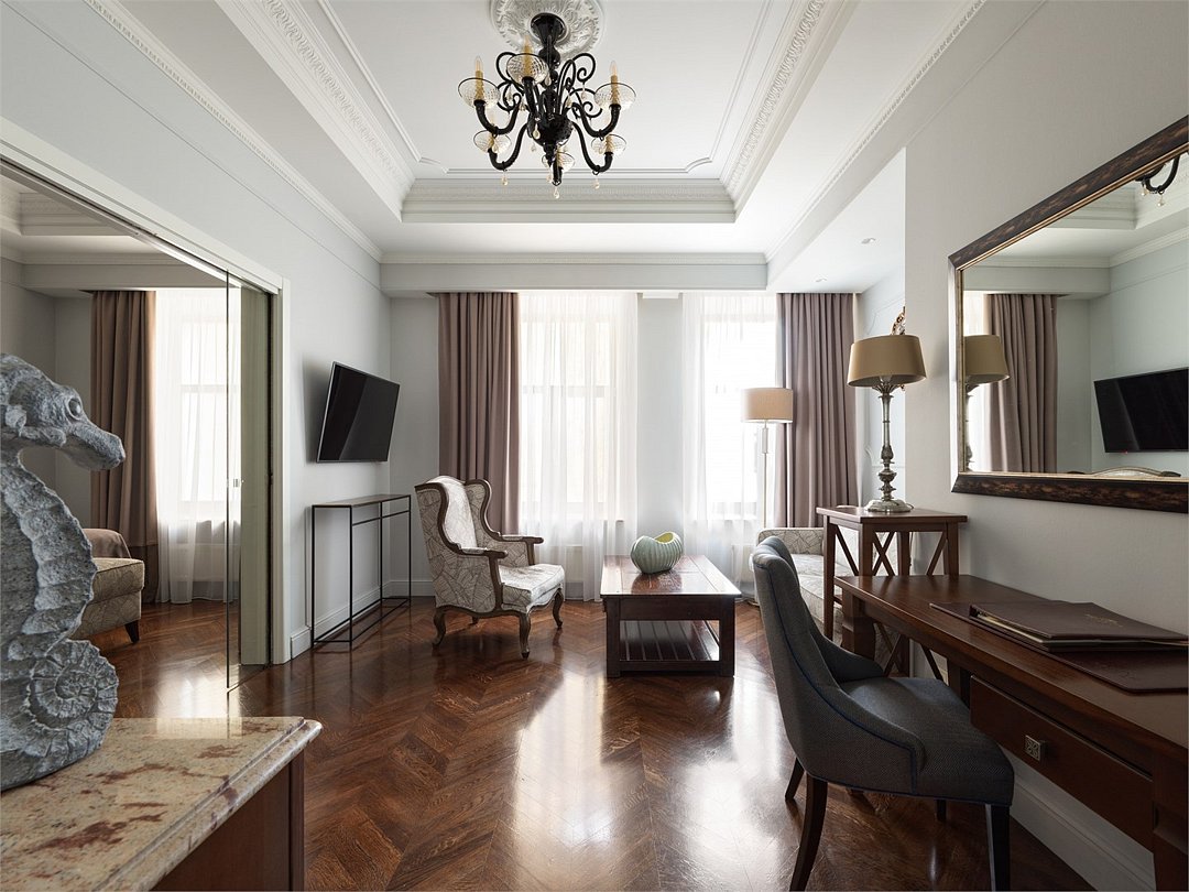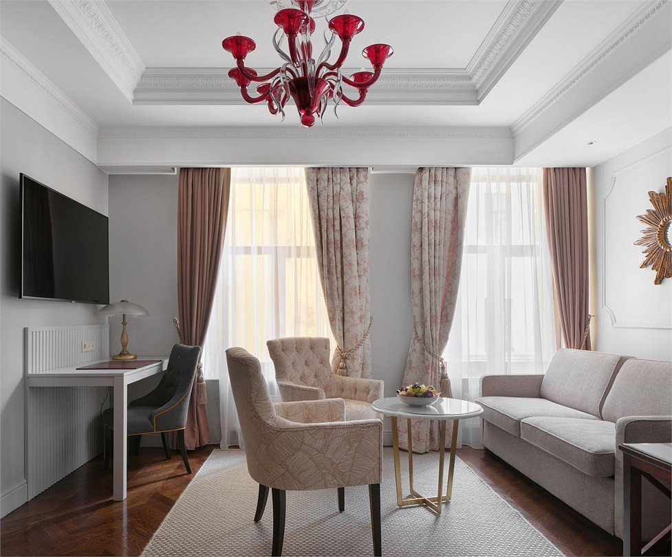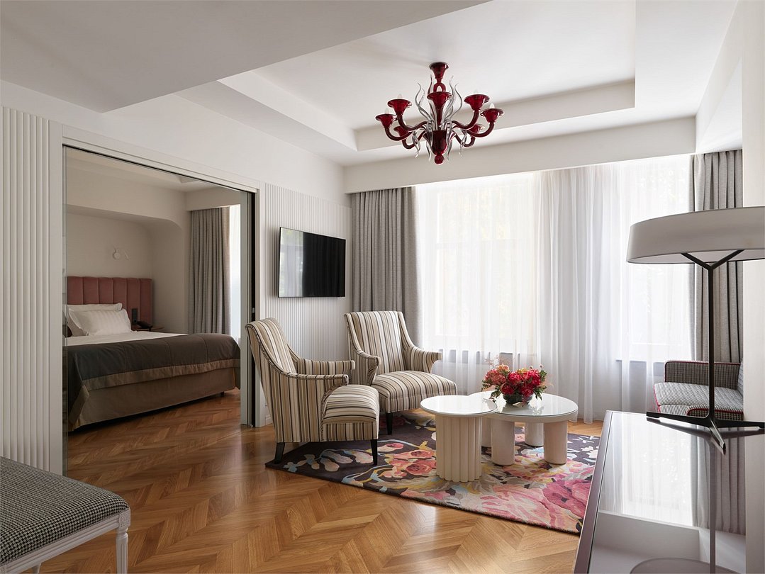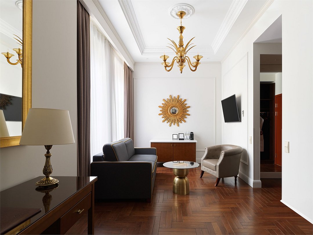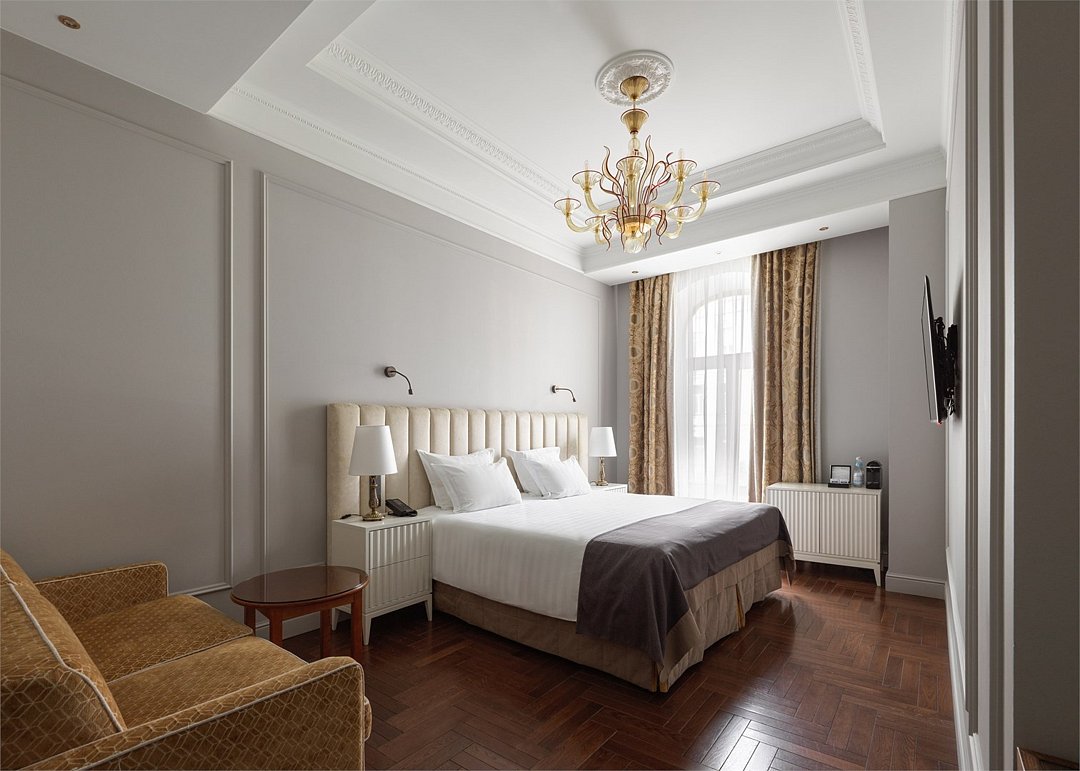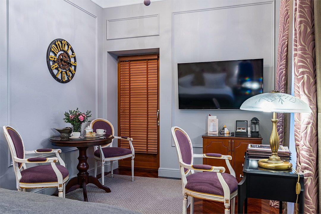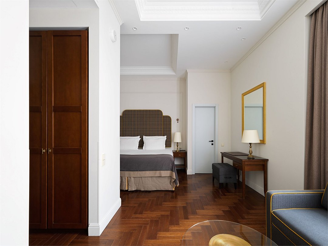 В отеле 4 номера данной категории. Площадь номера 40 кв.м. Номера выдержаны в классическом стиле с элементами современного дизайна, элегантно декорированы и предлагают прекрасные условия размещения. Роскошные люстры из муранского стекла — одна из ярких и индивидуальных деталей интерьера. Номер состоит из гостиной и спальной комнат, разделенных раздвижной стеклянной дверью. В гостиной — диван для отдыха с дополнительным спальным местом, а также уютная кухонная зона с набором необходимой посуды (есть номер без кухонной зоны) Каждый номер оснащён удобным рабочим столом и креслами. Ванная комната — с отделкой из натурального камня. Линейка косметических средств представлена маркой L’OCCITANE. Номера этой категории могут быть объединены с номером Классической категории. В номере возможна полная синхронизация телевизора с гаджетами (Android и IOS). Гостям предлагается завтрак шведский стол в ресторане Мариус в будние дни с 7.00 до 10.30, в выходные с 7.00 до 11.00. Все номера в отеле для некурящих.Услуги и удобства