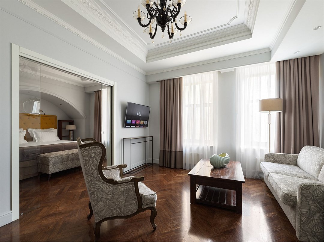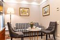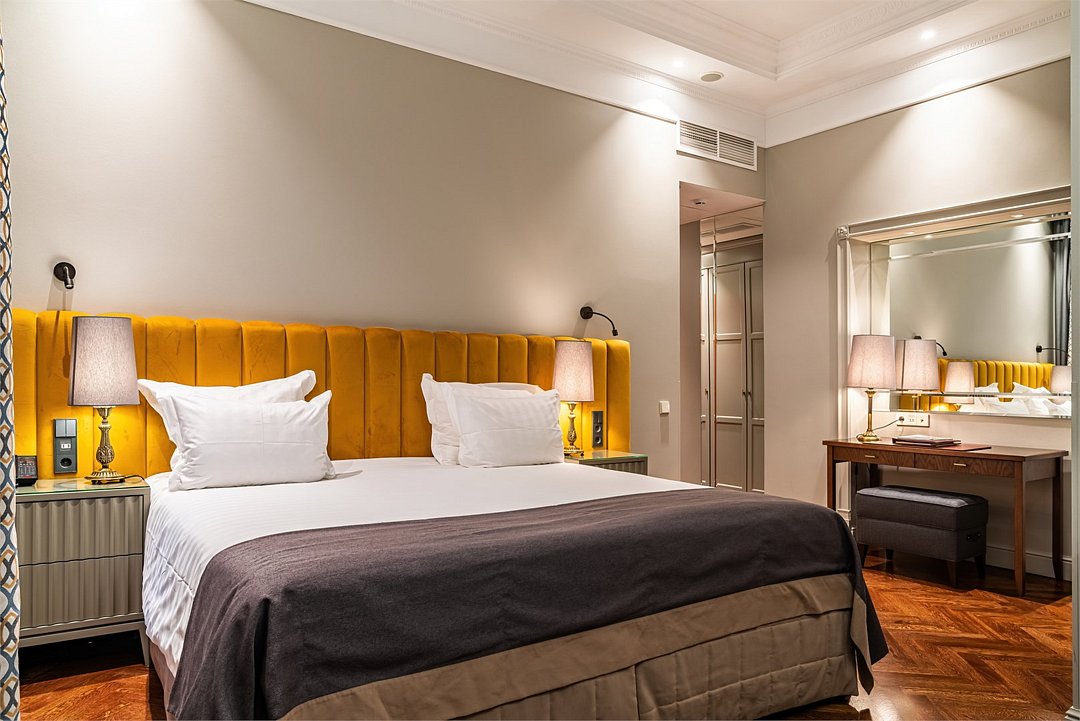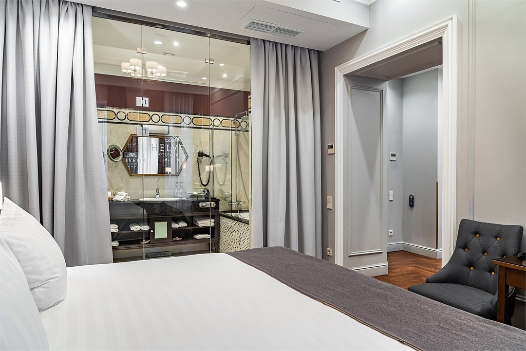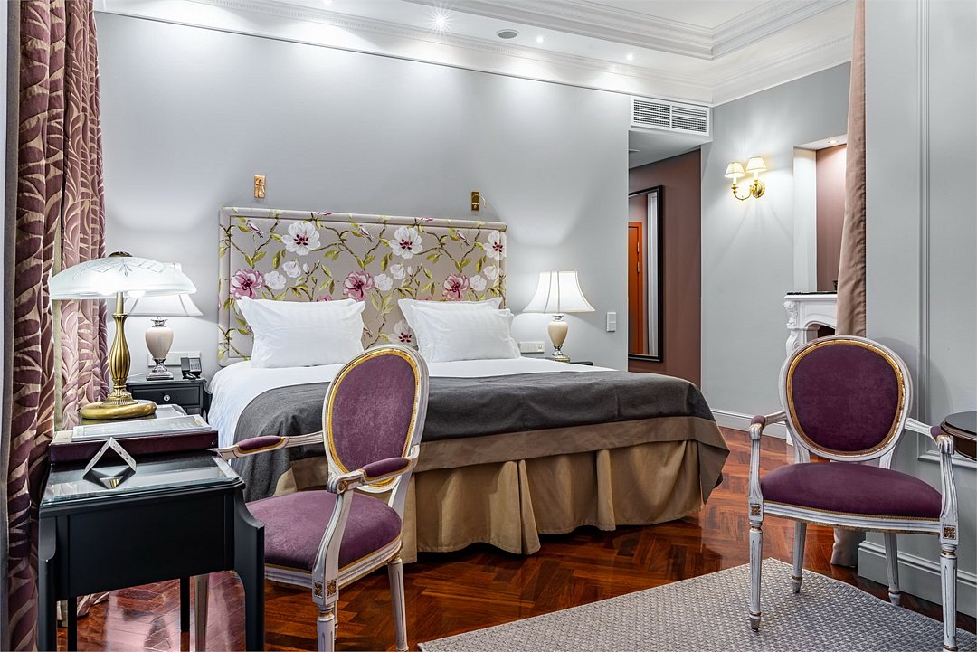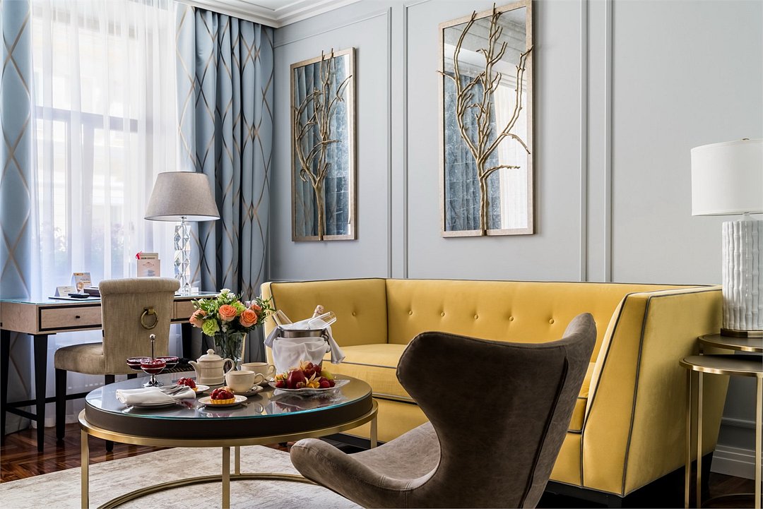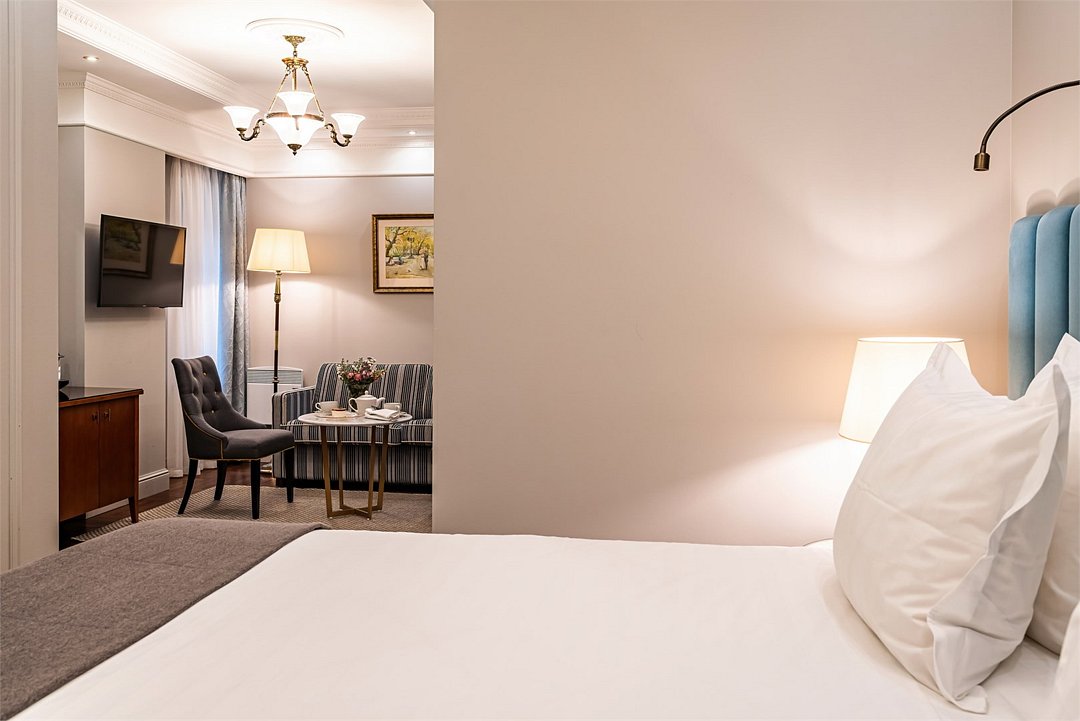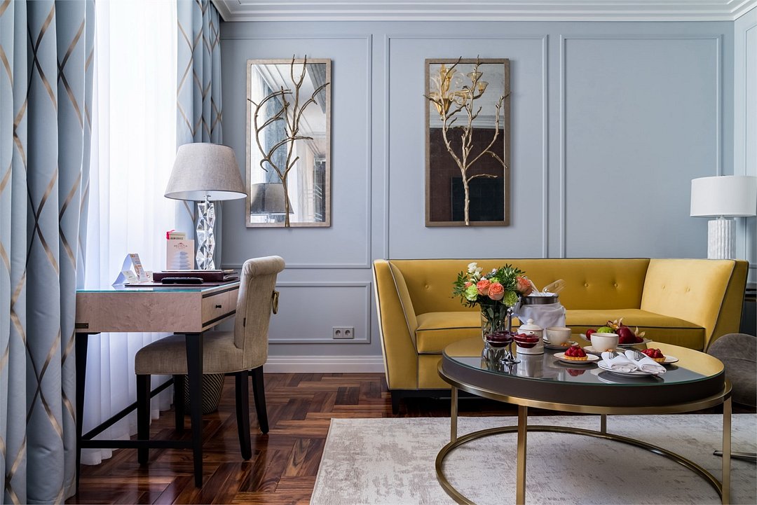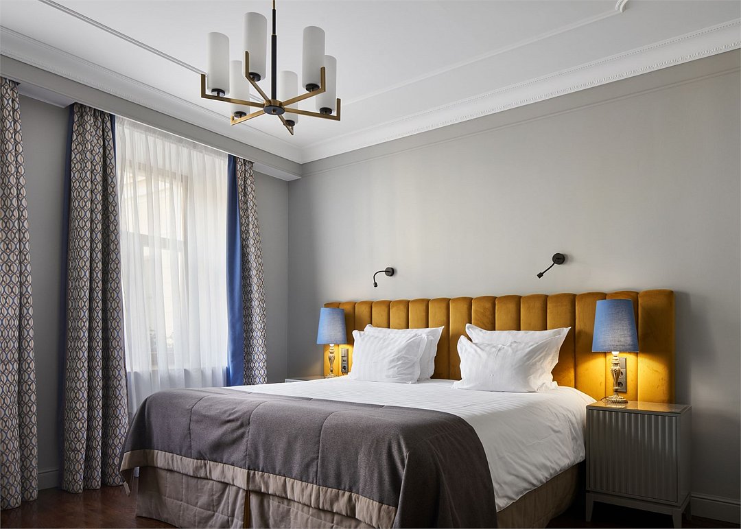 В отеле 4 номера данной категории. Площадь номера 40 кв.м. Номера выдержаны в классическом стиле с элементами современного дизайна, элегантно декорированы и предлагают прекрасные условия размещения. Роскошные люстры из муранского стекла — одна из ярких и индивидуальных деталей интерьера. Номер состоит из гостиной и спальной комнат, разделенных раздвижной стеклянной дверью. В гостиной — диван для отдыха с дополнительным спальным местом, а также уютная кухонная зона с набором необходимой посуды (есть номер без кухонной зоны) Каждый номер оснащён удобным рабочим столом и креслами. Ванная комната — с отделкой из натурального камня. Линейка косметических средств представлена маркой L’OCCITANE. Номера этой категории могут быть объединены с номером Классической категории. В номере возможна полная синхронизация телевизора с гаджетами (Android и IOS). Гостям предлагается завтрак шведский стол в ресторане Мариус в будние дни с 7.00 до 10.30, в выходные с 7.00 до 11.00. Все номера в отеле для некурящих.Услуги и удобства